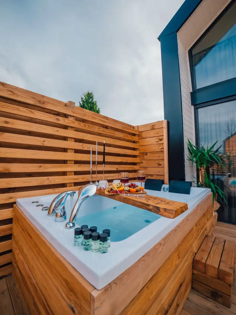 Dış alanında ise konukları özel ısıtmalı havuz ve açık alan jakuzisi karşılar. Özellikle soğuk mevsimlerde aktif olan sıcak havuz sistemi sayesinde dört mevsim keyifli bir konaklama mümkündür. Tamamen korunaklı müstakil bahçeye sahip olması, misafirlerin özel alanlarında rahatça vakit geçirmelerini sağlar.