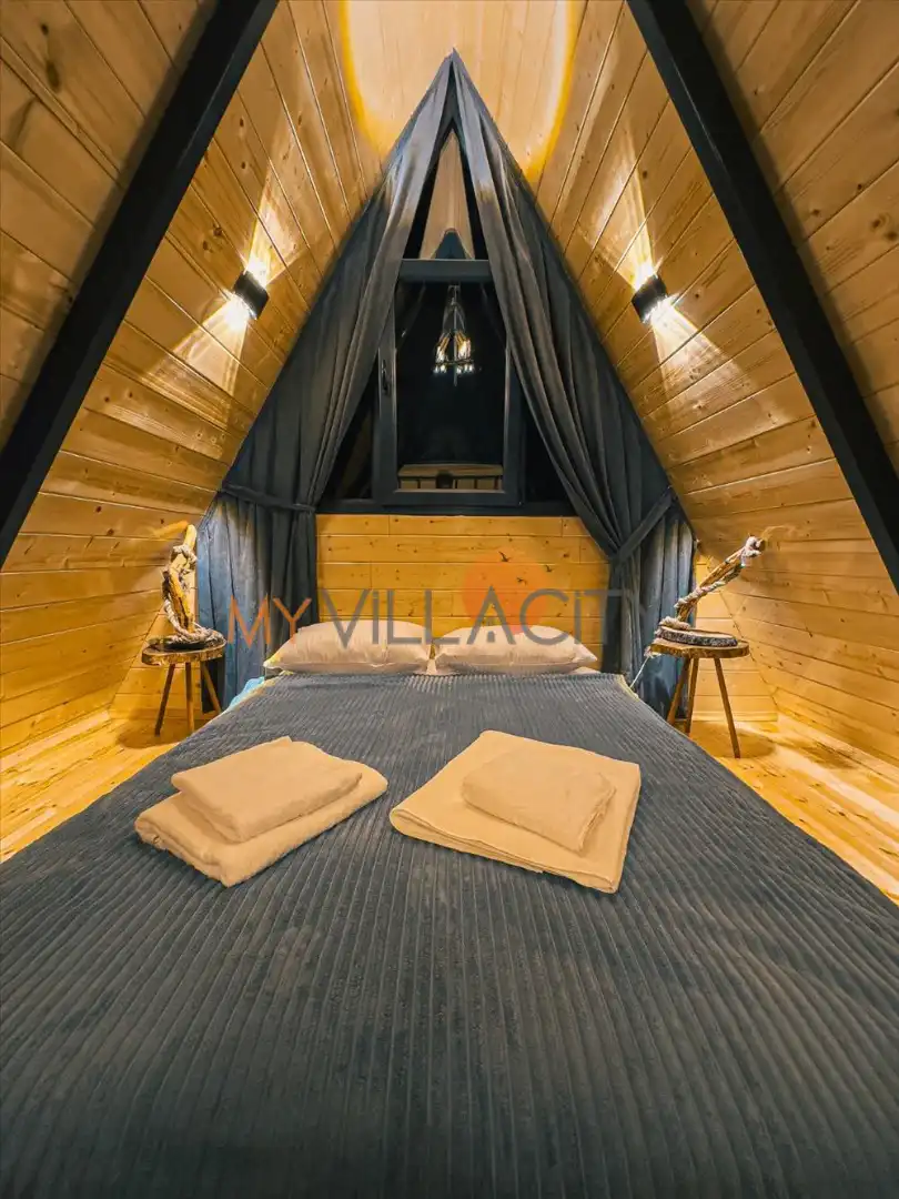 2 kişilik kapasitesiyle, sakin ve romantik bir kaçamak arayan misafirler için ideal bir atmosfere sahiptir. İç mekanda çift kişilik yatak, açılabilir köşe koltuk, WiFi, TV, Netflix, mutfak (ocak mevcut) ve klima gibi konfor detayları yer alır. Bu sayede ister dinlenebilir, ister yemeklerinizi kendiniz hazırlayarak ev sıcaklığını hissedebilirsiniz.