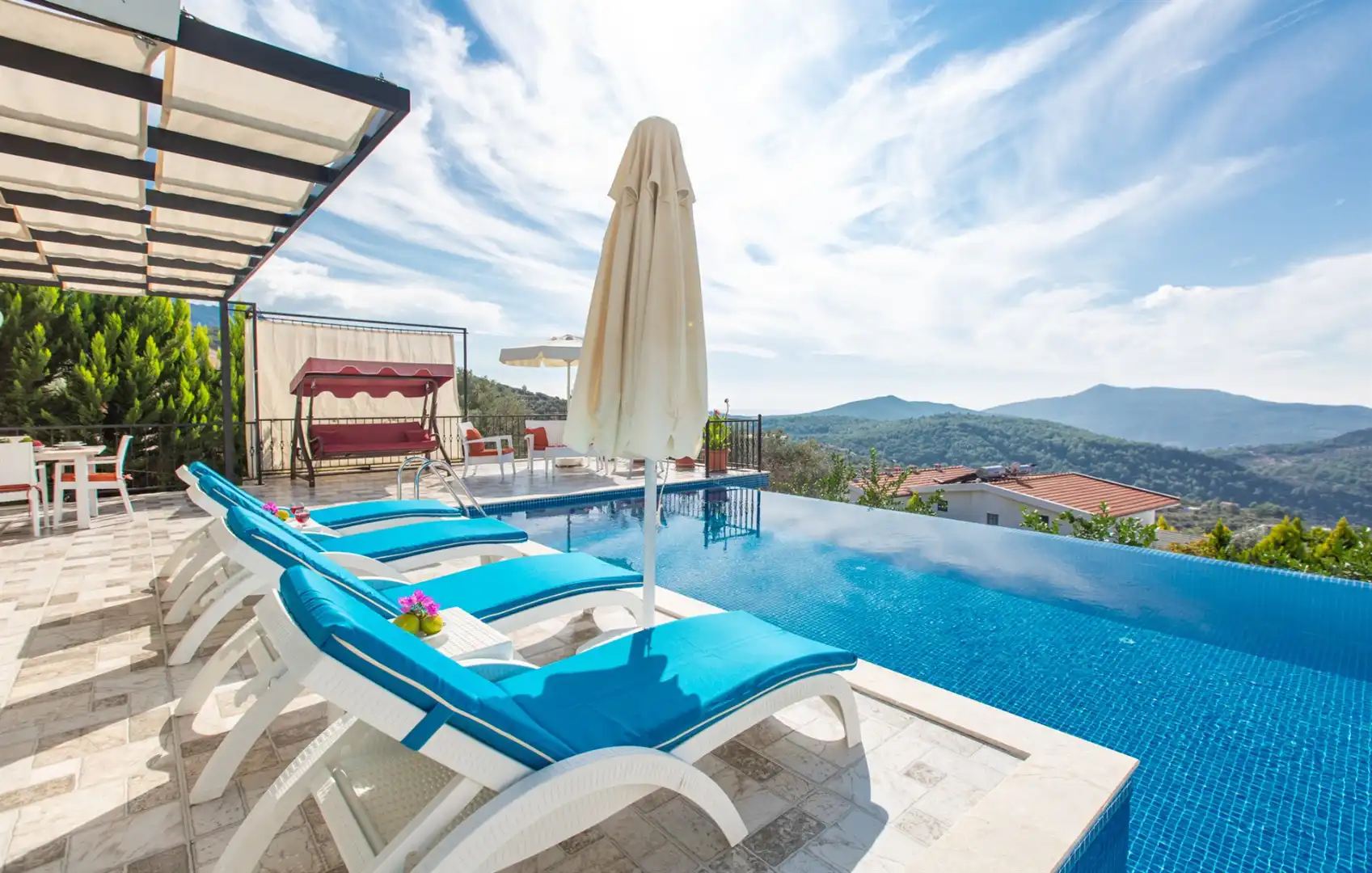 Villa Eslem Üzümlü , Kalkan'ın Eslem bölgesinde yer alan 3 yatak odası ile 5 kişi kapasiteye sahip tatil villamızdır. İçerisinde jakuzisi bulunan villamızın aynı zamanda havuz bölgesi dışarıdan görünmemekte ve muhafazakâr bir yapıya sahip olmaktadır. Ayrıca lüks ve konforlu eşyalarla dizayn edilmiş olan villamız eğlenceli zamanlar geçirebileceğiniz ortamı ve rahatı sunacaktır. Geniş aileler ve kalabalık arkadaş grupları ve çekirdek ailelerimiz için ideal olan villamız memnun kalacağınız seçeneklerimizdendir.