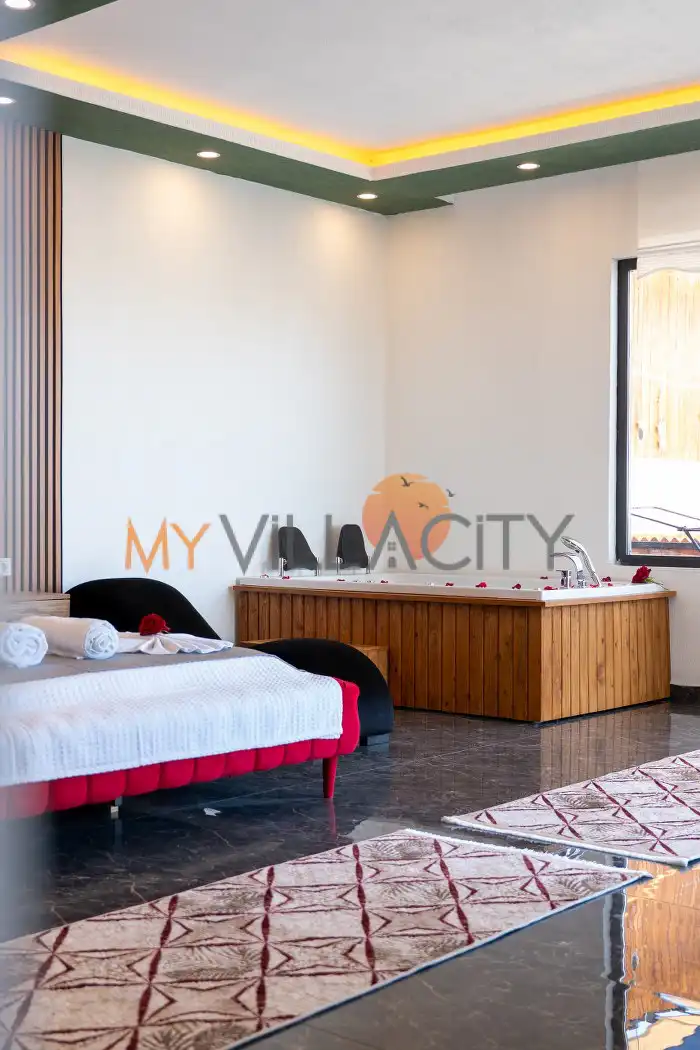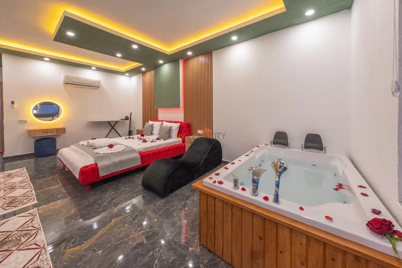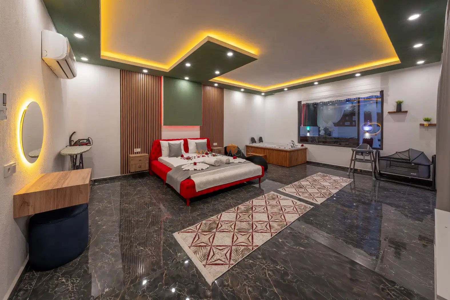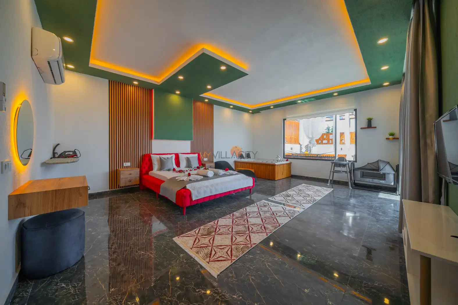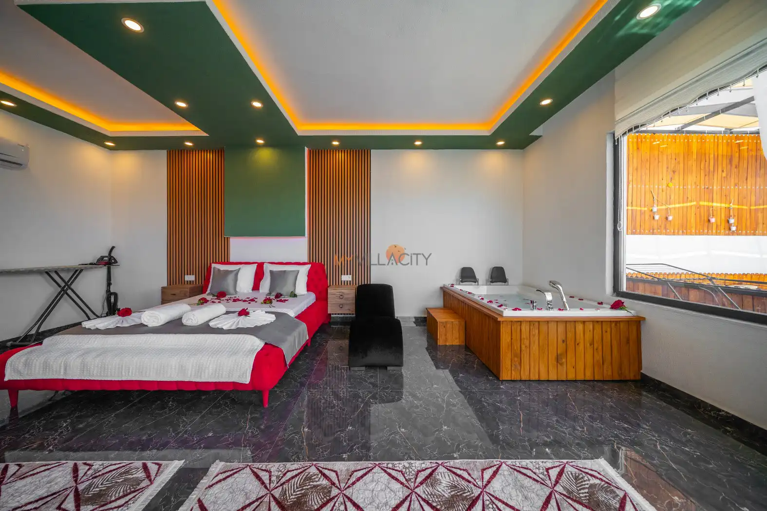 - 1 Çift Kişilik Yatak, 1 Jakuzi, 1 Banyo/WC, 2 Komodin, Elbise dolabı, Makyaj Masası, Klima,