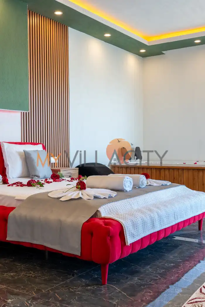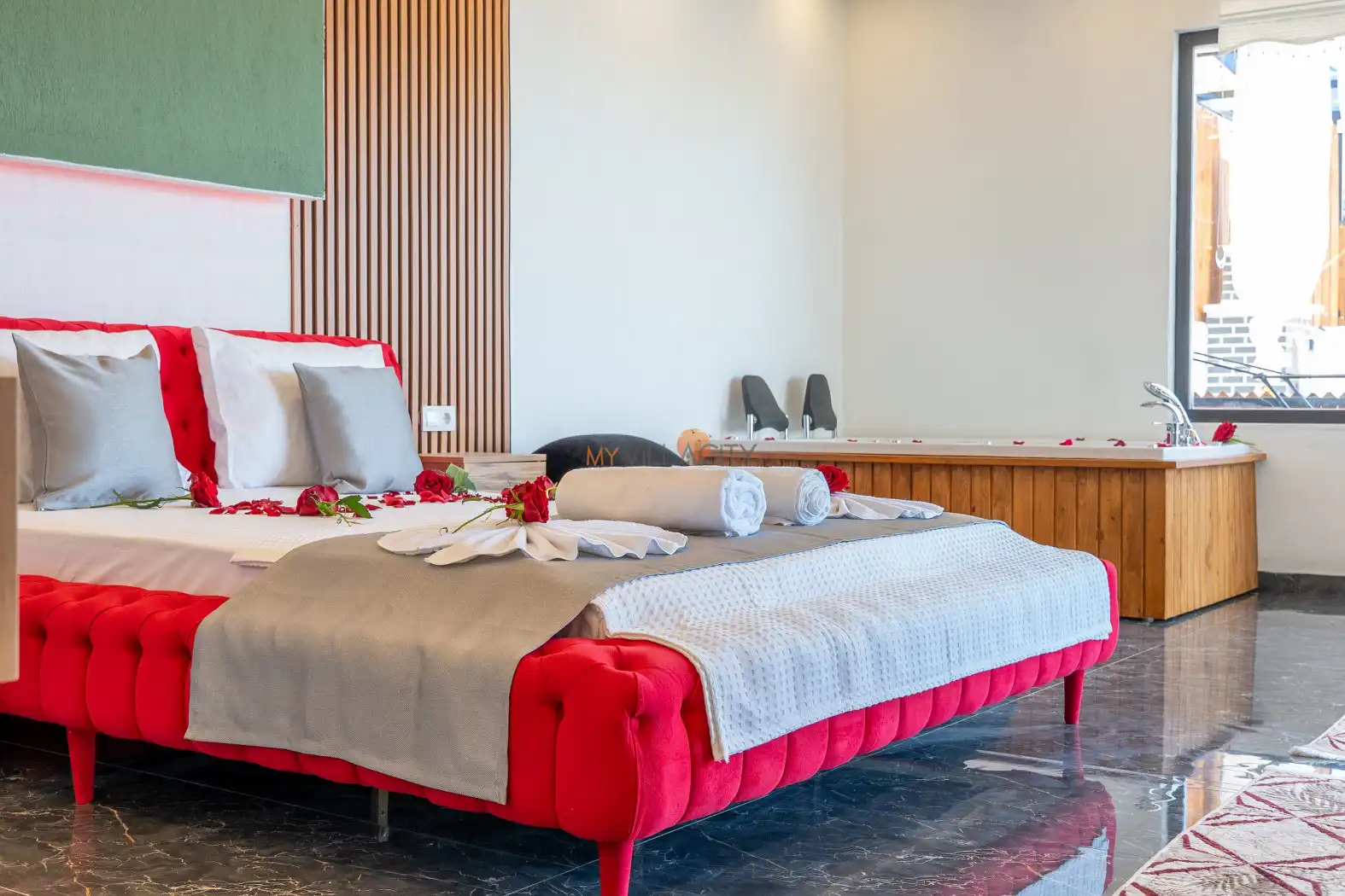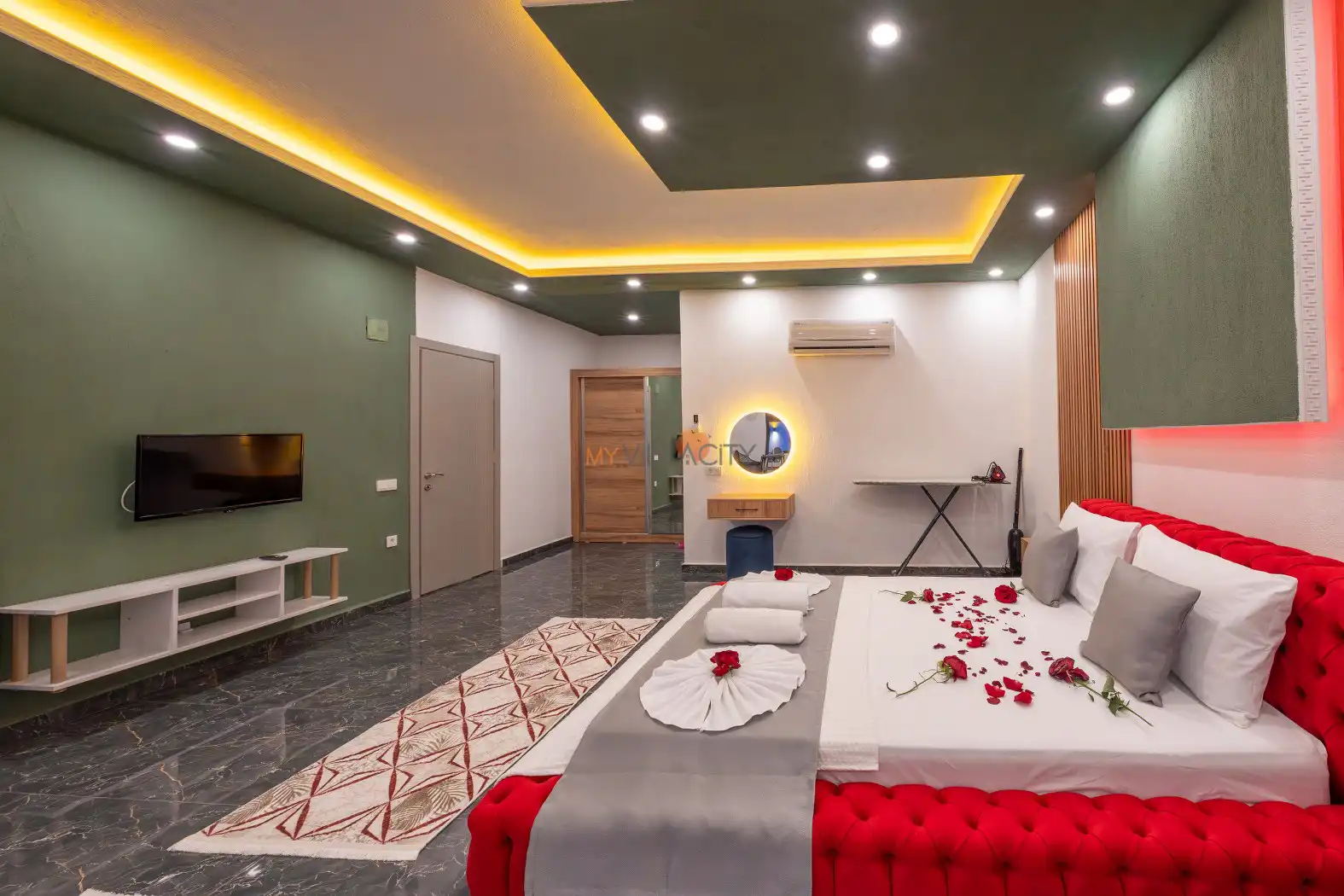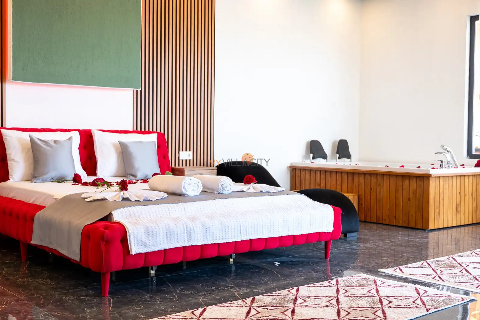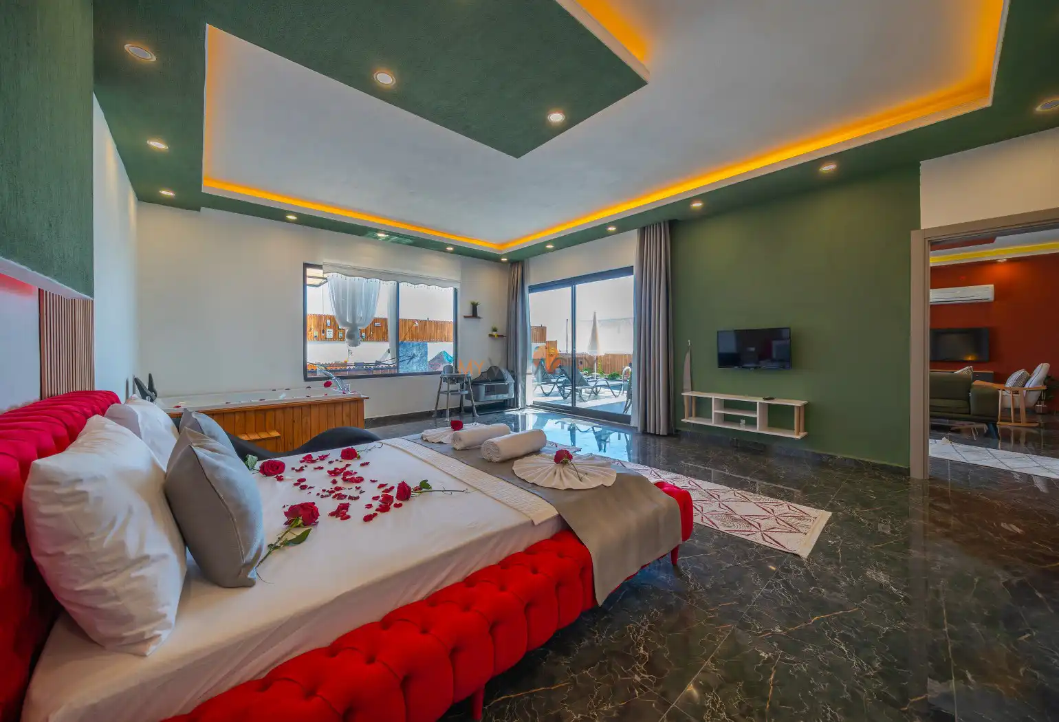 - 1 Çift Kişilik Yatak, 1 Jakuzi, 1 Banyo/WC, 2 Komodin, Elbise dolabı, Makyaj Masası, Klima,