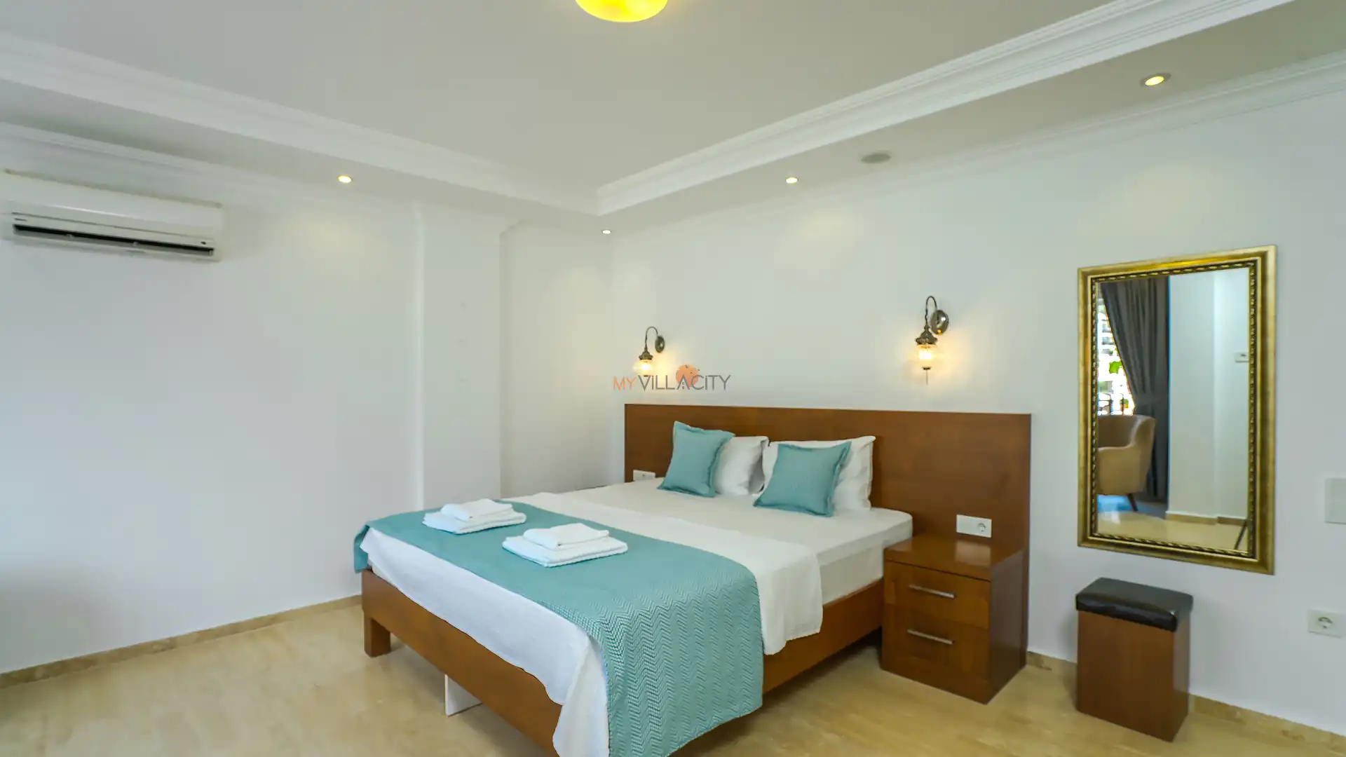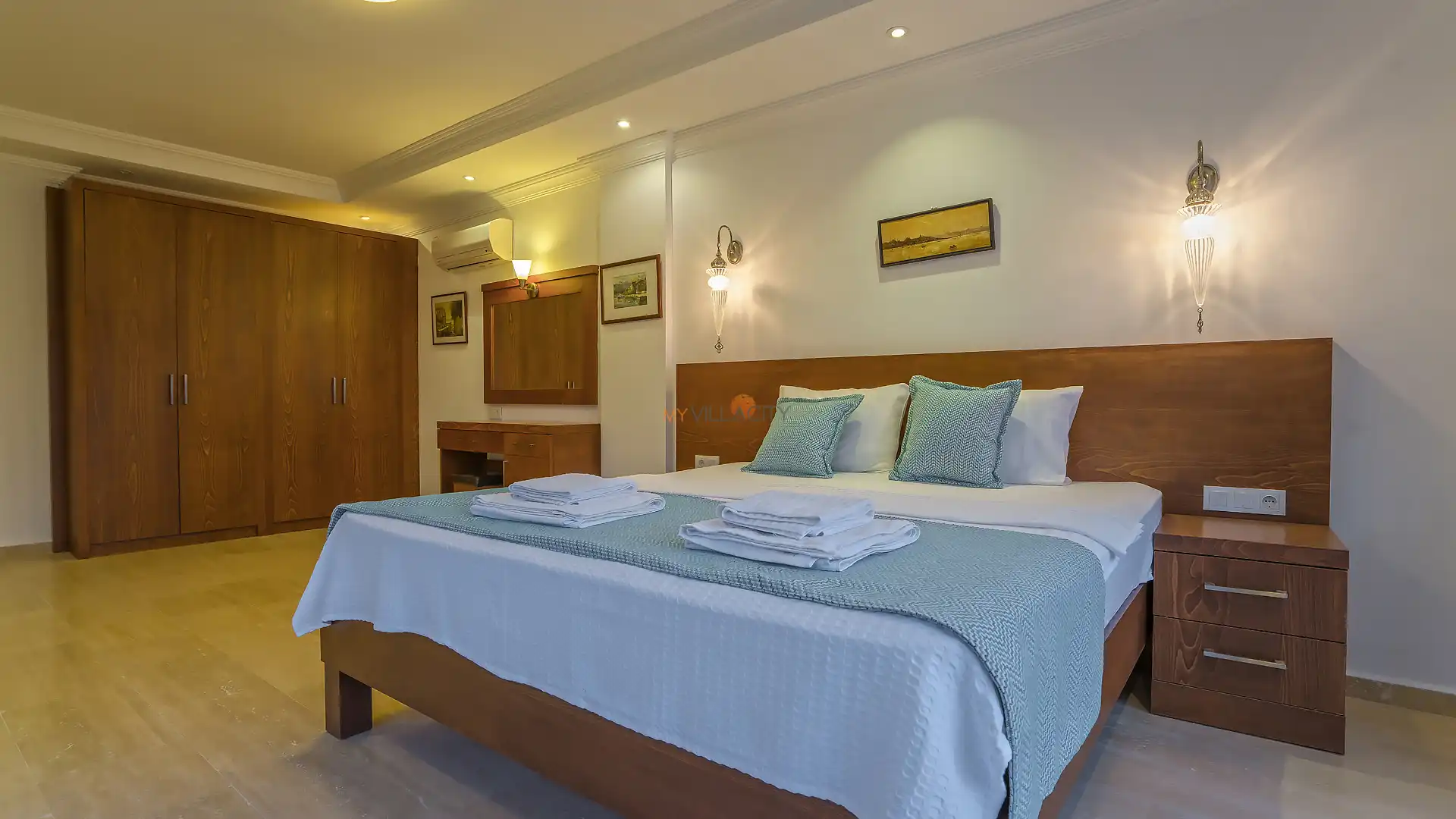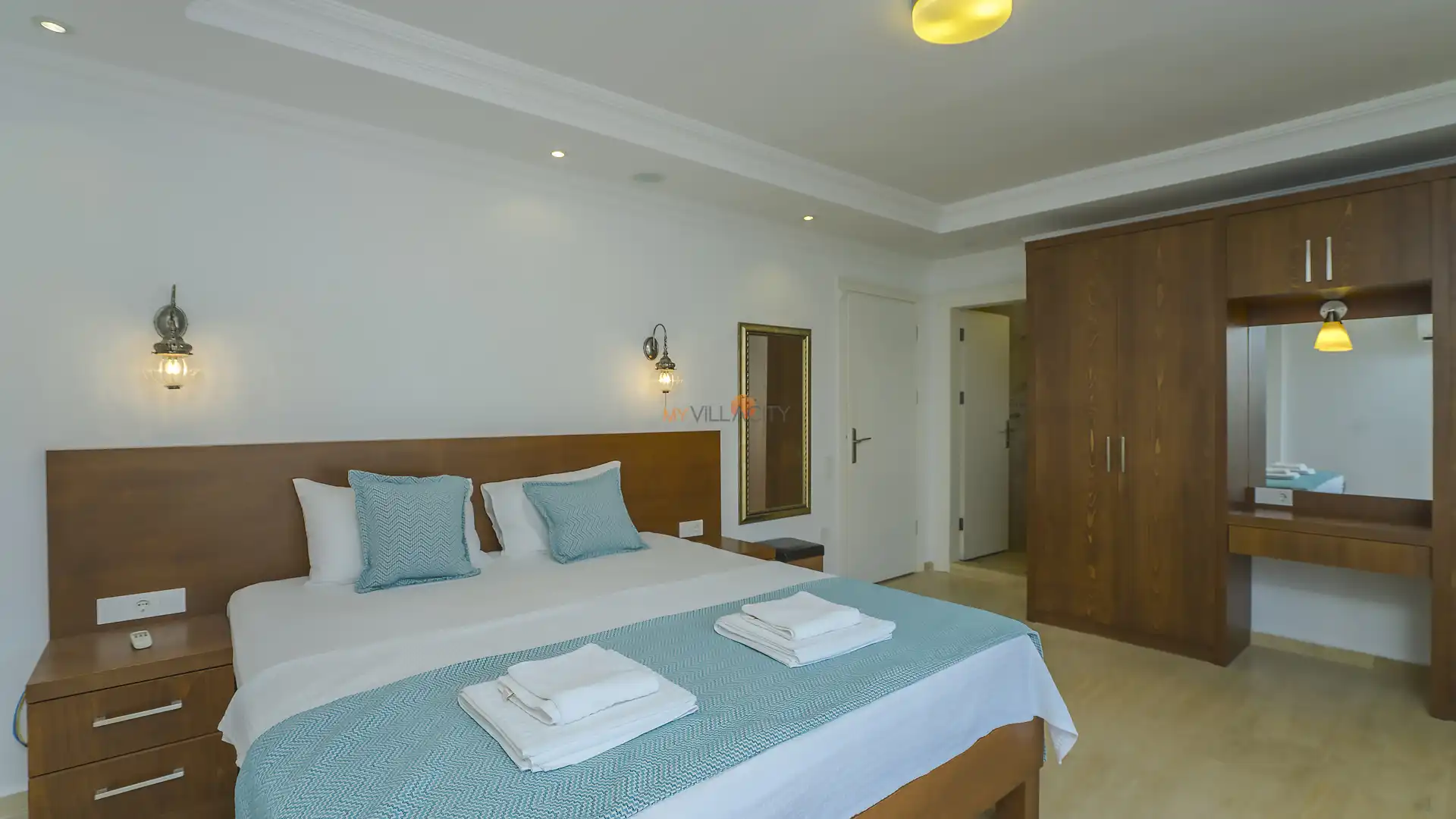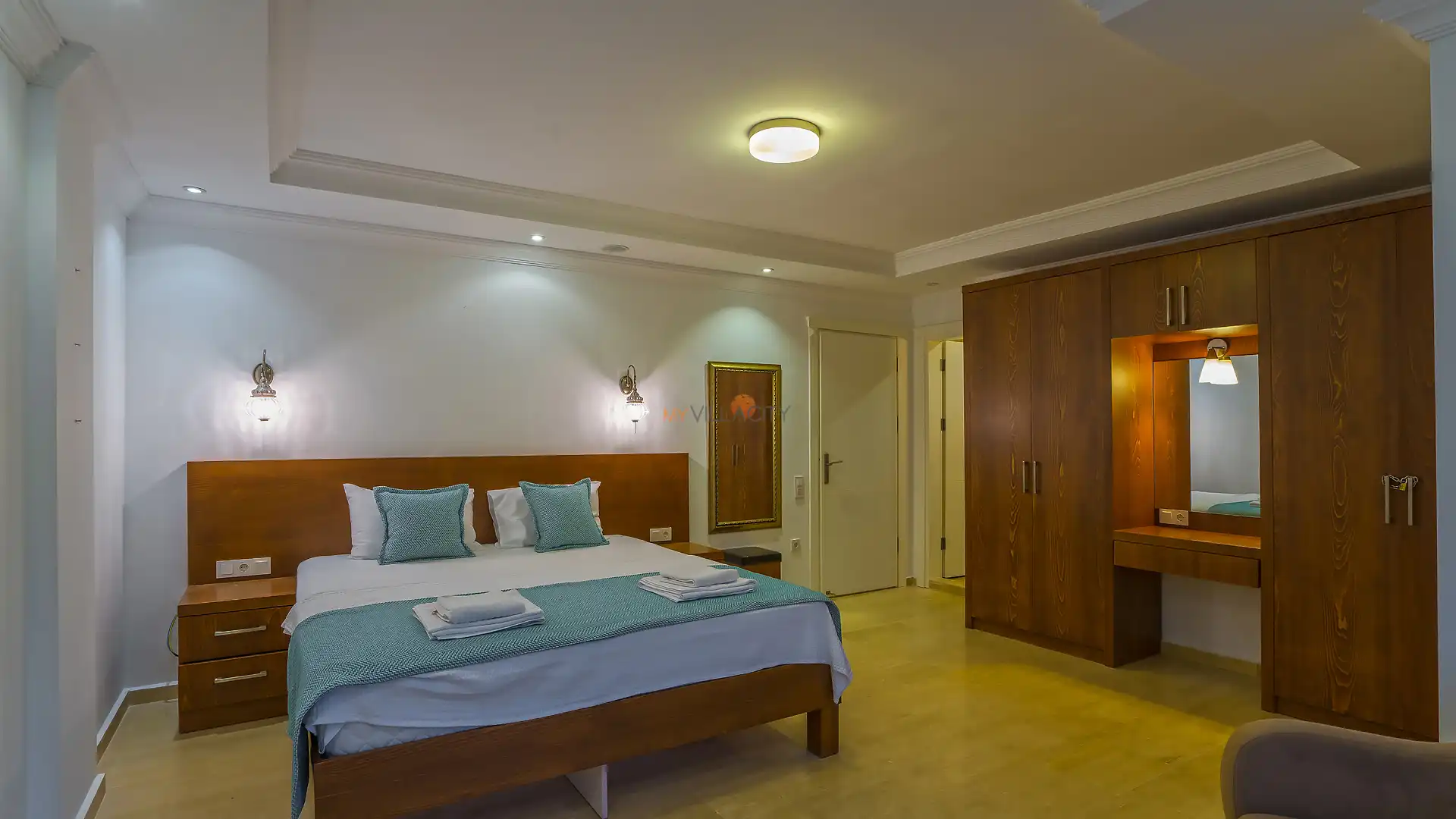 1 Çift Kişilik Yatak, 1 Banyo/WC, 2 Komodin, Elbise dolabı, Makyaj Masası, Klima,