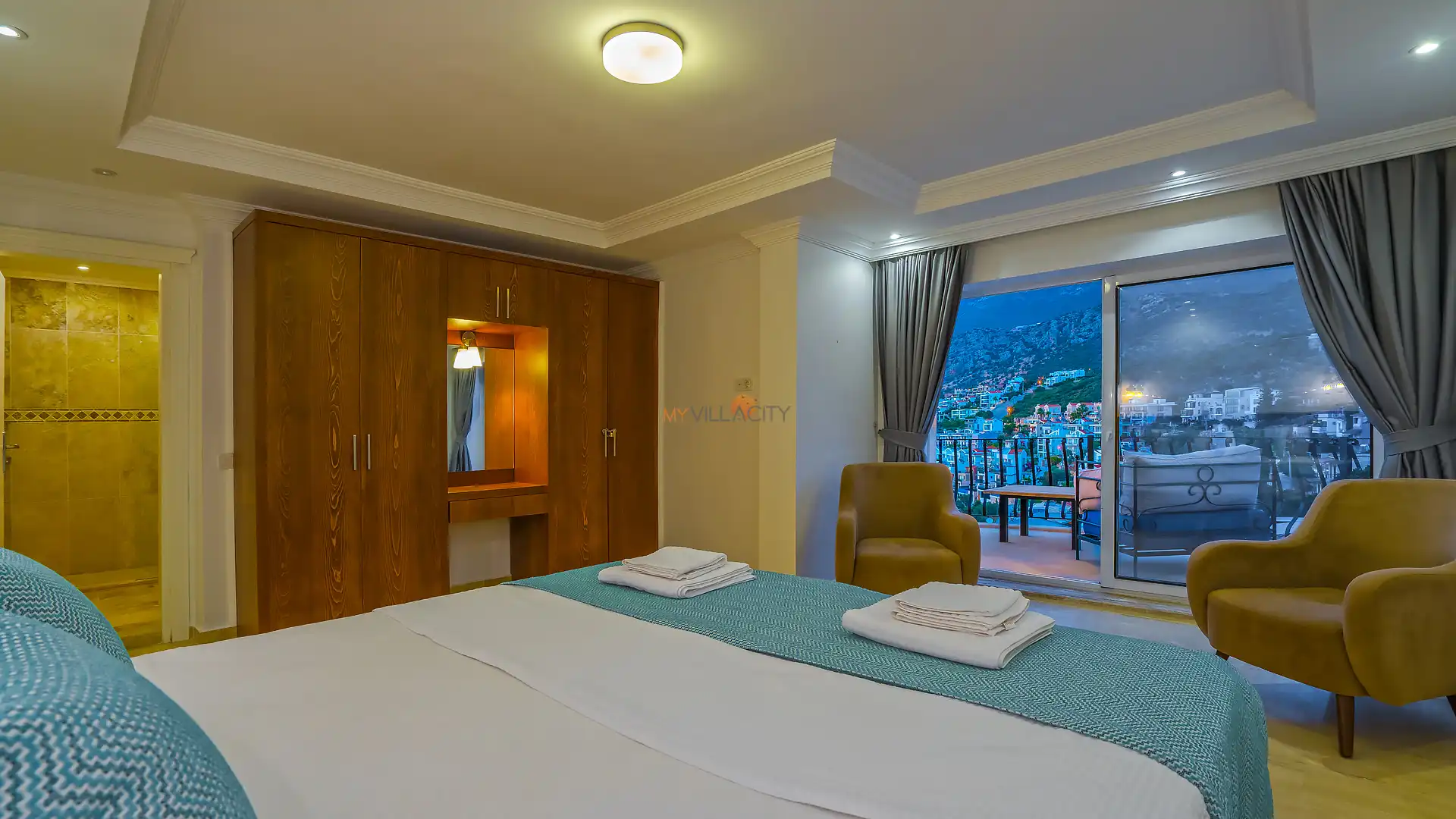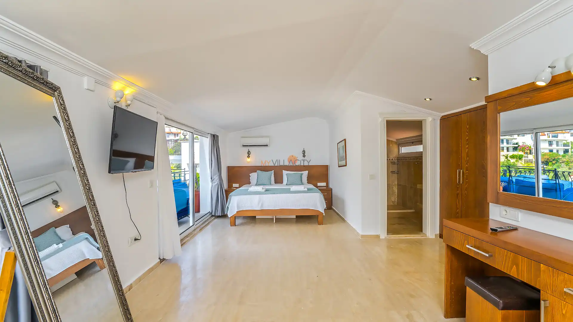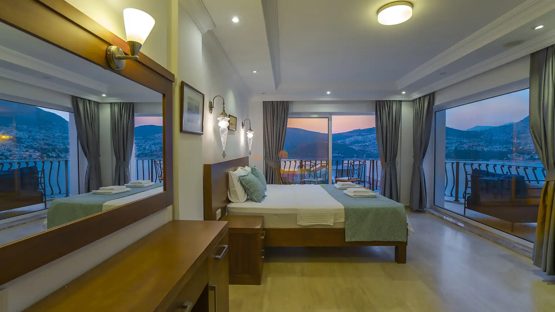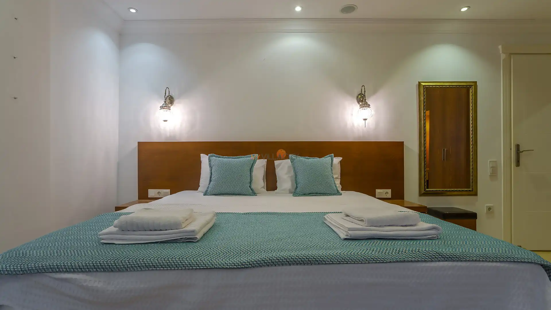 1 Çift Kişilik Yatak, 1 Banyo/WC, 2 Komodin, Elbise dolabı, Makyaj Masası, Klima,