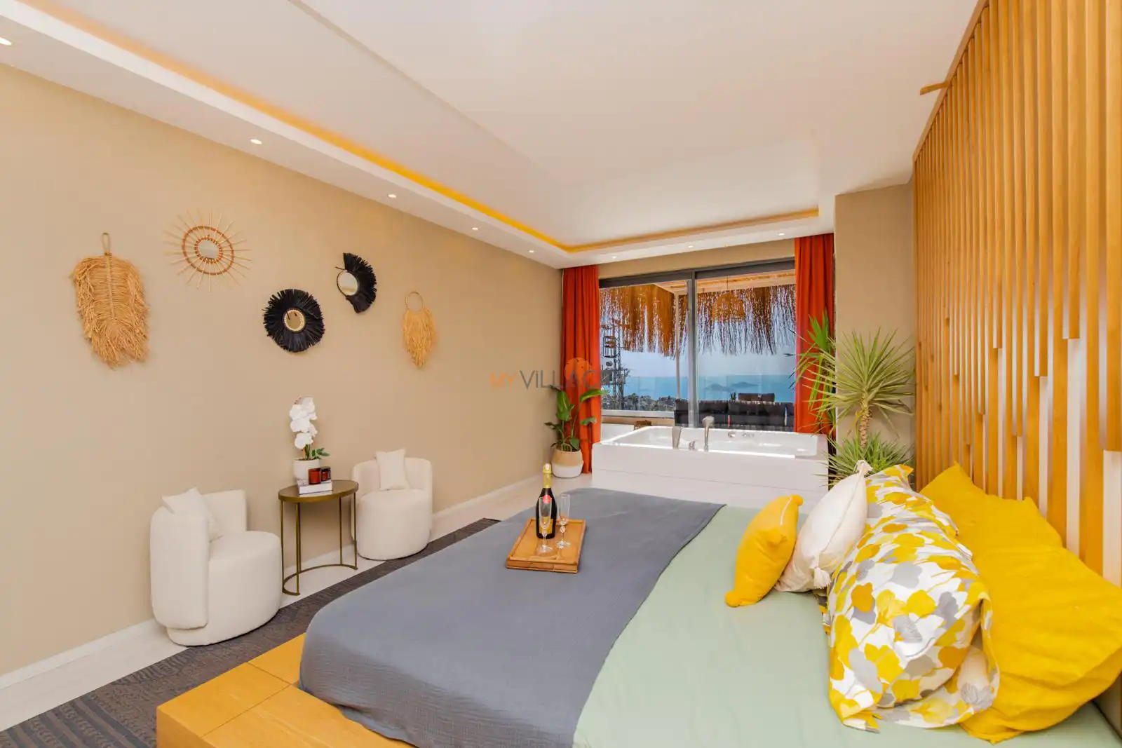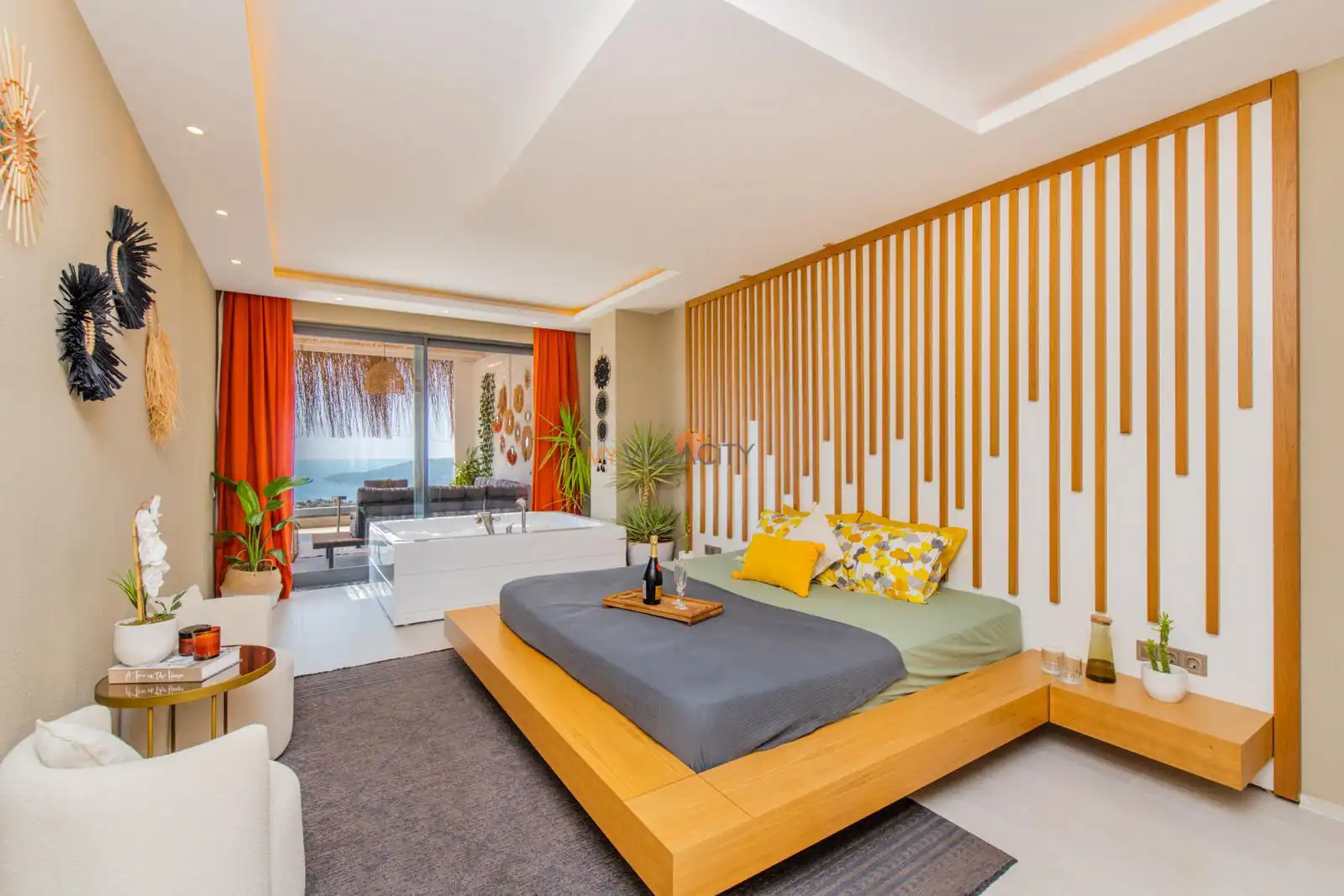 - 1 Çift Kişilik Yatak, 1 Jakuzi, 1 Banyo/WC, 2 Komodin, Elbise dolabı, Makyaj Masası, Klima,