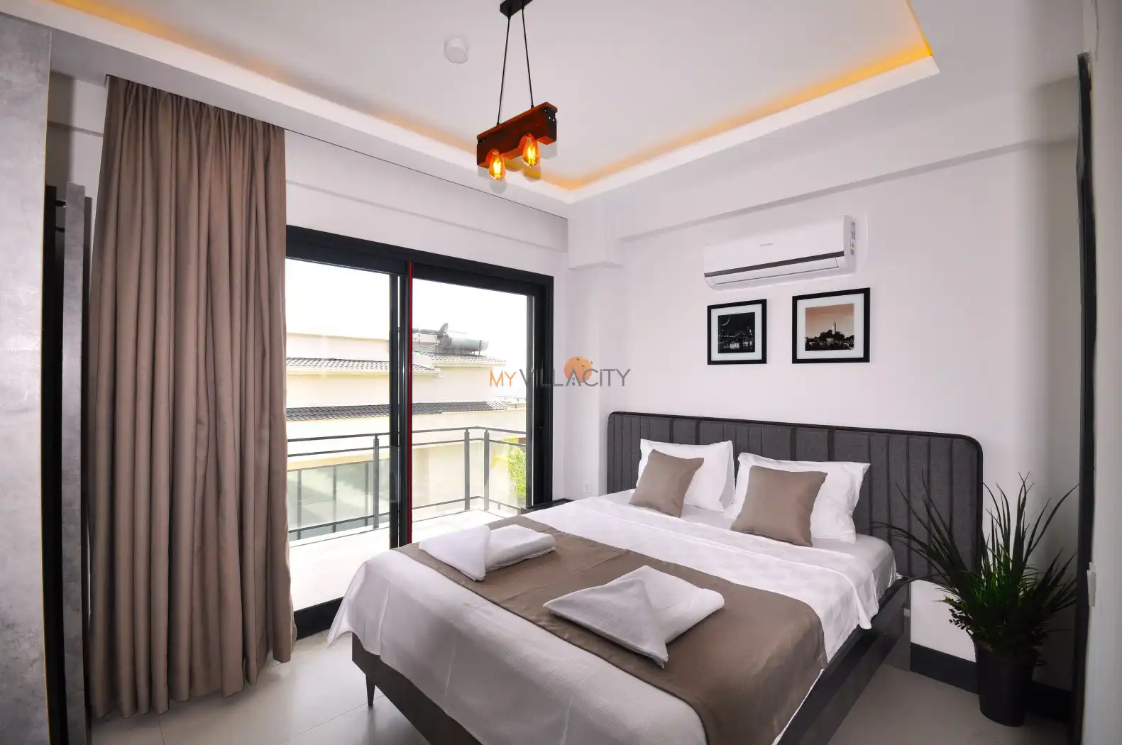 - 1 Çift Kişilik Yatak, 1 Banyo/WC, 2 Komodin, Elbise dolabı, Makyaj Masası, Klima,