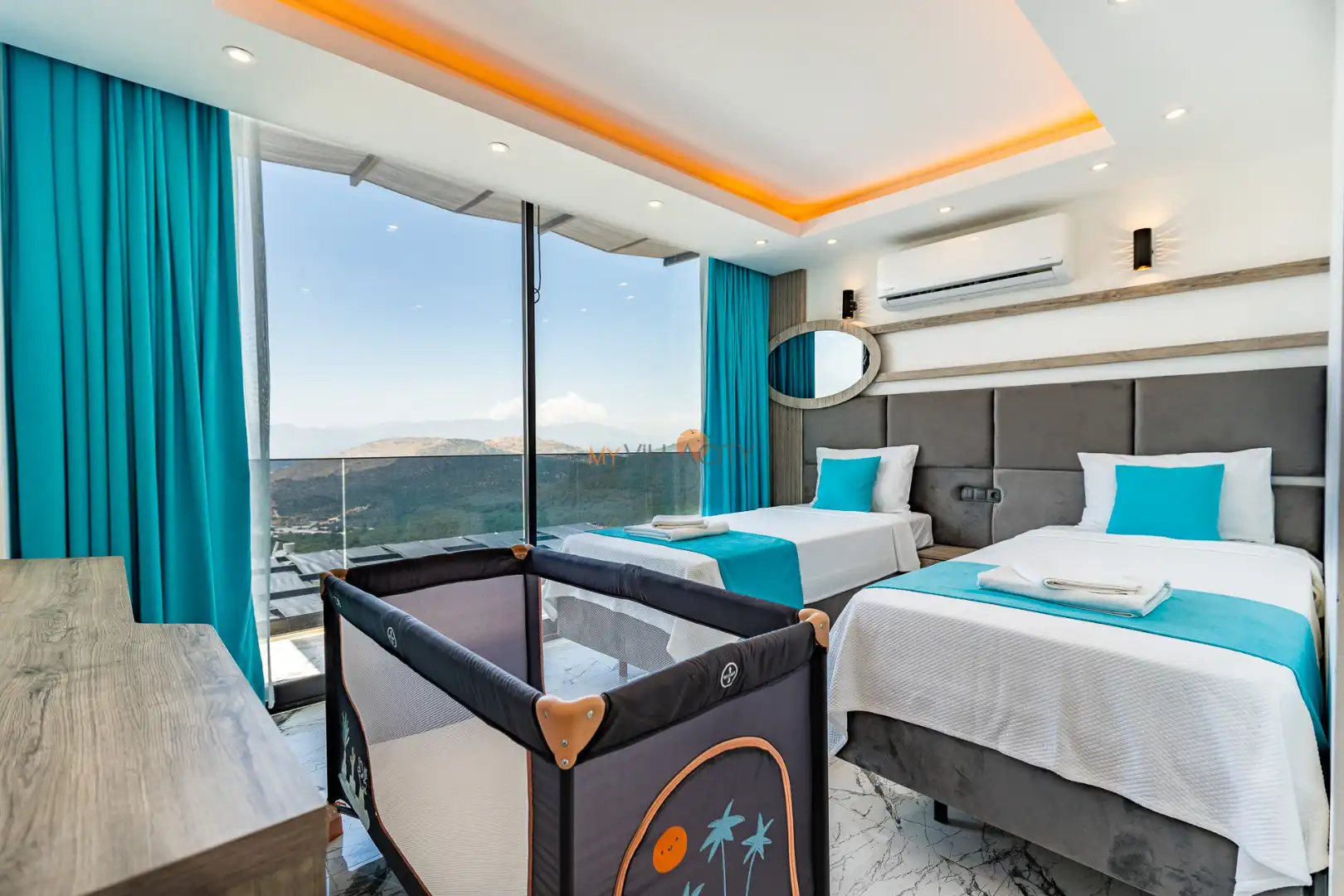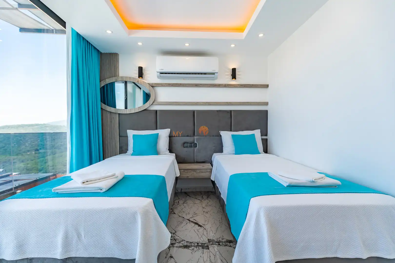 - 2 Tek Kişilik Yatak, 1 Banyo/WC, 2 Komodin, Elbise dolabı, Makyaj Masası, Klima,