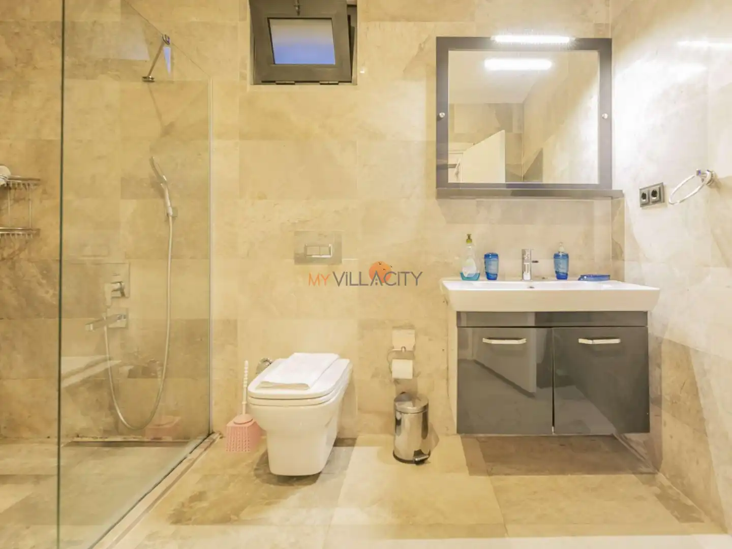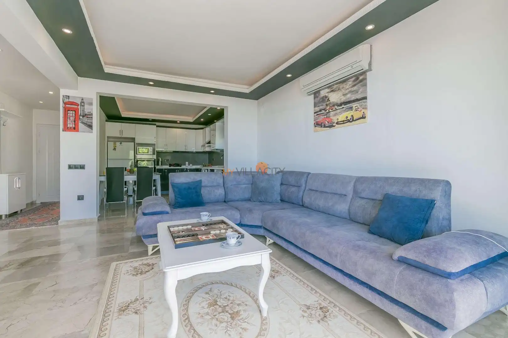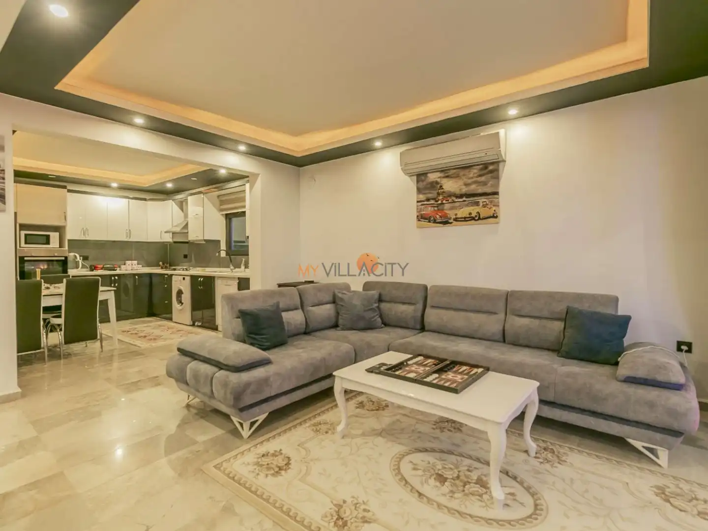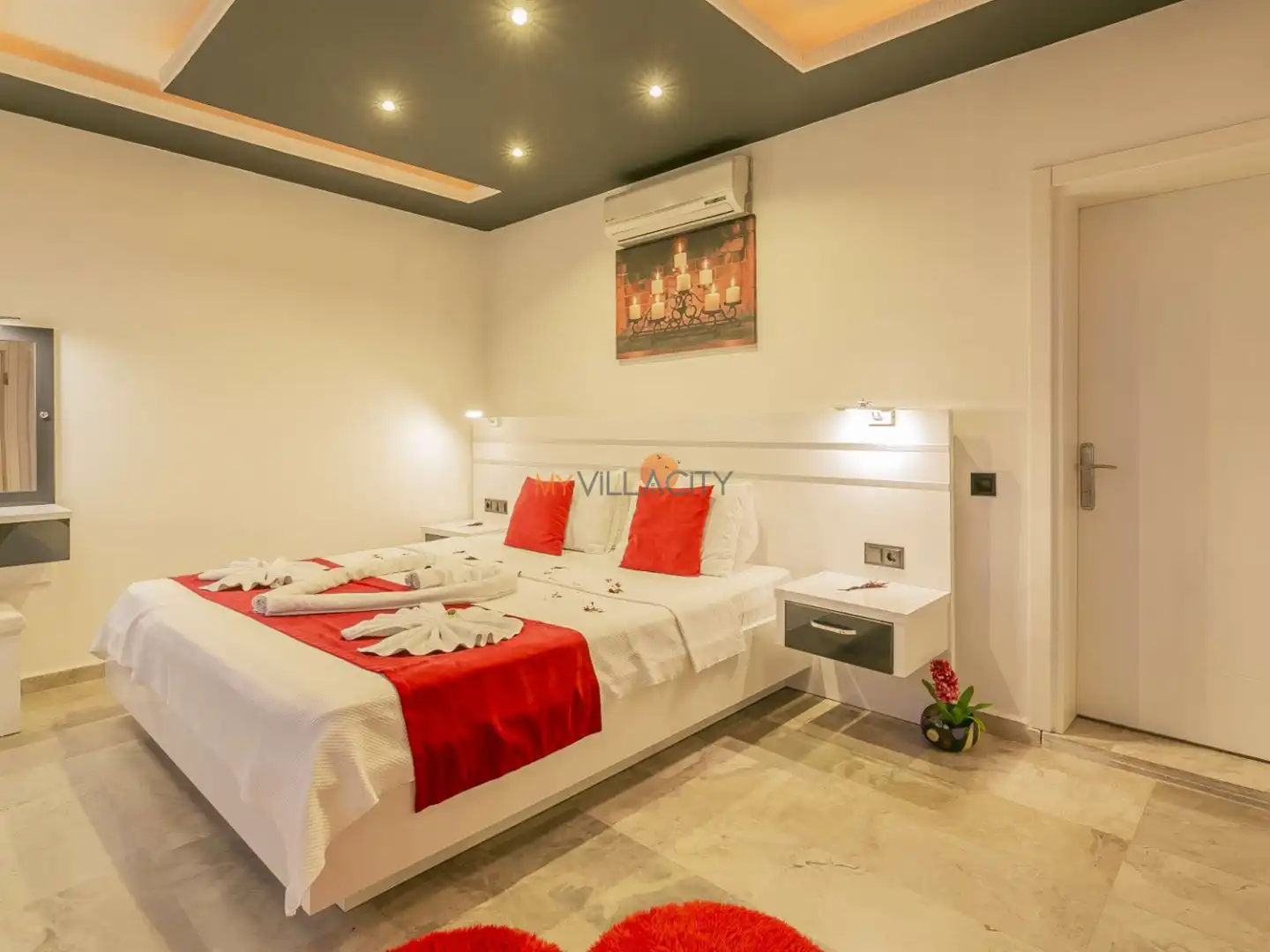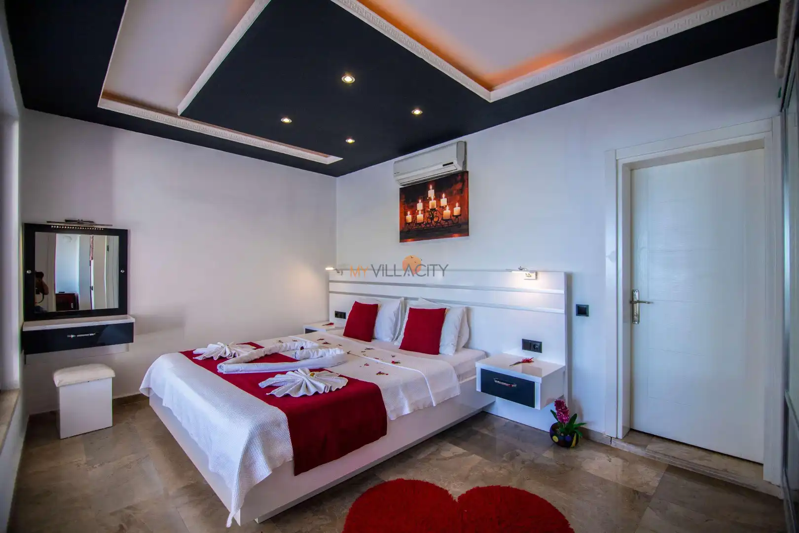 - 1 Çift Kişilik Yatak, 1 Banyo/WC, 2 Komodin, Elbise dolabı, Makyaj Masası, Klima,