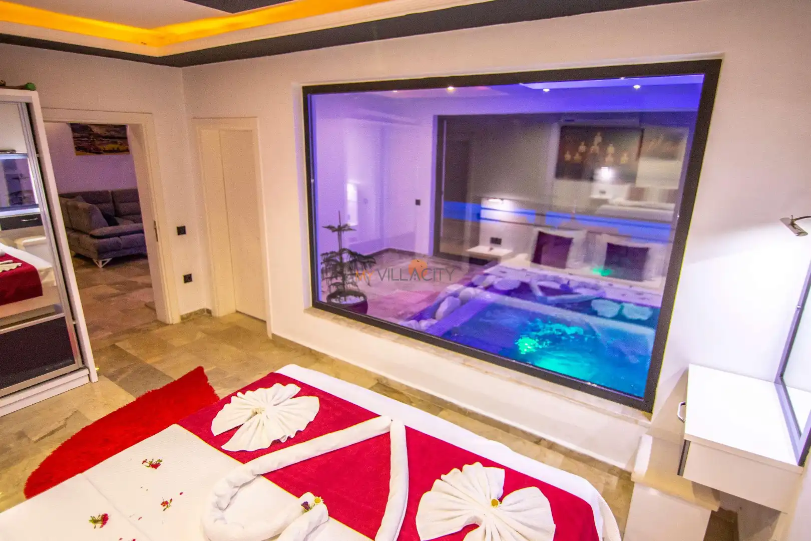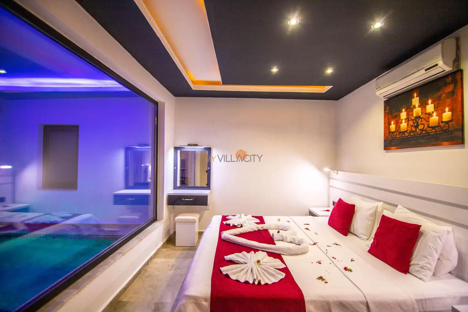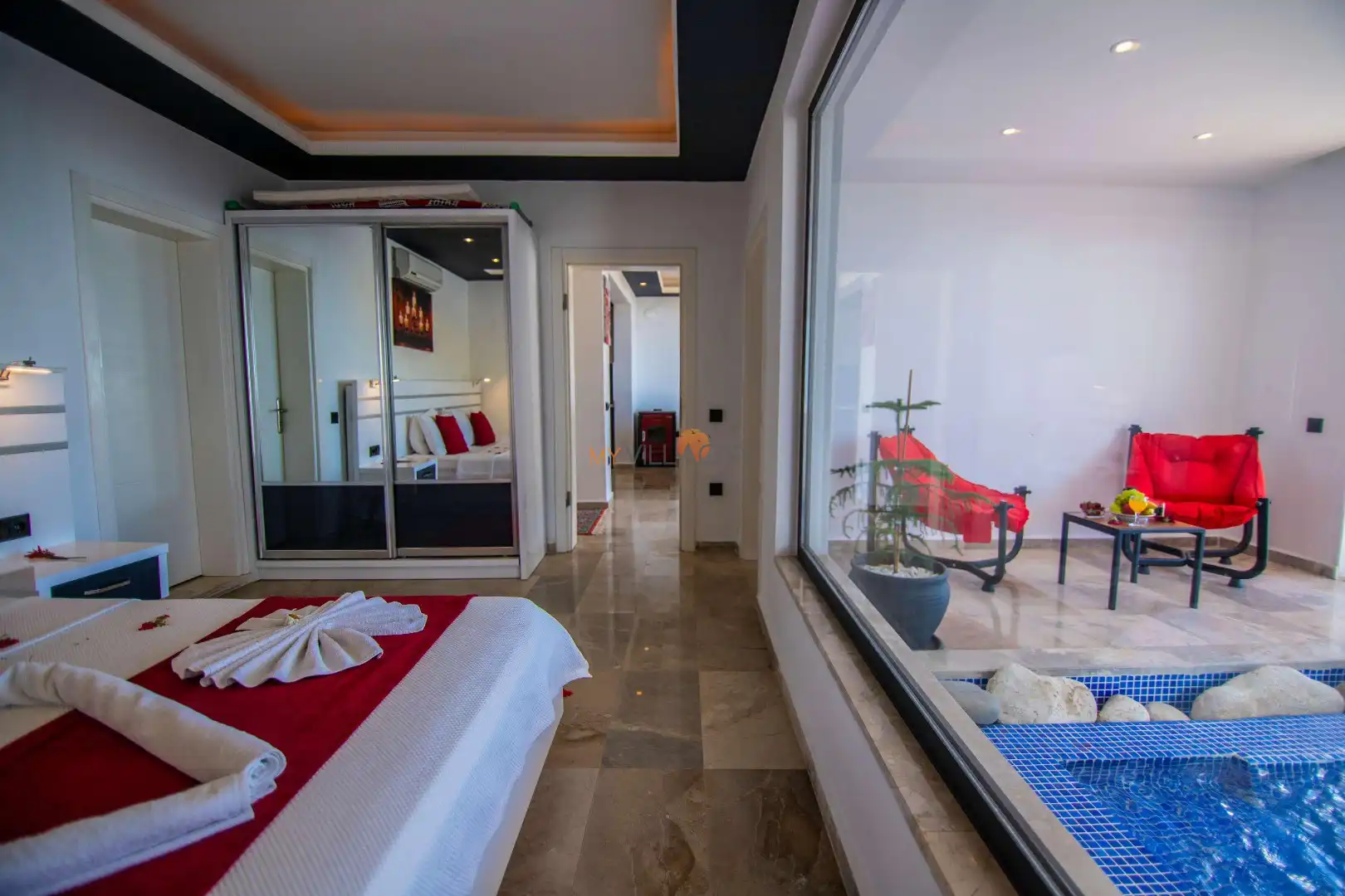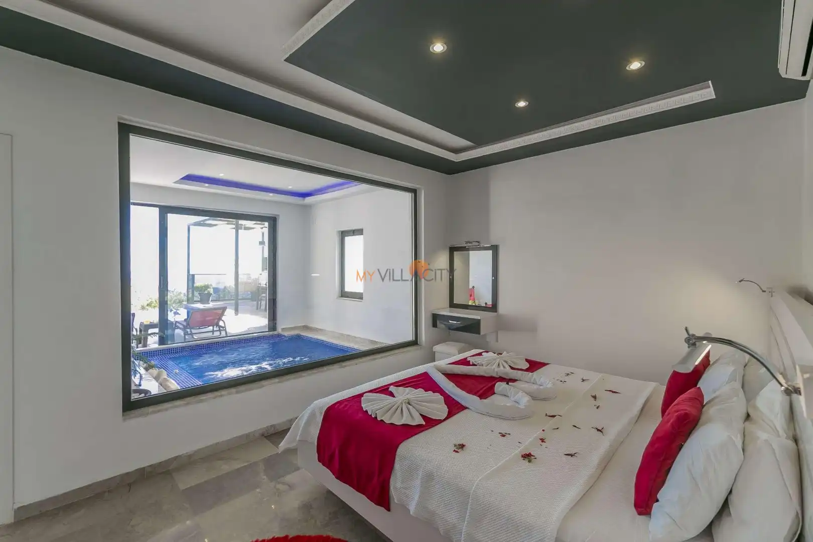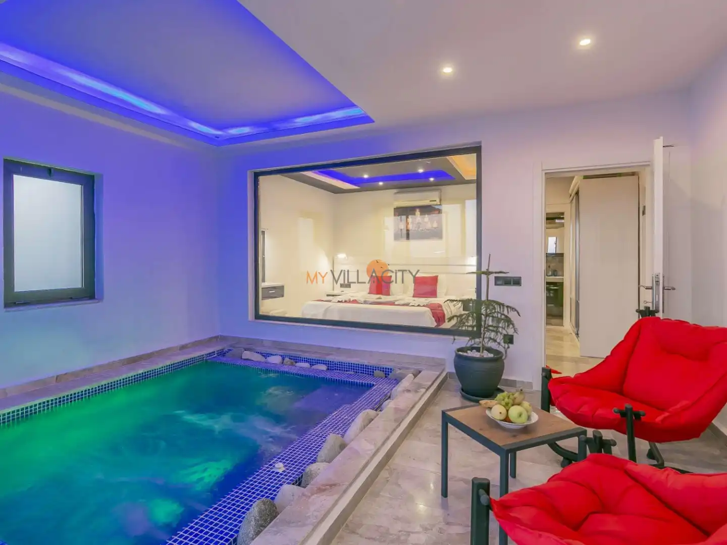 Tek yatak odasına sahip olan villada, çift kişilik yatak yer almakta olup konfor ön planda tutulmuştur. Yatak odasında bulunan jakuzi, tatilinize romantik bir dokunuş katarken; jakuzili havuz alanı ile benzersiz bir deneyim sunar. Ayrıca villada yer alan kapalı havuz, dört mevsim kullanım imkânı sağlayarak konaklamanızı daha keyifli hale getirir.