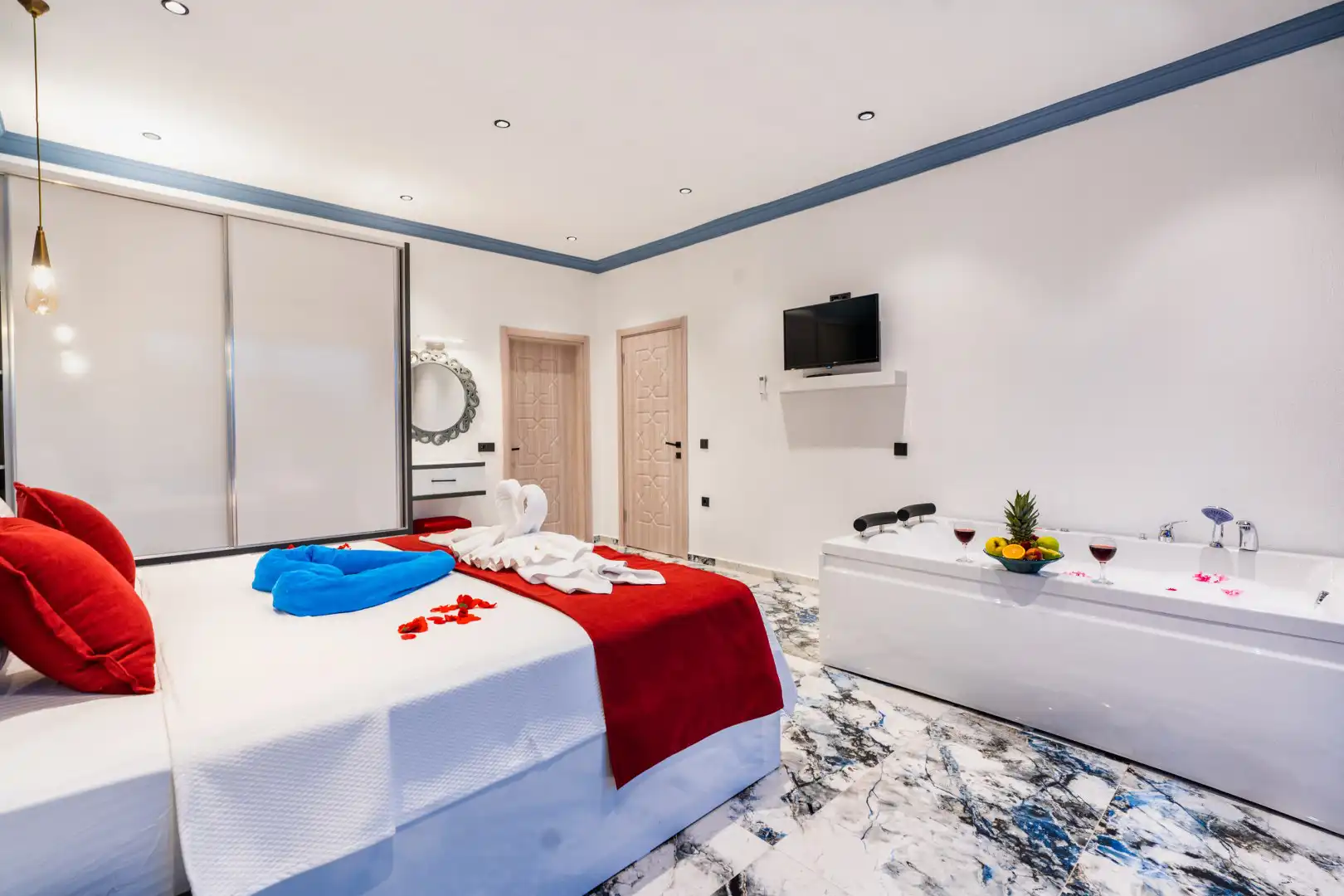 - 1 Çift Kişilik Yatak, 1 Jakuzi, 1 Banyo/WC, TV, 2 Komodin, Elbise dolabı, Makyaj Masası, Klima,