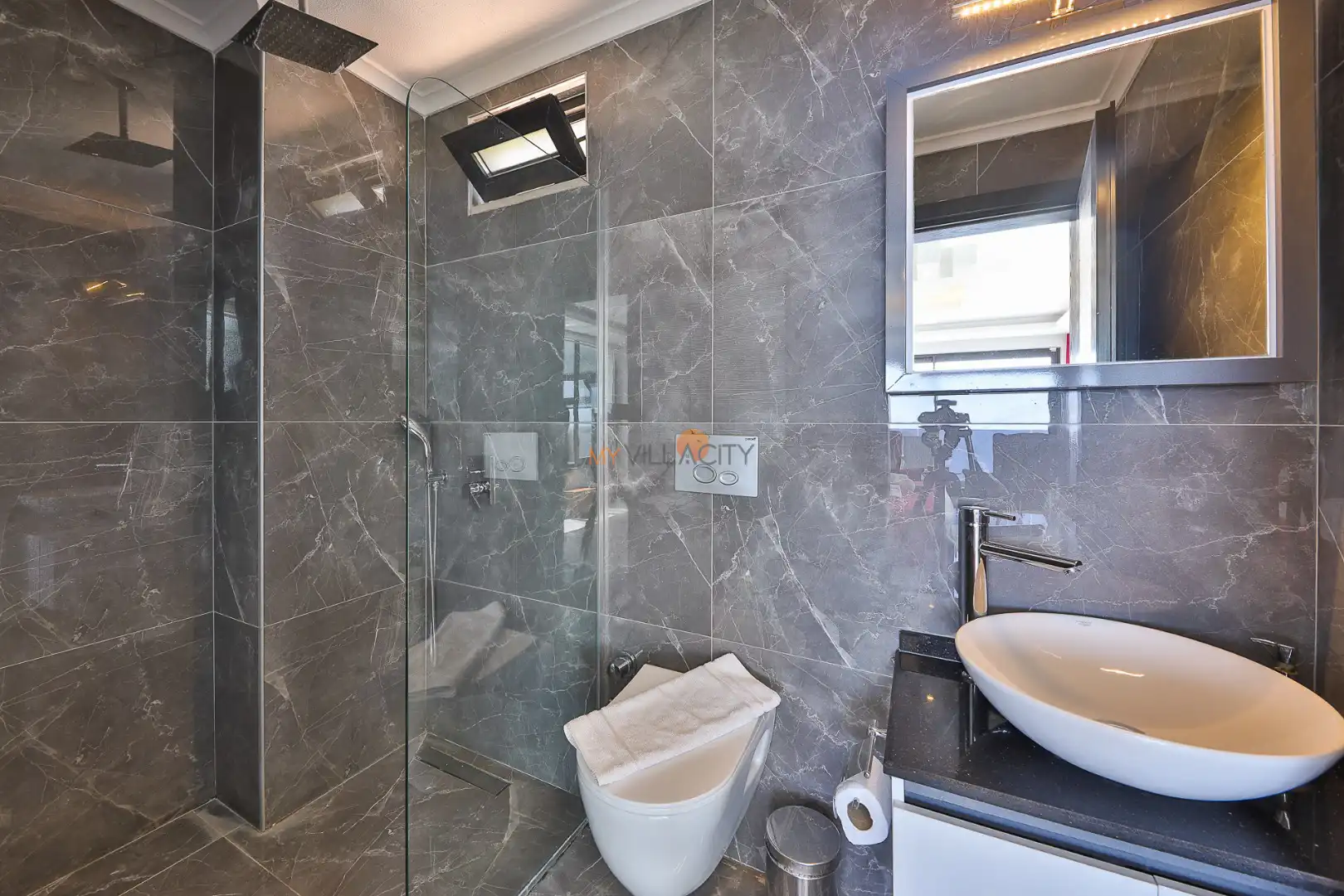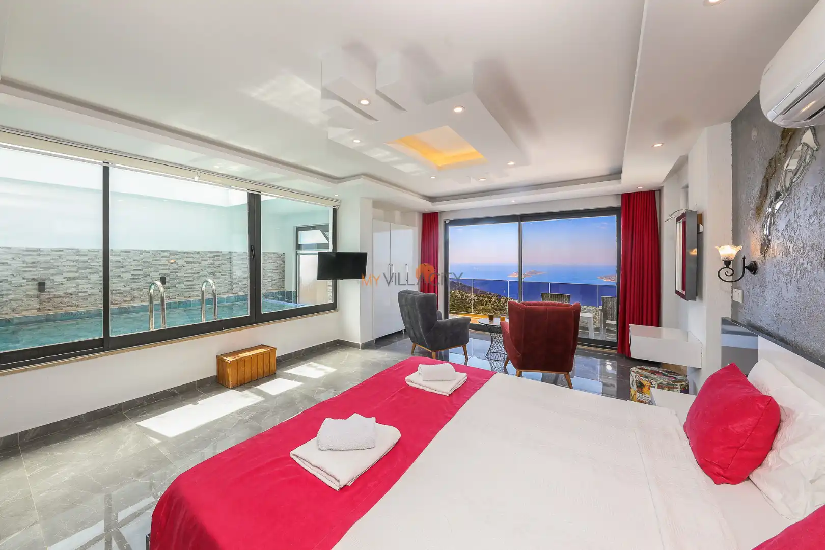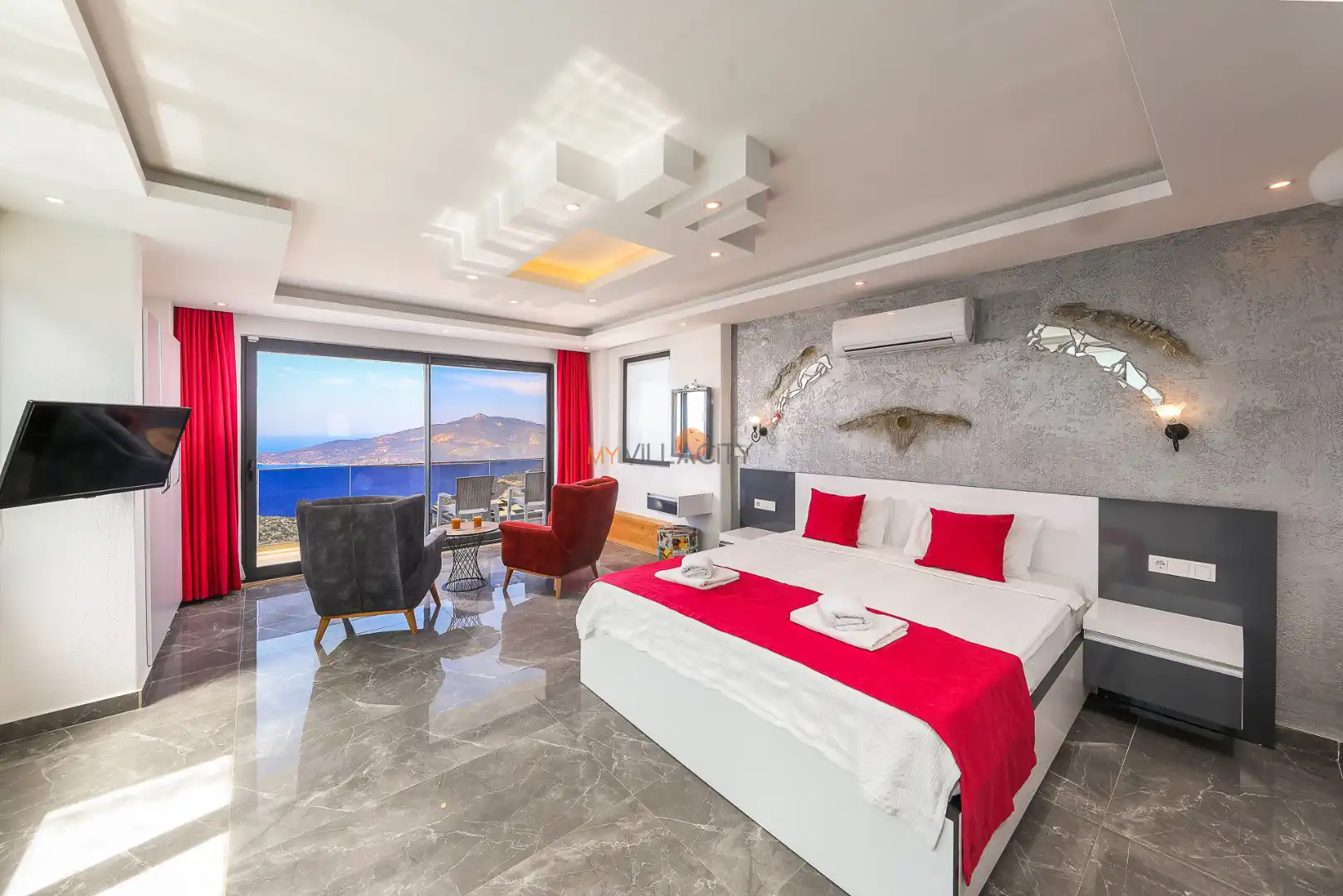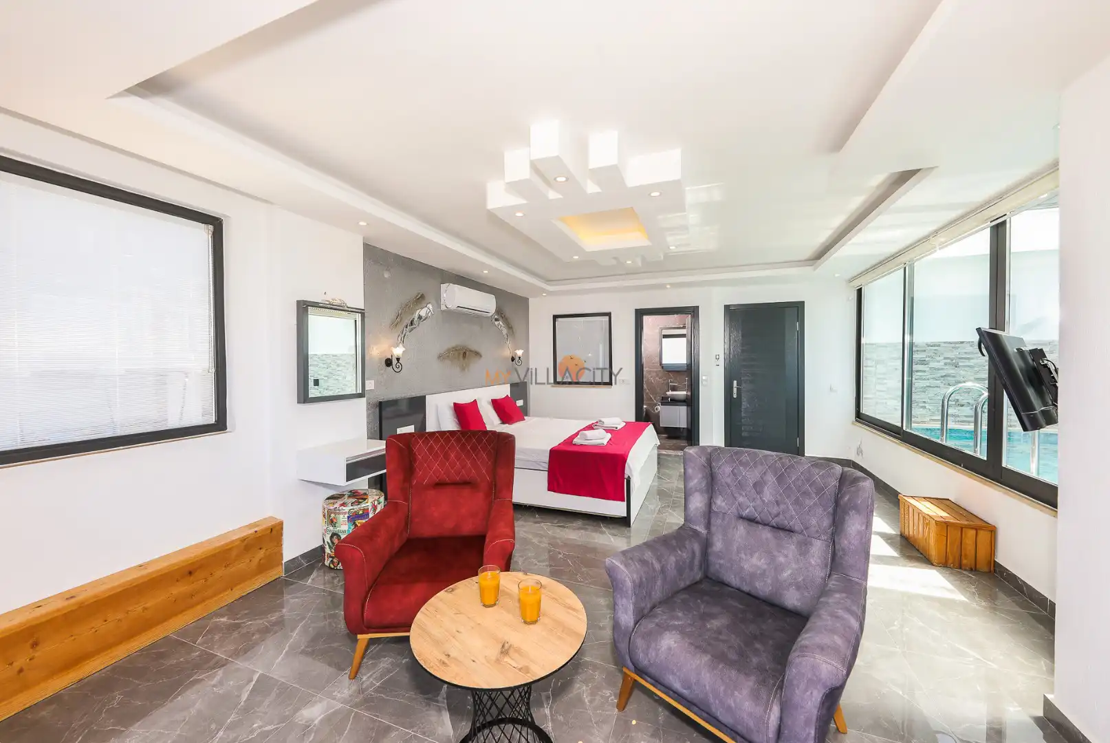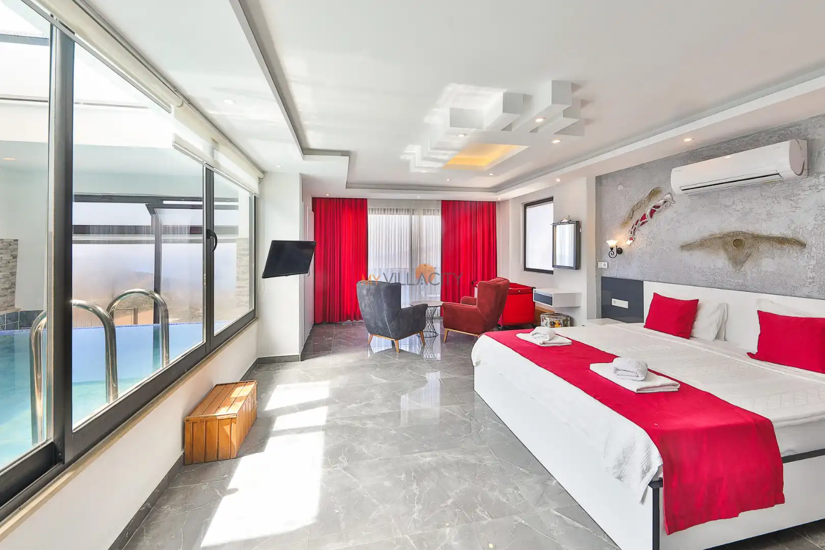 1 Çift Kişilik Yatak, 1 Banyo/WC, 2 Komodin, Elbise dolabı, Makyaj Masası, Klima,