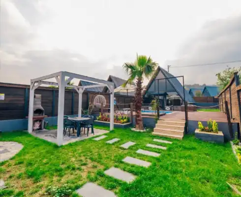 Dış alanında misafirleri özel ısıtmalı havuz (3x5m / 1.50m), jakuzi, salıncak, taş barbekü ve bahçe mobilyaları karşılar. Kış döneminde aktif olan sıcak havuz sistemi, dört mevsim konforlu bir tatil fırsatı sunar.