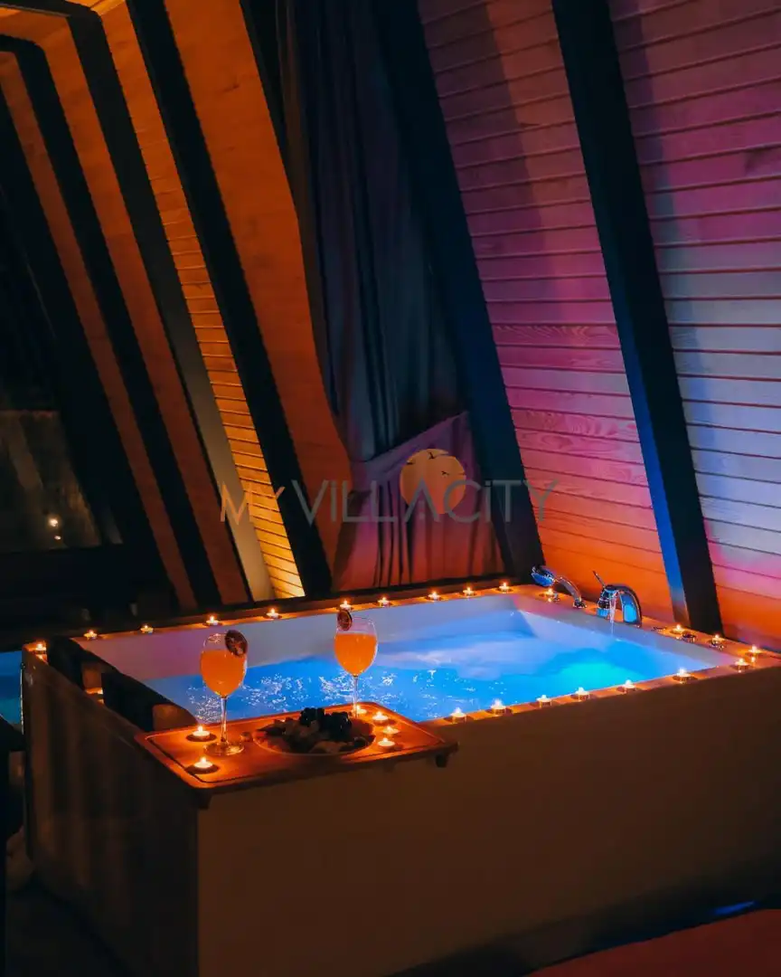 Her bungalovda ısıtmalı özel havuz ve jakuzi yer almakta olup, misafirlerin dört mevsim keyifli bir tatil geçirmeleri hedeflenmiştir. İç mekânda modern dekorasyonun sıcak detaylarla birleştiği ferah bir yaşam alanı bulunur. TV, WiFi, barbekü alanı, tam donanımlı mutfak, 1 banyo & tuvalet gibi tüm temel ihtiyaçlar düşünülmüş ve misafirlerin kendilerini ev rahatlığında hissetmeleri amaçlanmıştır.