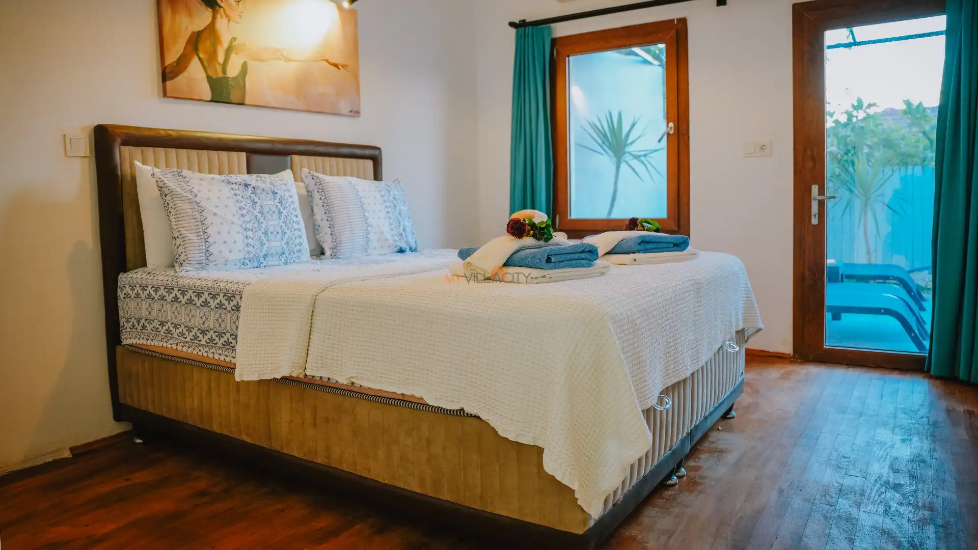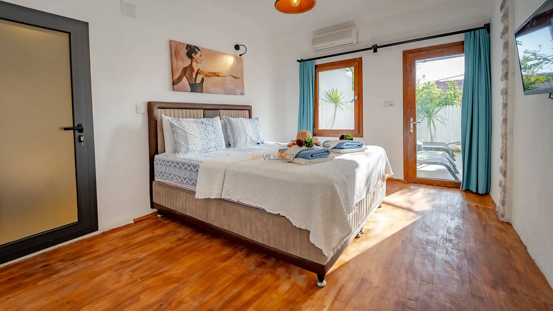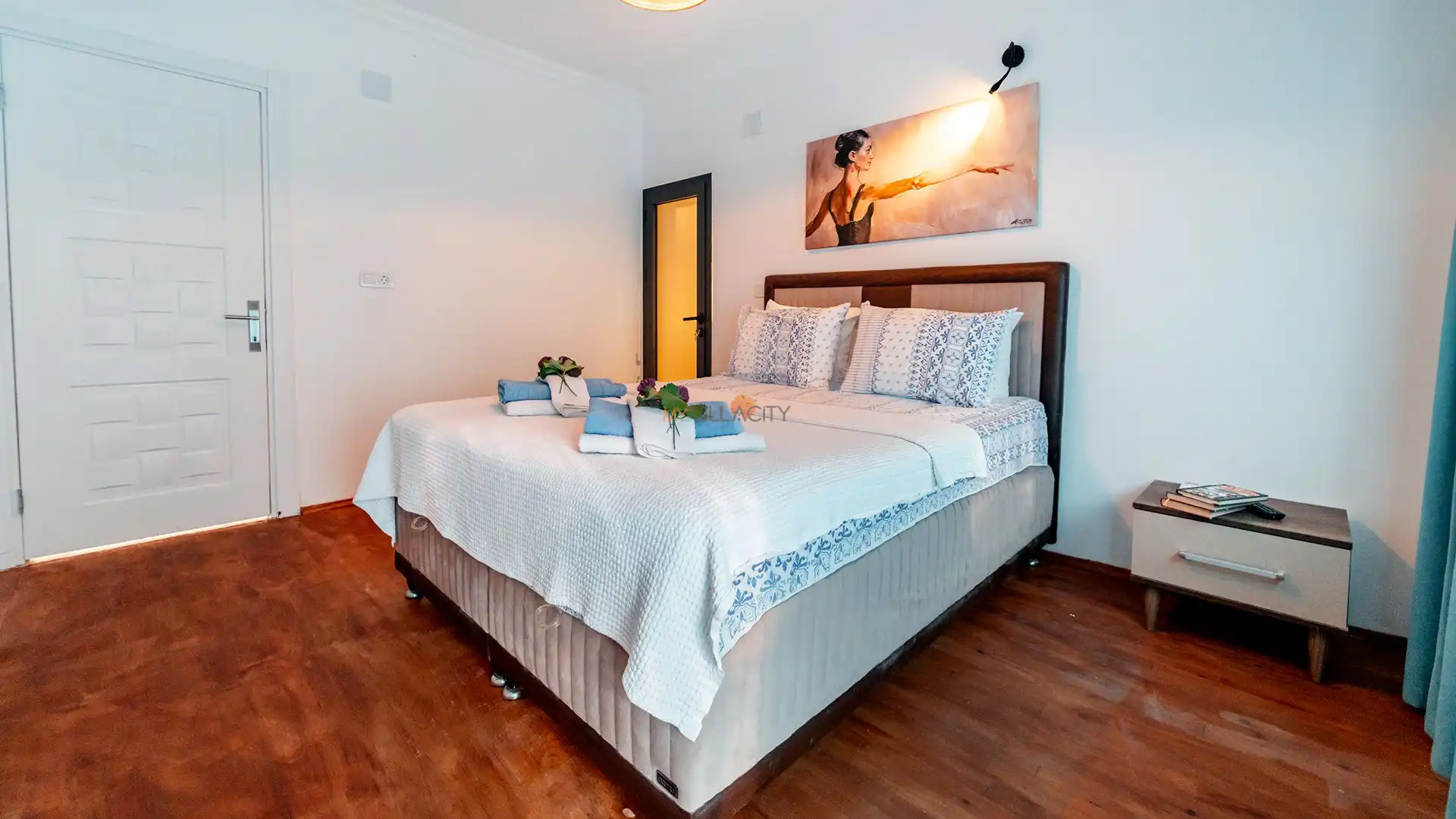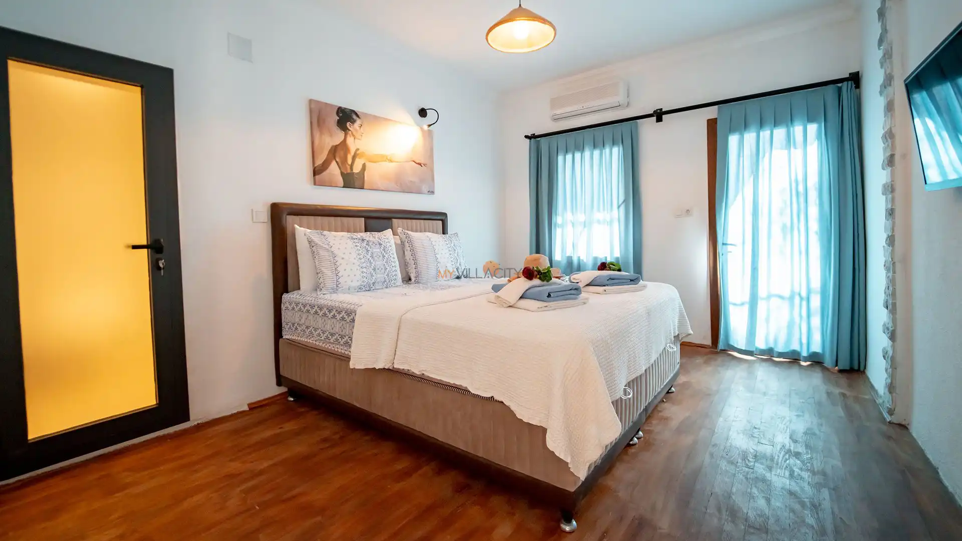 - 1 Çift Kişilik Yatak, 1 Banyo/WC, 2 Komodin, Elbise dolabı, Makyaj Masası, Klima,