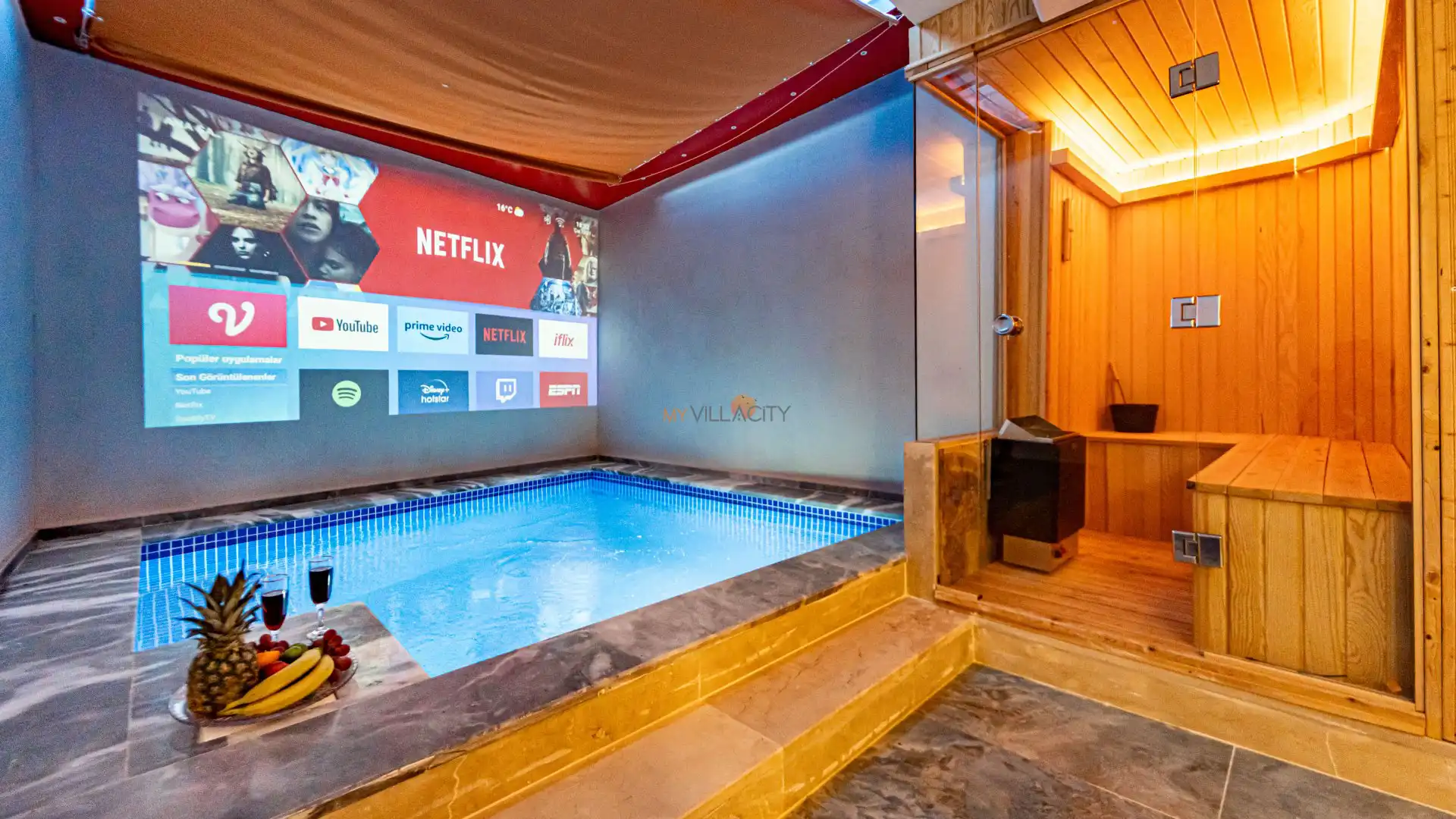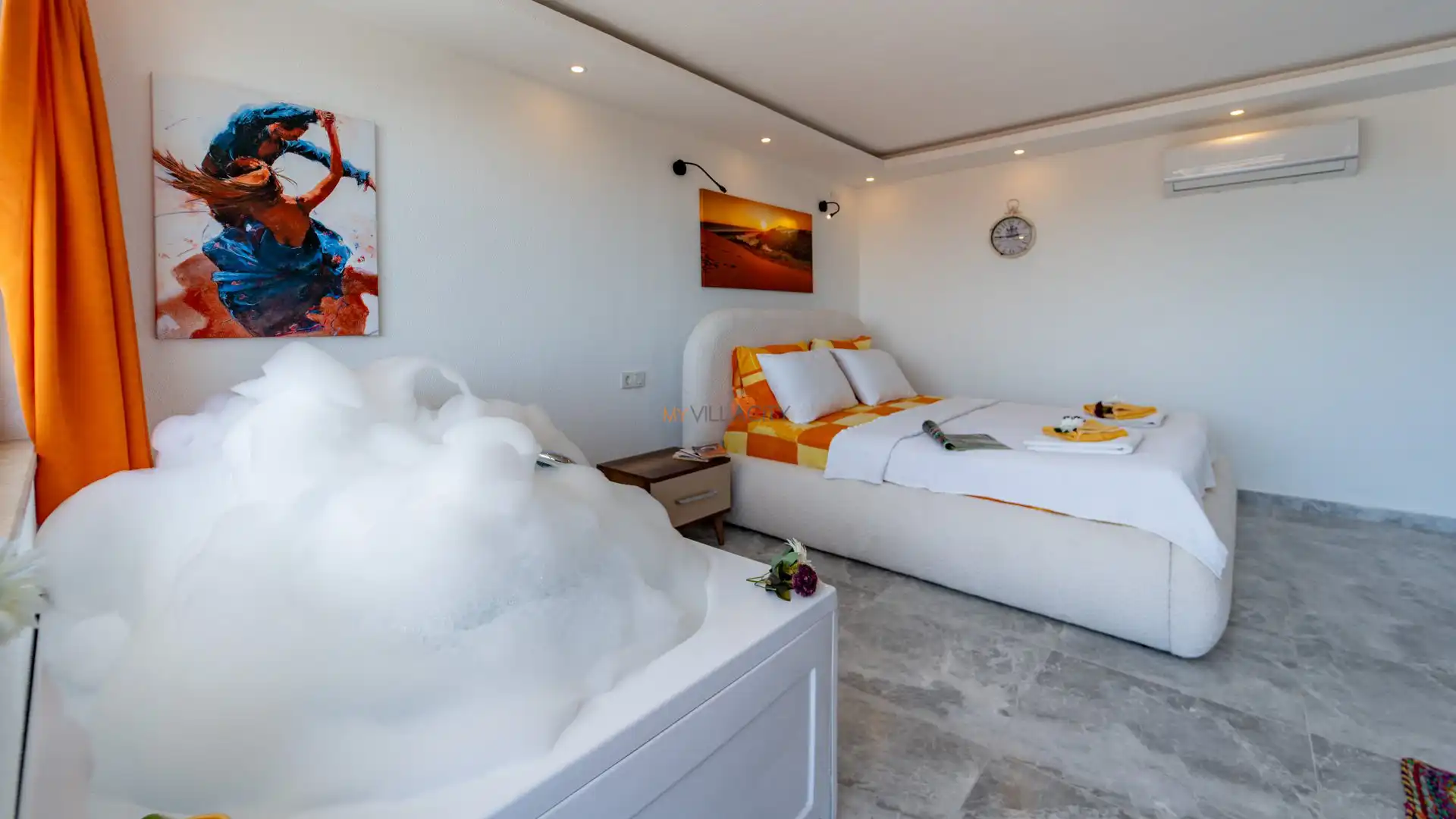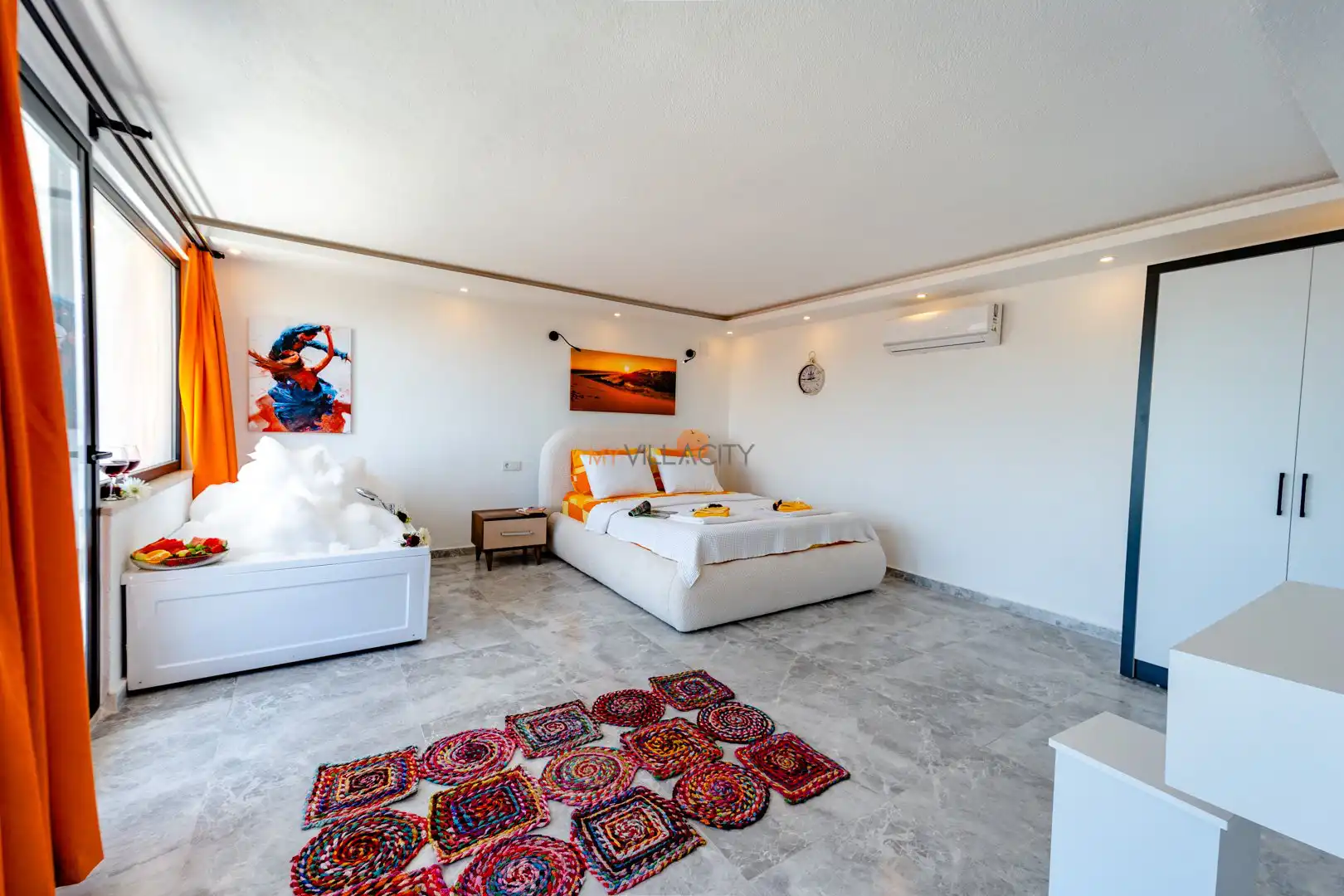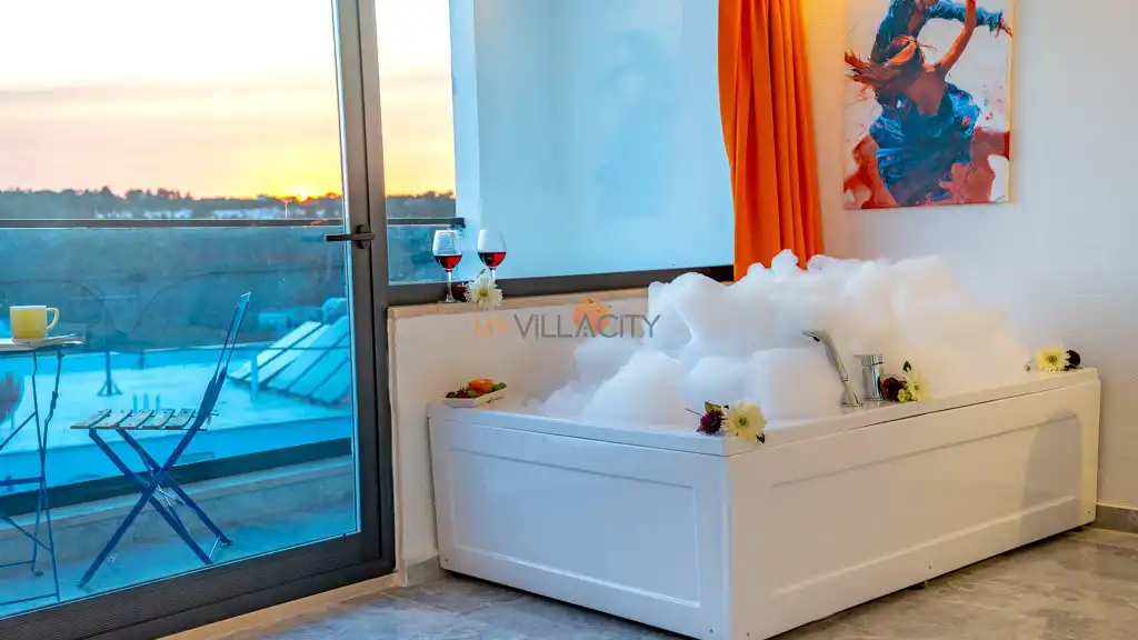 - 1 Çift Kişilik Yatak, 1 Jakuzi, Sauna, 1 Banyo/WC, 2 Komodin, Elbise dolabı, Makyaj Masası, Klima,
