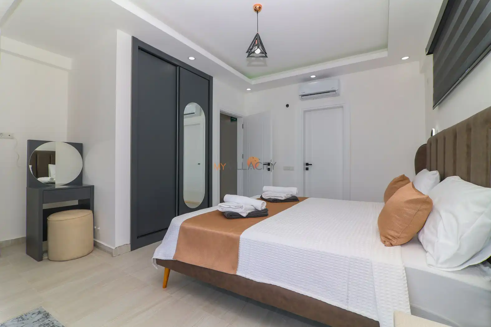 - 1 Çift Kişilik Yatak, 1 Banyo/WC, 2 Komodin, Elbise dolabı, Makyaj Masası, Klima,