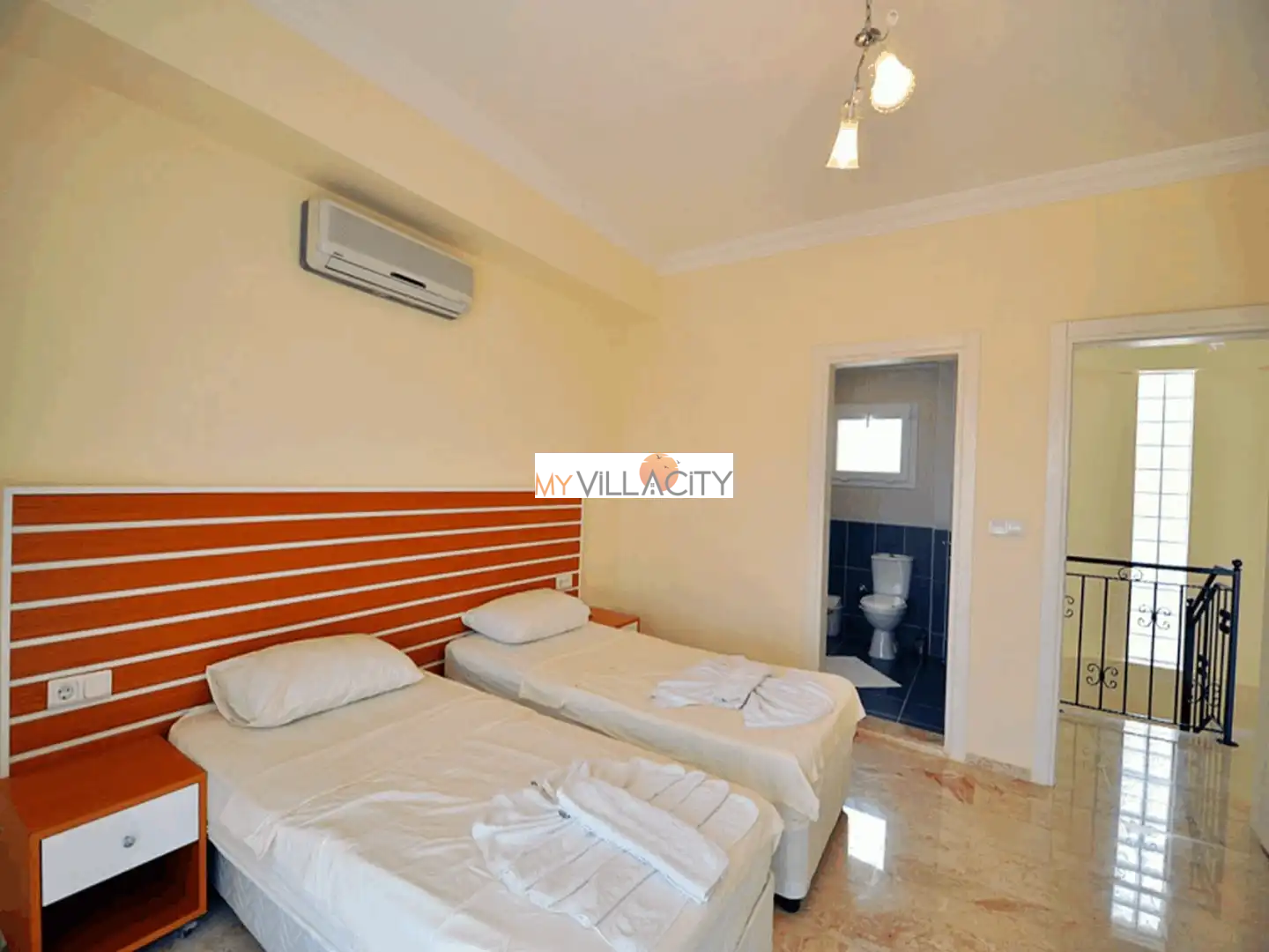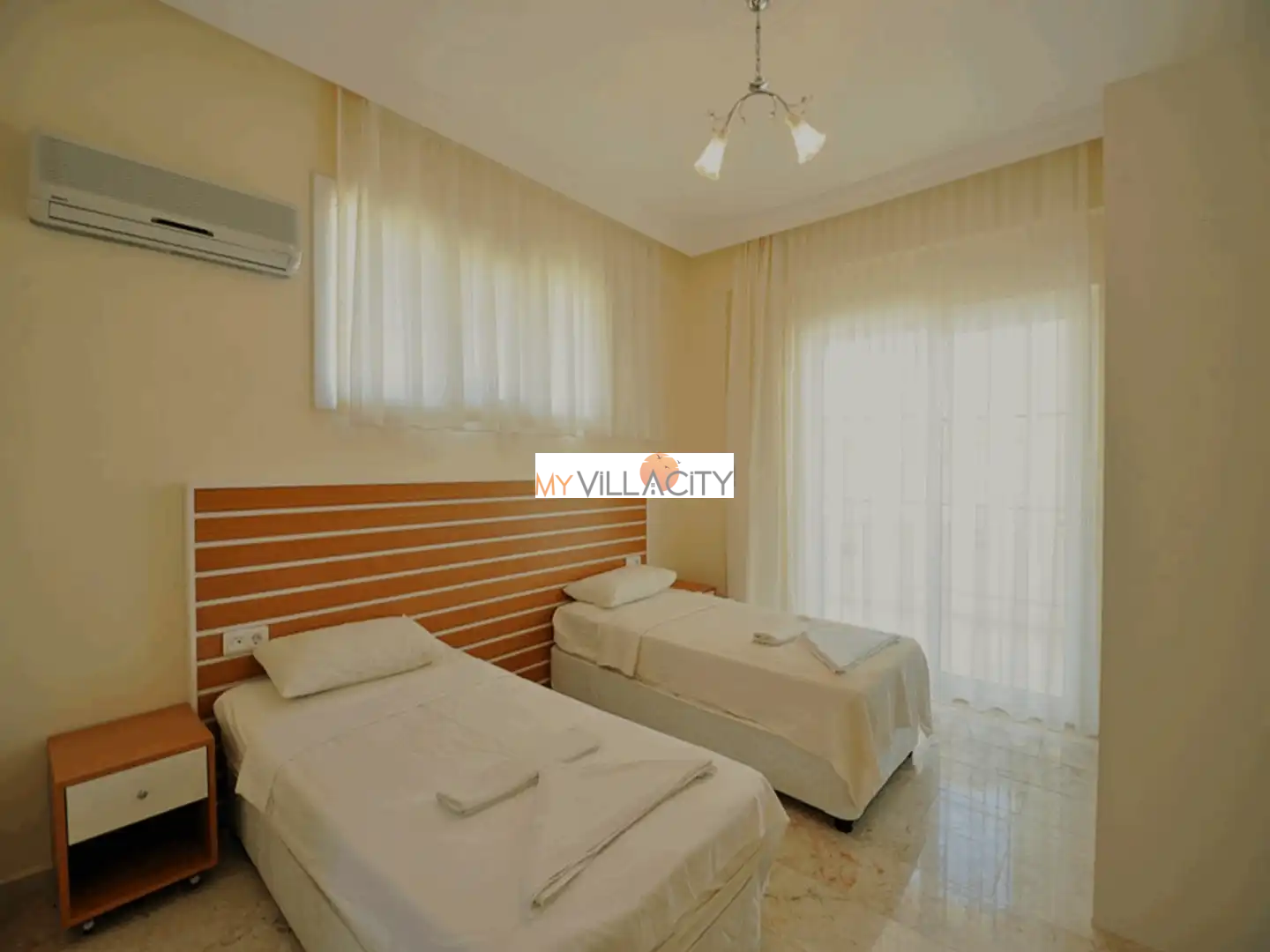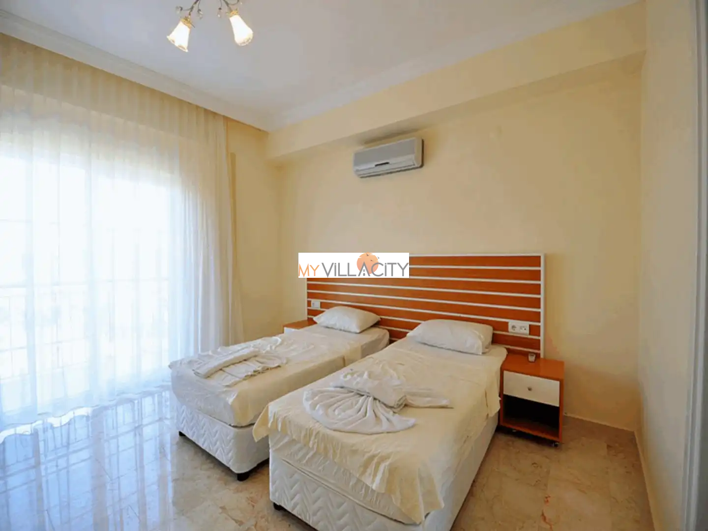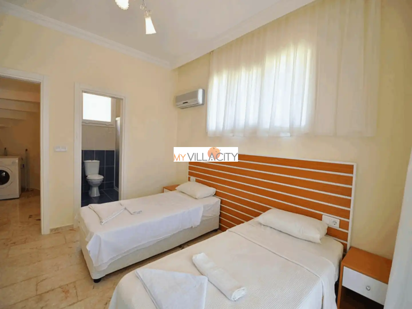 - 2 Tek Kişilik Yatak, 1 Banyo/WC, 2 Komodin, Elbise dolabı, Makyaj Masası, Klima,