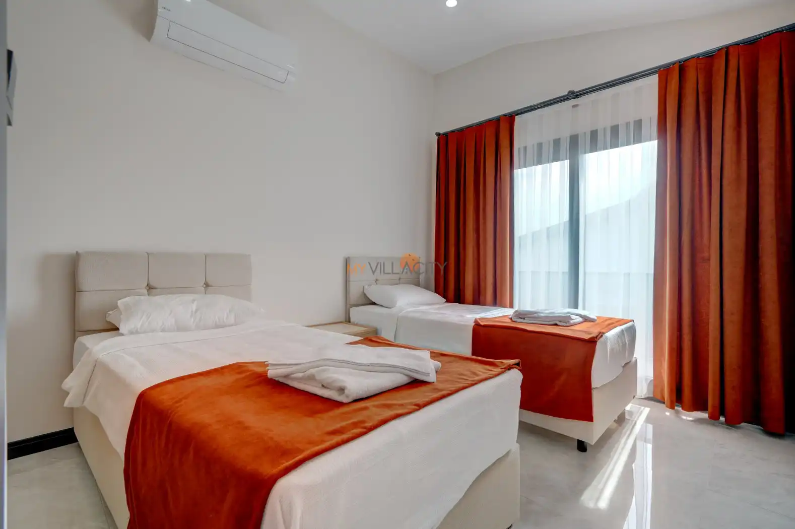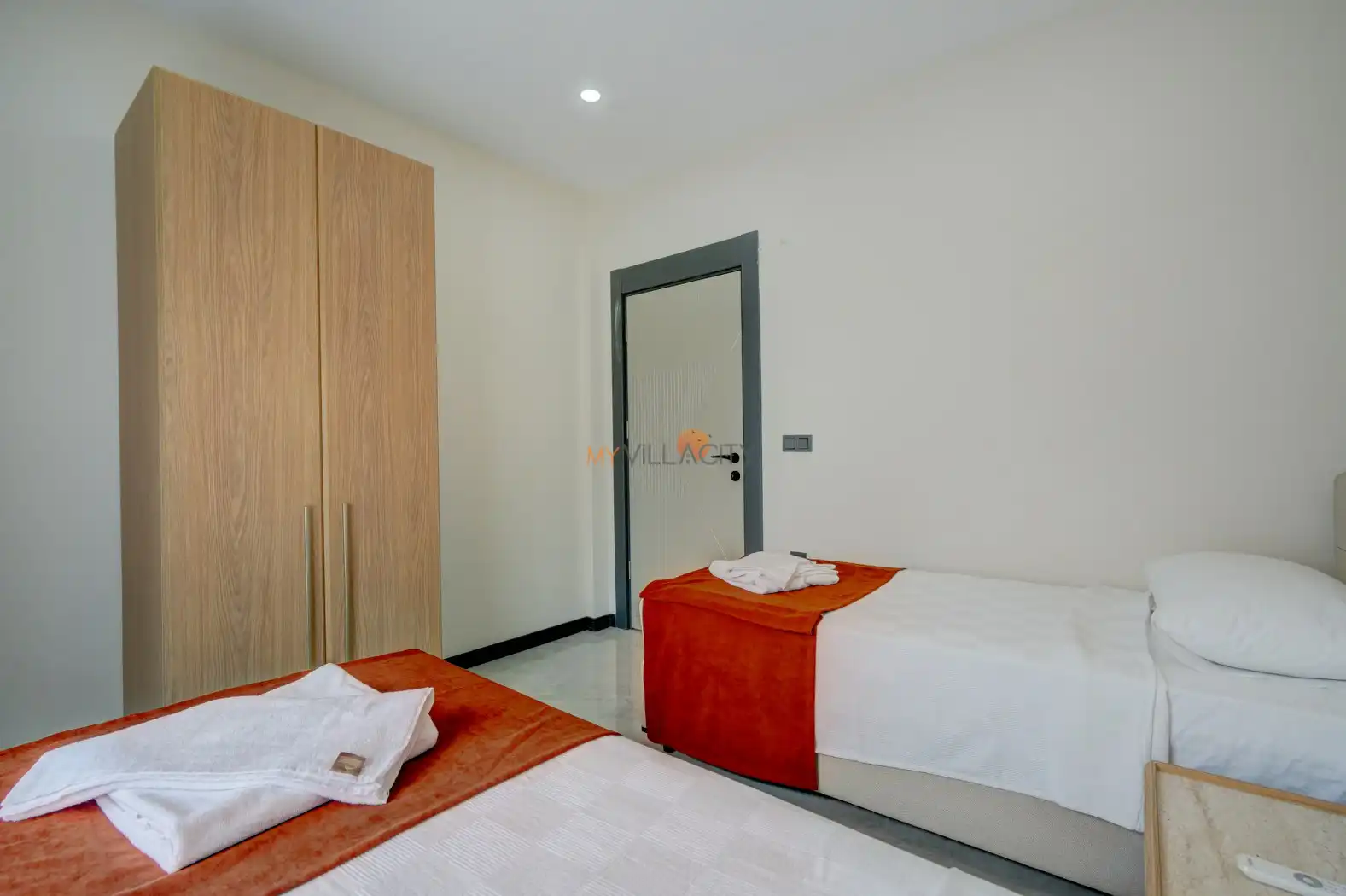 - 2 Tek Kişilik Yatak, 1 Banyo/WC, 2 Komodin, Elbise dolabı, Makyaj Masası, Klima,