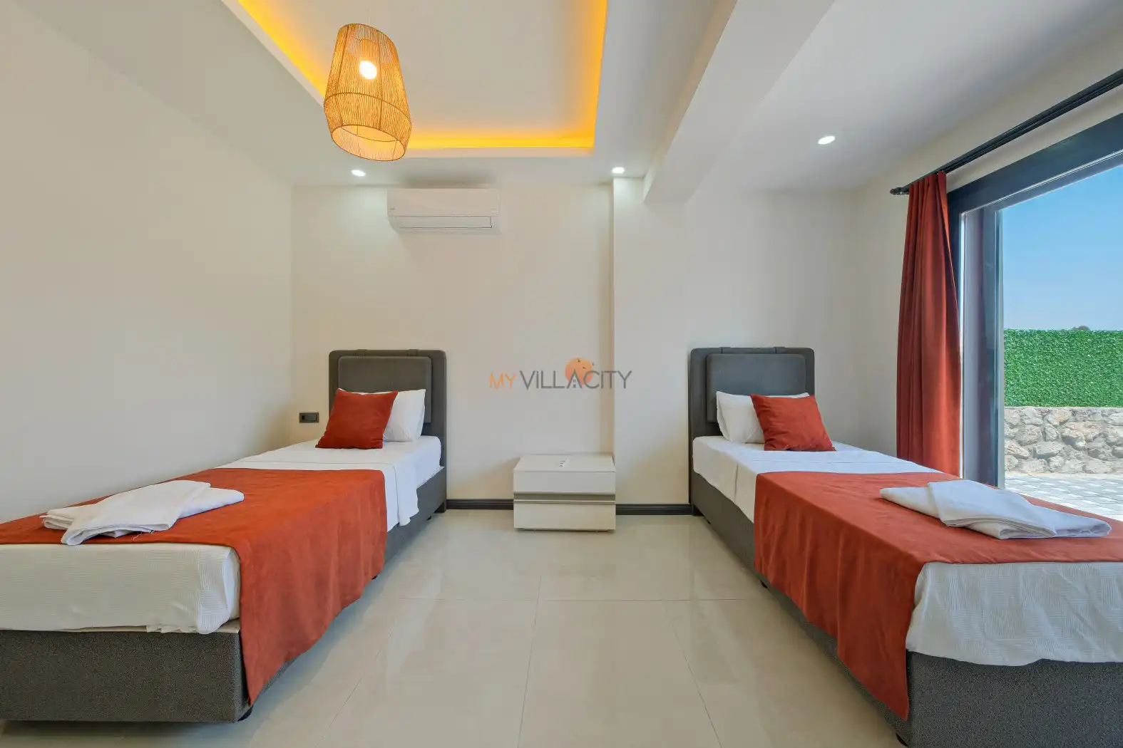 - 2 Tek Kişilik Yatak, 1 Banyo/WC, 2 Komodin, Elbise dolabı, Makyaj Masası, Klima,