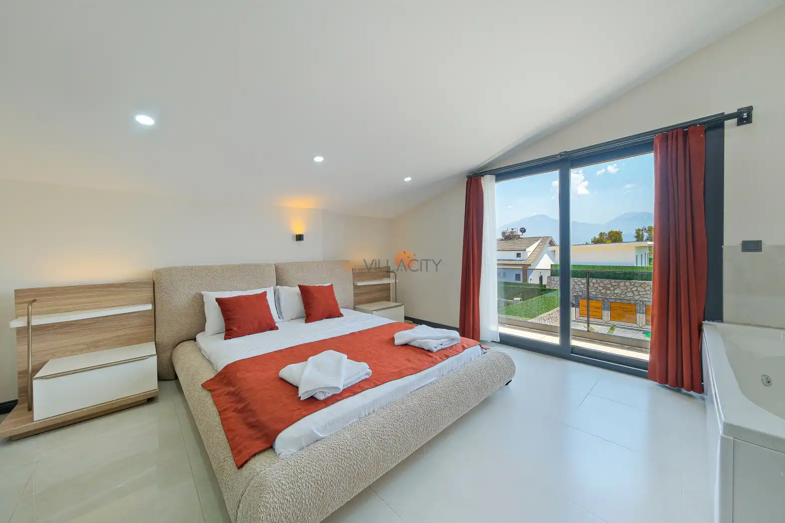 - 1 Çift Kişilik Yatak, 1 Jakuzi, Sauna, 1 Banyo/WC, 2 Komodin, Elbise dolabı, Makyaj Masası, Klima,