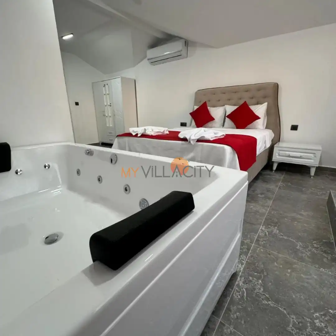 - 1 Çift Kişilik Yatak, 1 Jakuzi, 1 Banyo/WC, 2 Komodin, Elbise dolabı, Makyaj Masası, Klima,