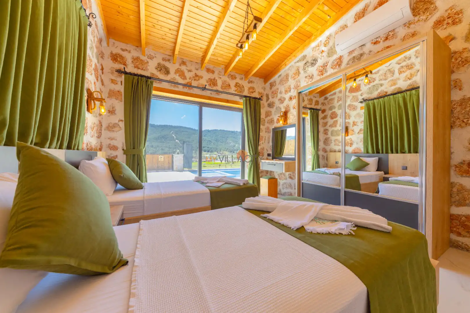 - 2 Tek Kişilik Yatak, 1 Banyo/WC, Elbise dolabı, Makyaj Masası, Klima,
