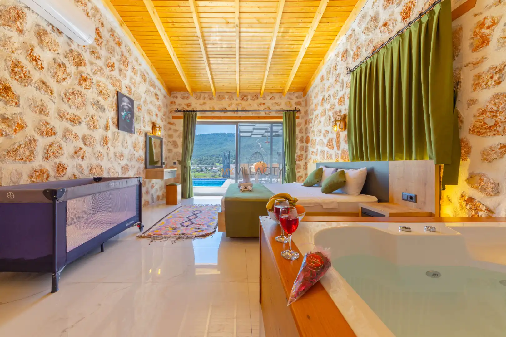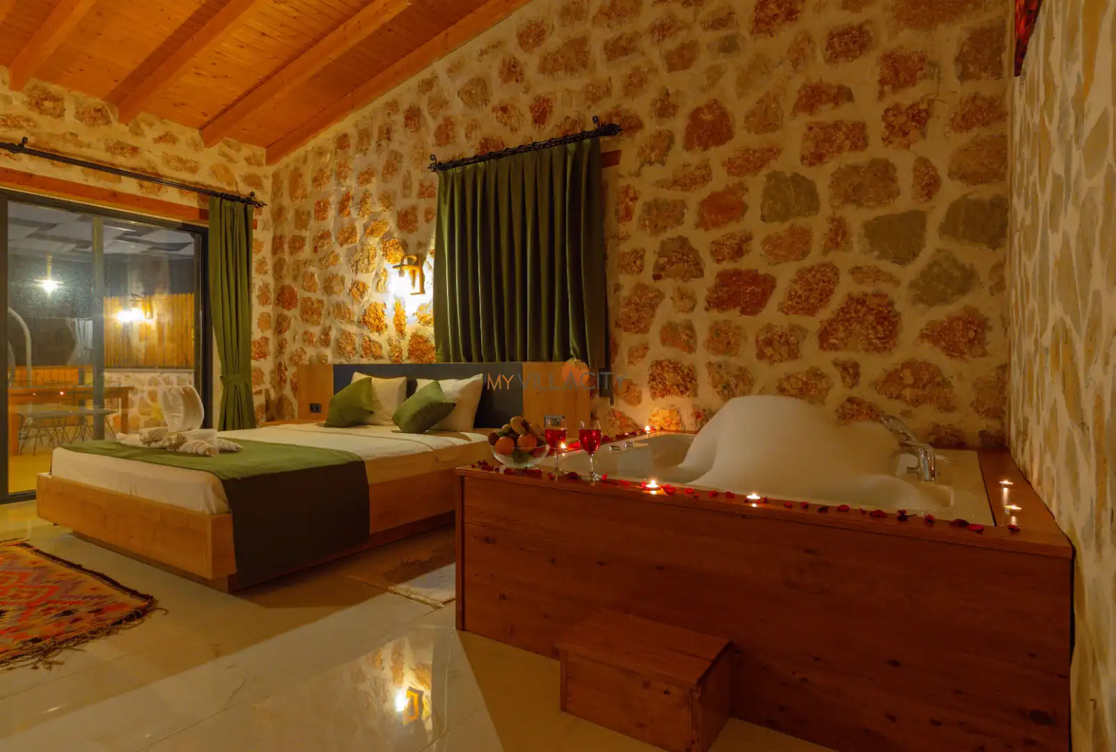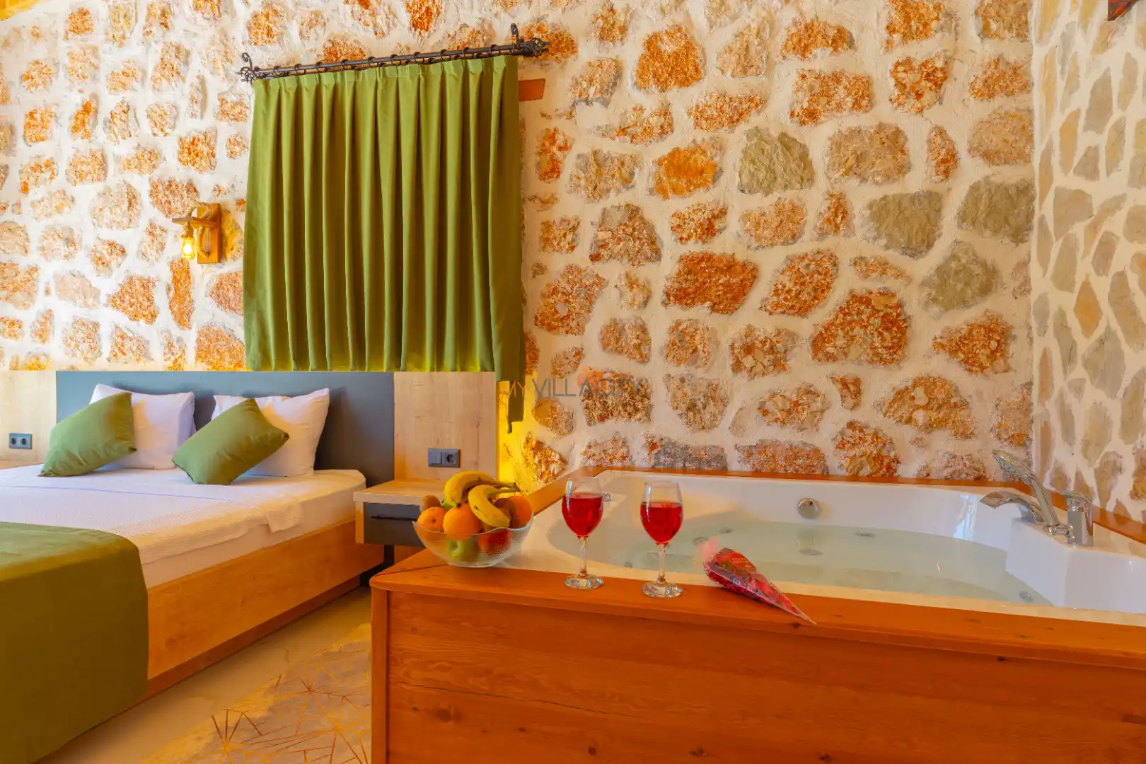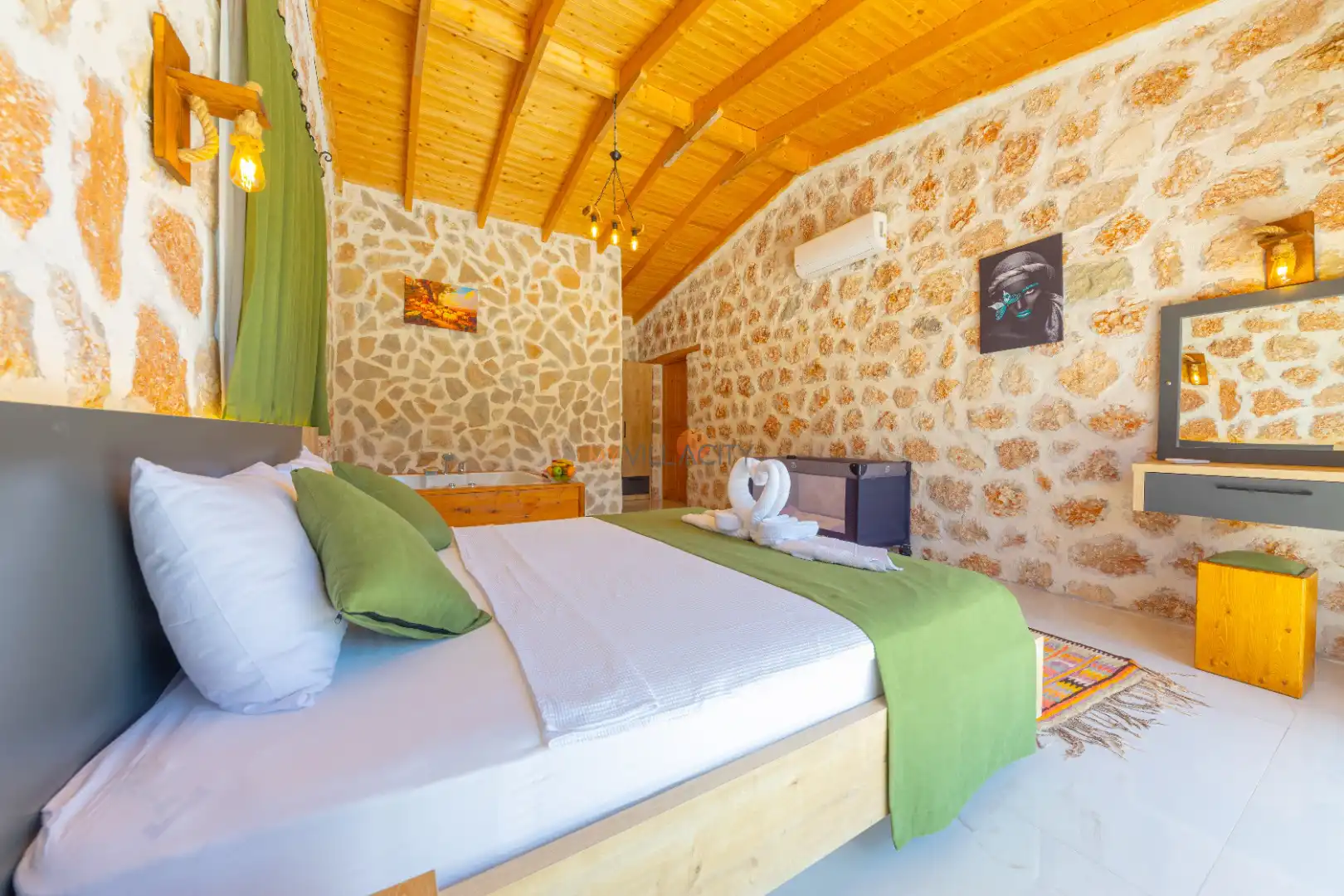 - 1 Çift Kişilik Yatak, 1 Jakuzi, 1 Banyo/WC, Elbise dolabı, Makyaj Masası, Klima,