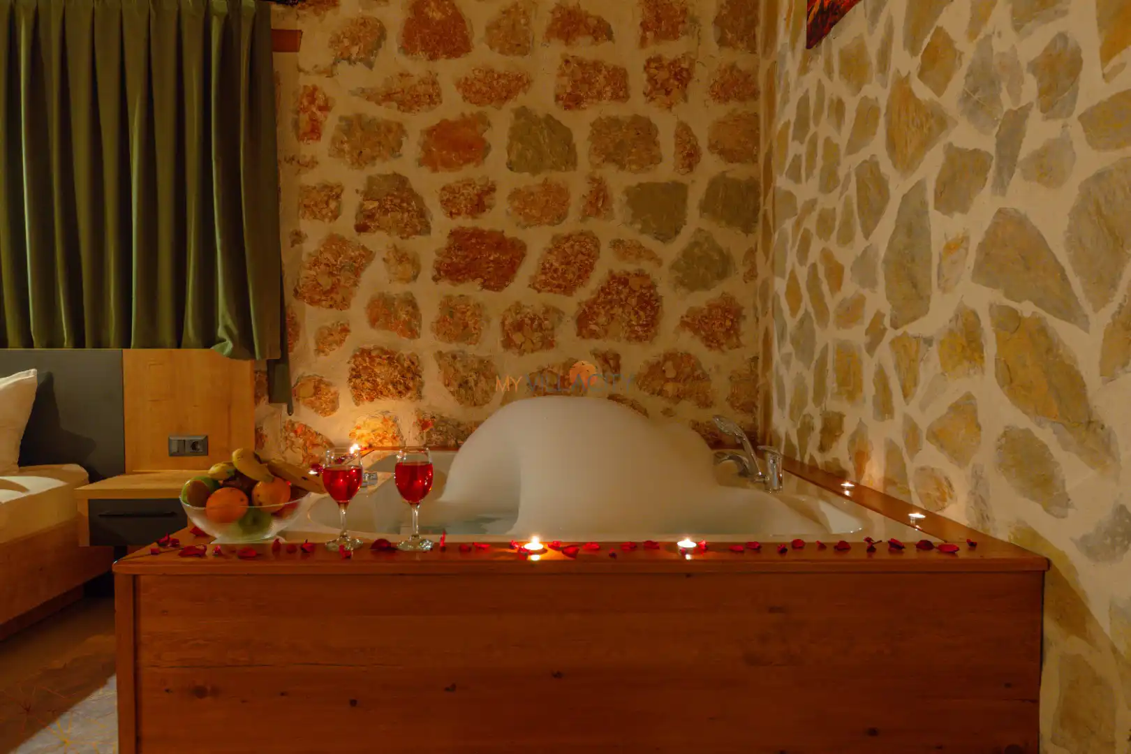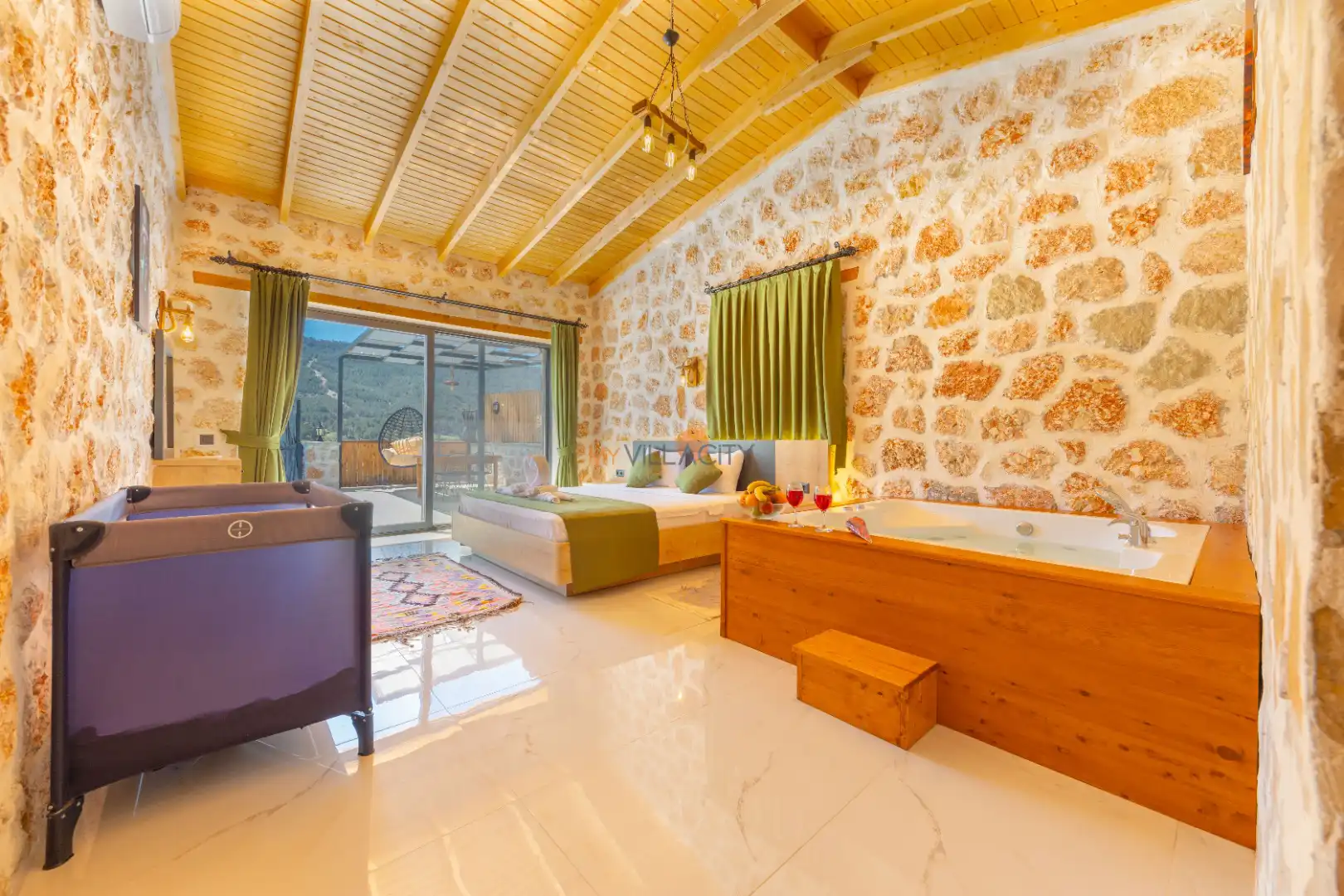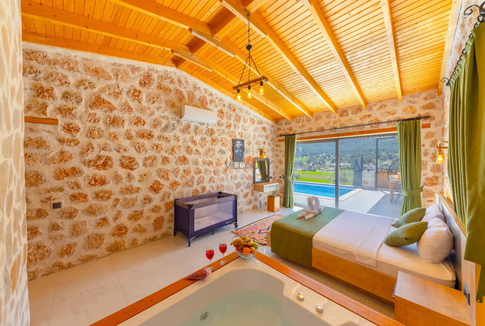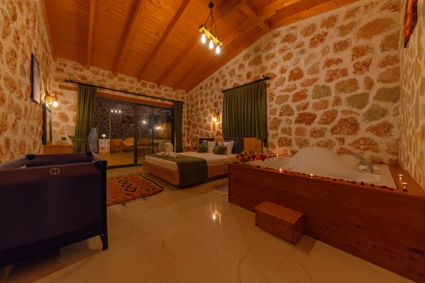 - 1 Çift Kişilik Yatak, 1 Jakuzi, 1 Banyo/WC, Elbise dolabı, Makyaj Masası, Klima,