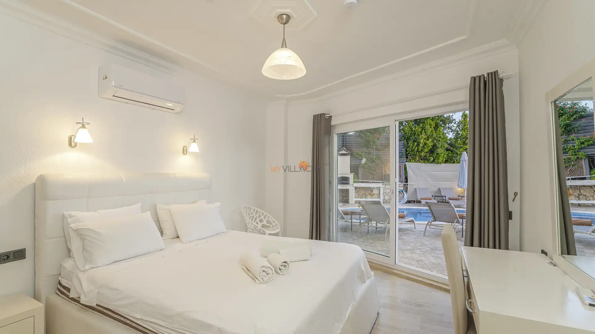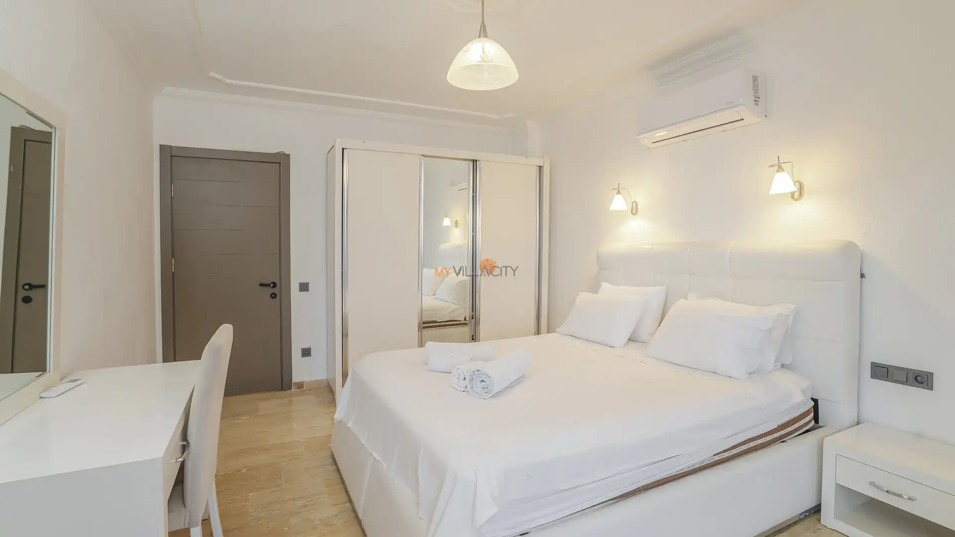- 1 Çift Kişilik Yatak, 1 Banyo/WC, 2 Komodin, Elbise dolabı, Makyaj Masası, Klima,