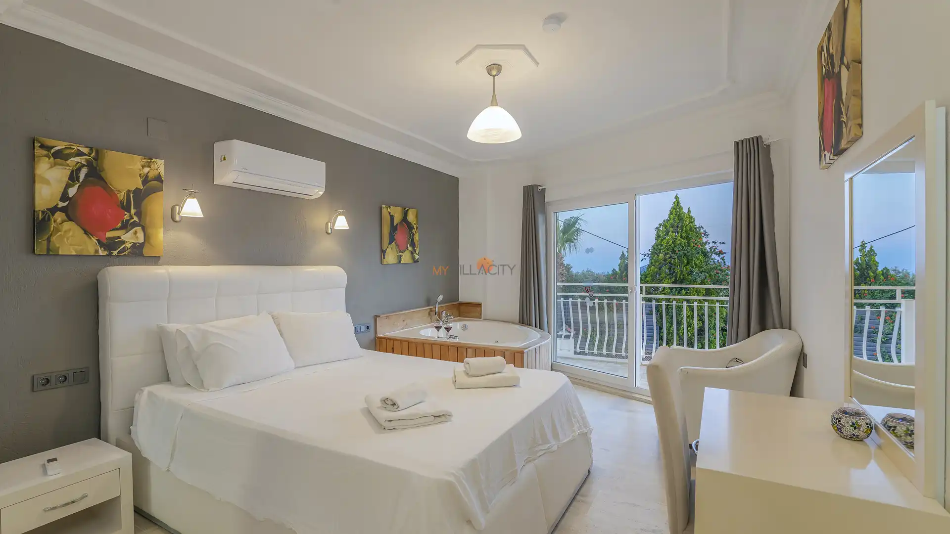 - 1 Çift Kişilik Yatak, 1 Jakuzi, 1 Banyo/WC, 2 Komodin, Elbise dolabı, Makyaj Masası, Klima,
