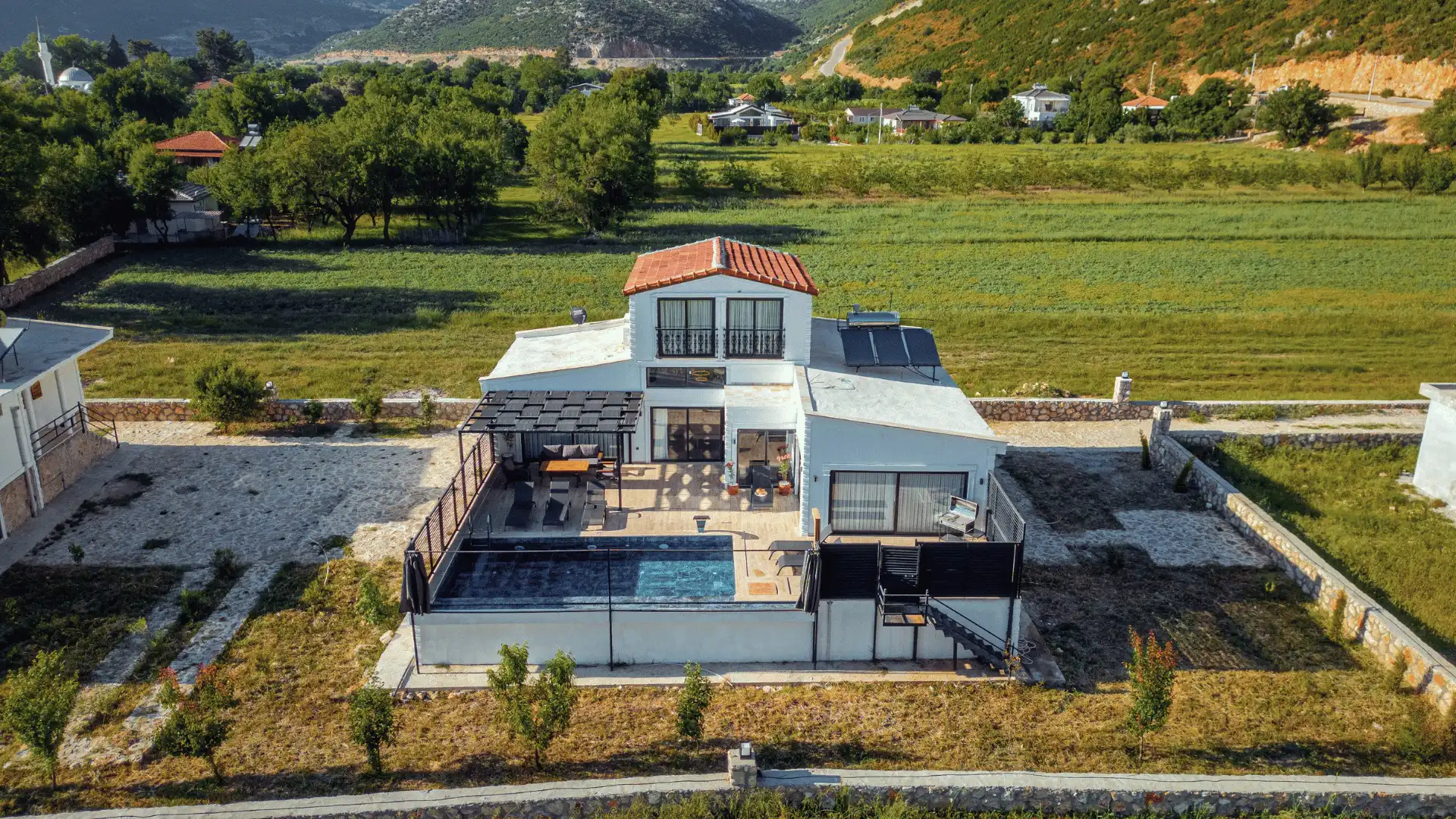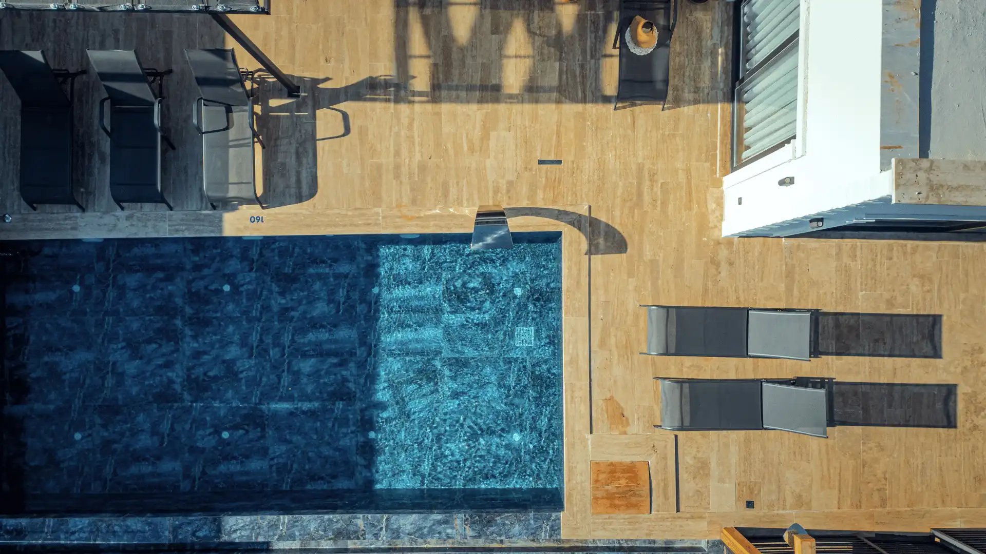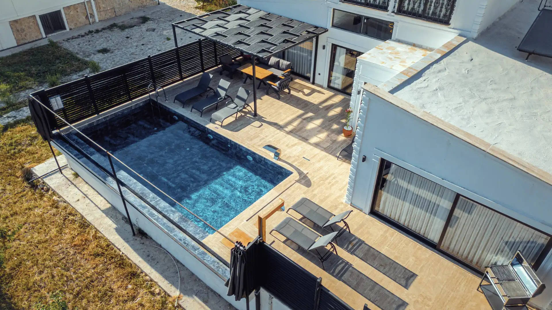 Villamızda bulunan havuz ve havuz terası tamamen korunaklıdır, böylece konuklarımız gizliliklerini tam anlamıyla yaşayabilirler. Havuz terasında güneşlenme şezlongları ve açık hava yemek masası da bulunmaktadır, böylece misafirlerimiz hem güneşin tadını çıkarabilir hem de keyifli bir akşam yemeği deneyimi yaşayabilirler.