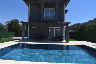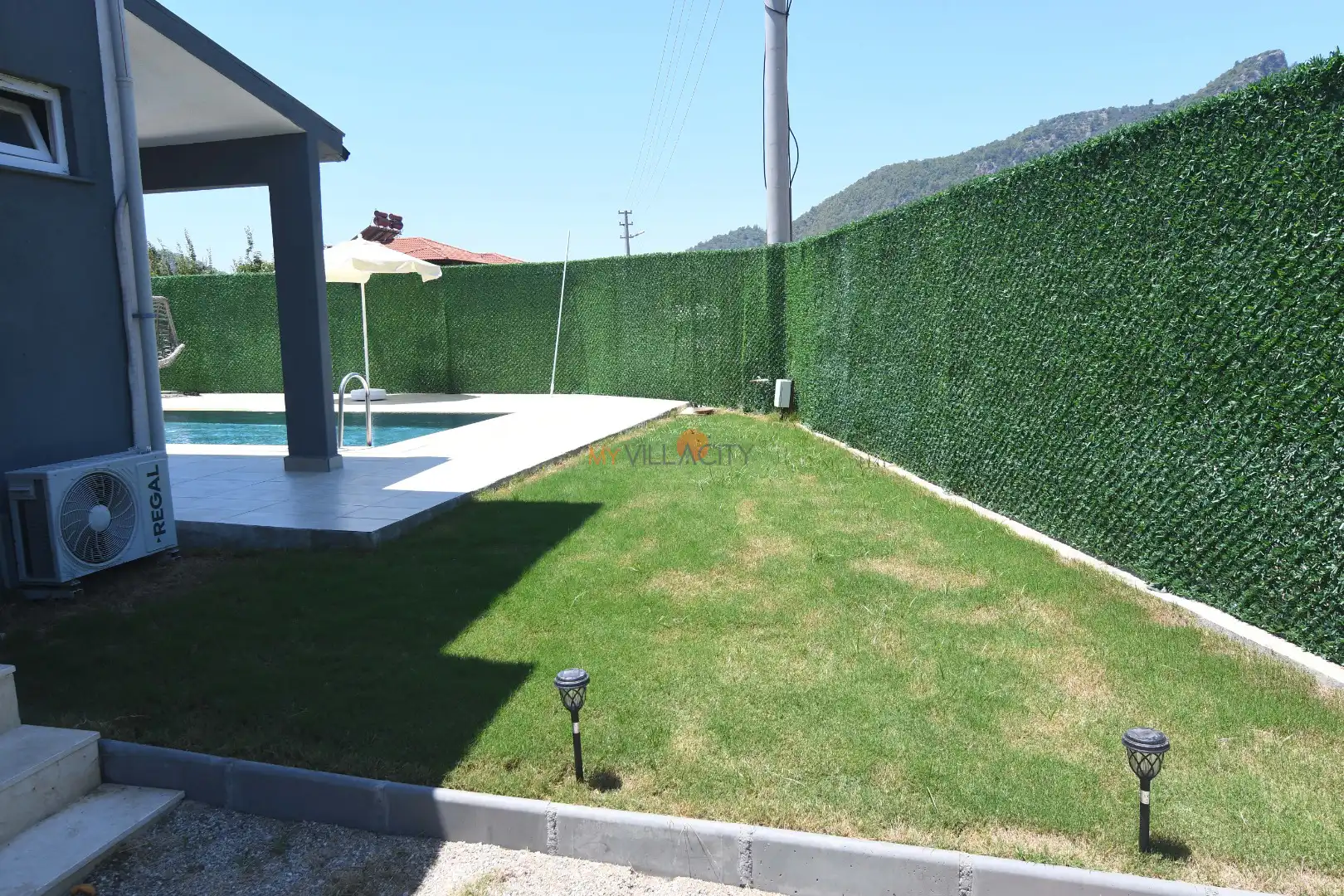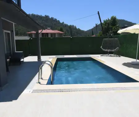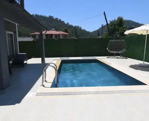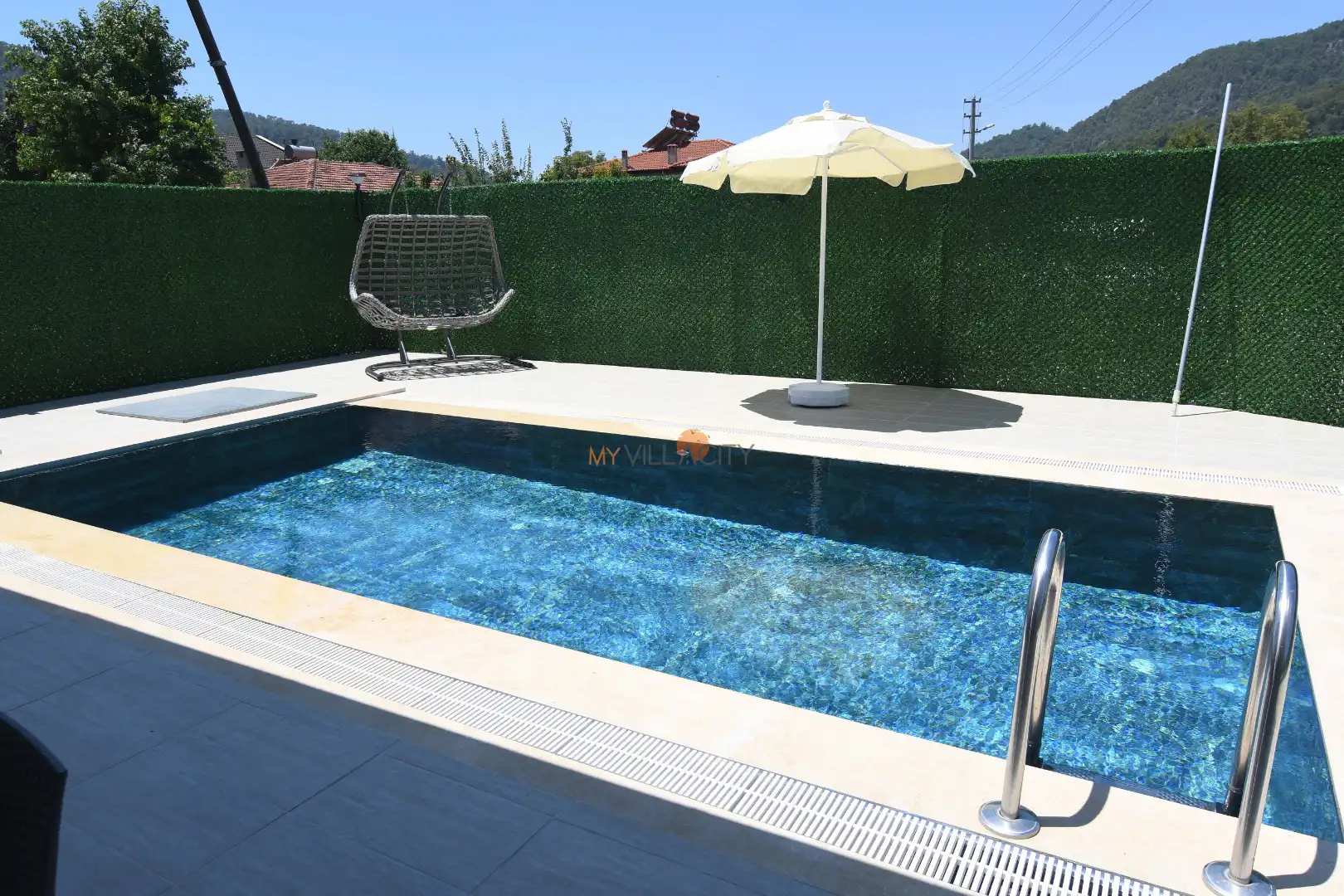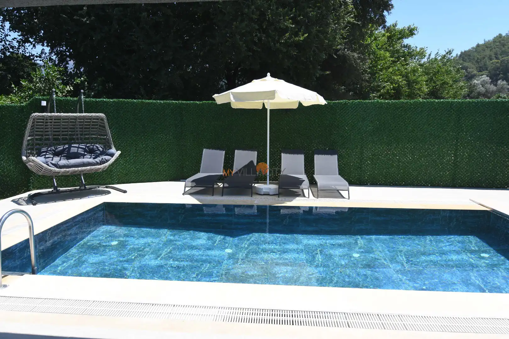 Villanın özel yüzme havuzu ve bahçe alanı kısmi korunaklı yapıya sahiptir. Geniş havuz terasında şezlonglar, oturma alanı ve mangal bölümü yer almakta olup gün boyu keyifli vakit geçirebileceğiniz bir ortam sunar. Doğanın içinde huzurlu bir atmosferde güne başlarken, temiz hava ve sakinlik eşliğinde unutulmaz anlar yaşayabilirsiniz.