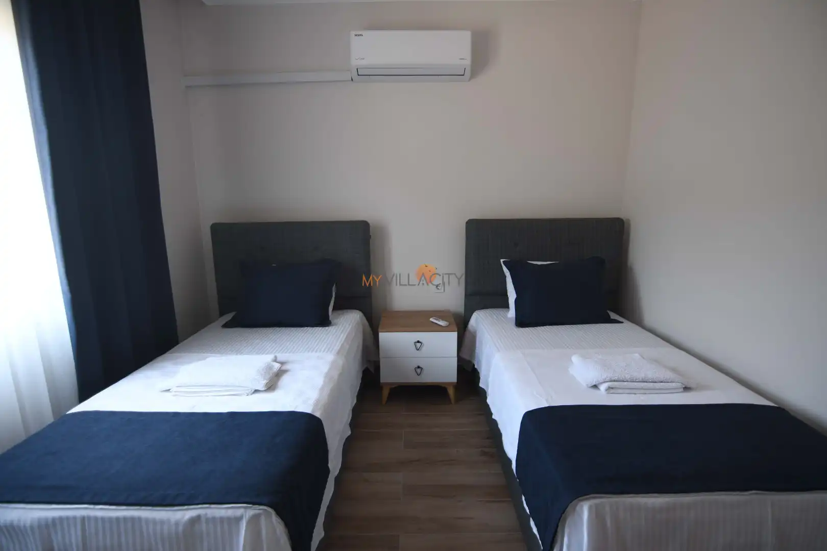 - 2 Tek Kişilik Yatak, 1 Banyo/WC, 2 Komodin, Elbise dolabı, Makyaj Masası, Klima,