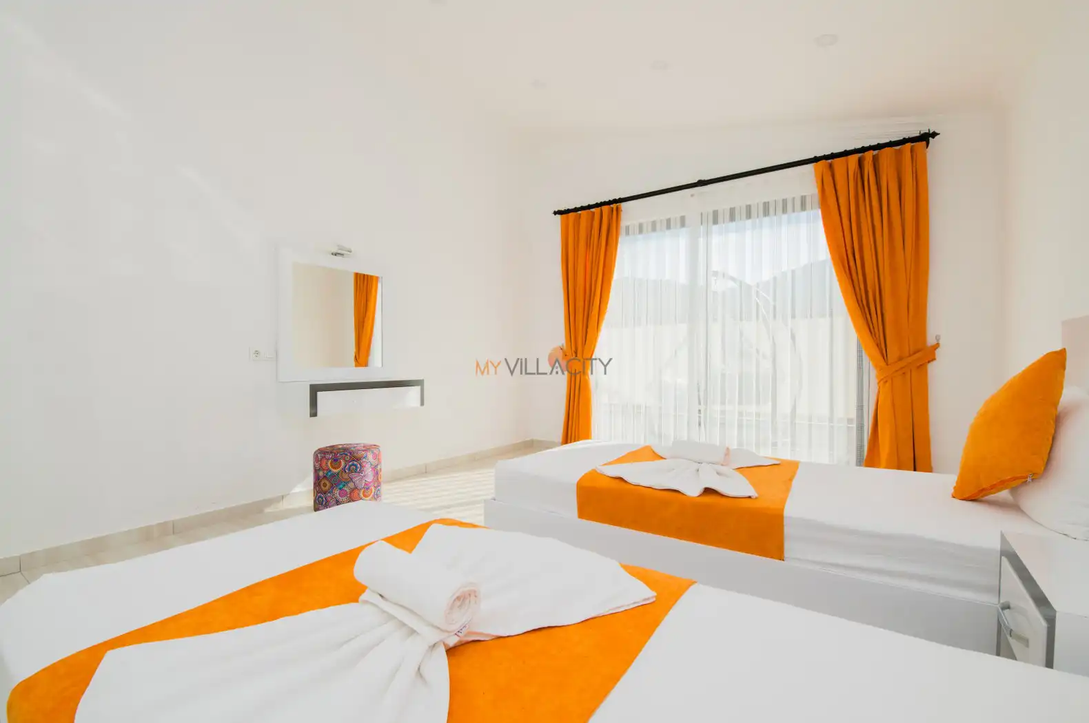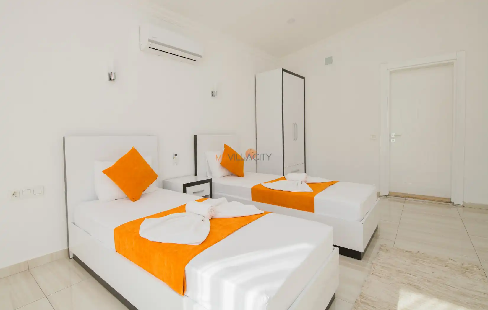 - 2 Tek Kişilik Yatak, 1 Banyo/WC, 2 Komodin, Elbise dolabı, Makyaj Masası, Klima,