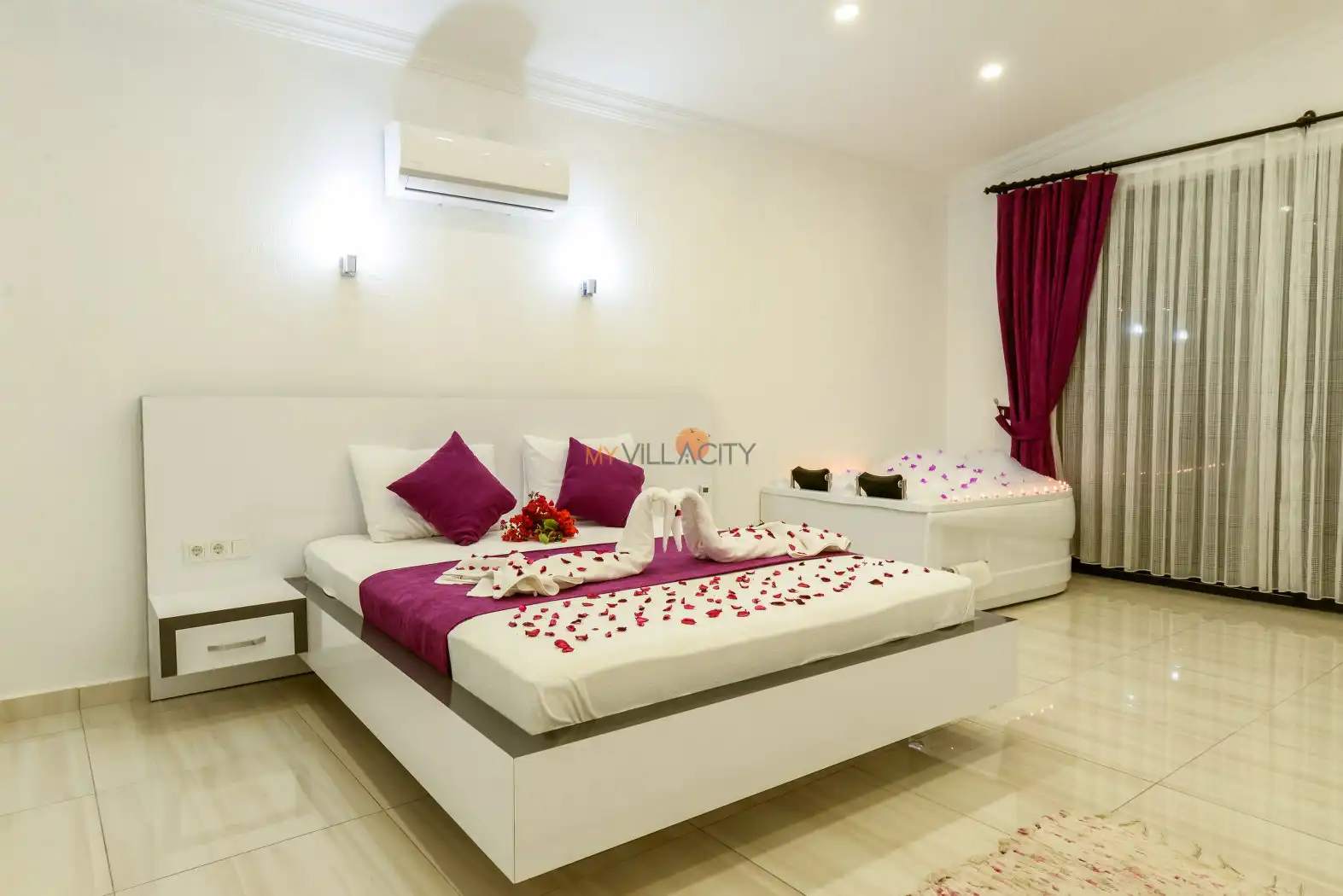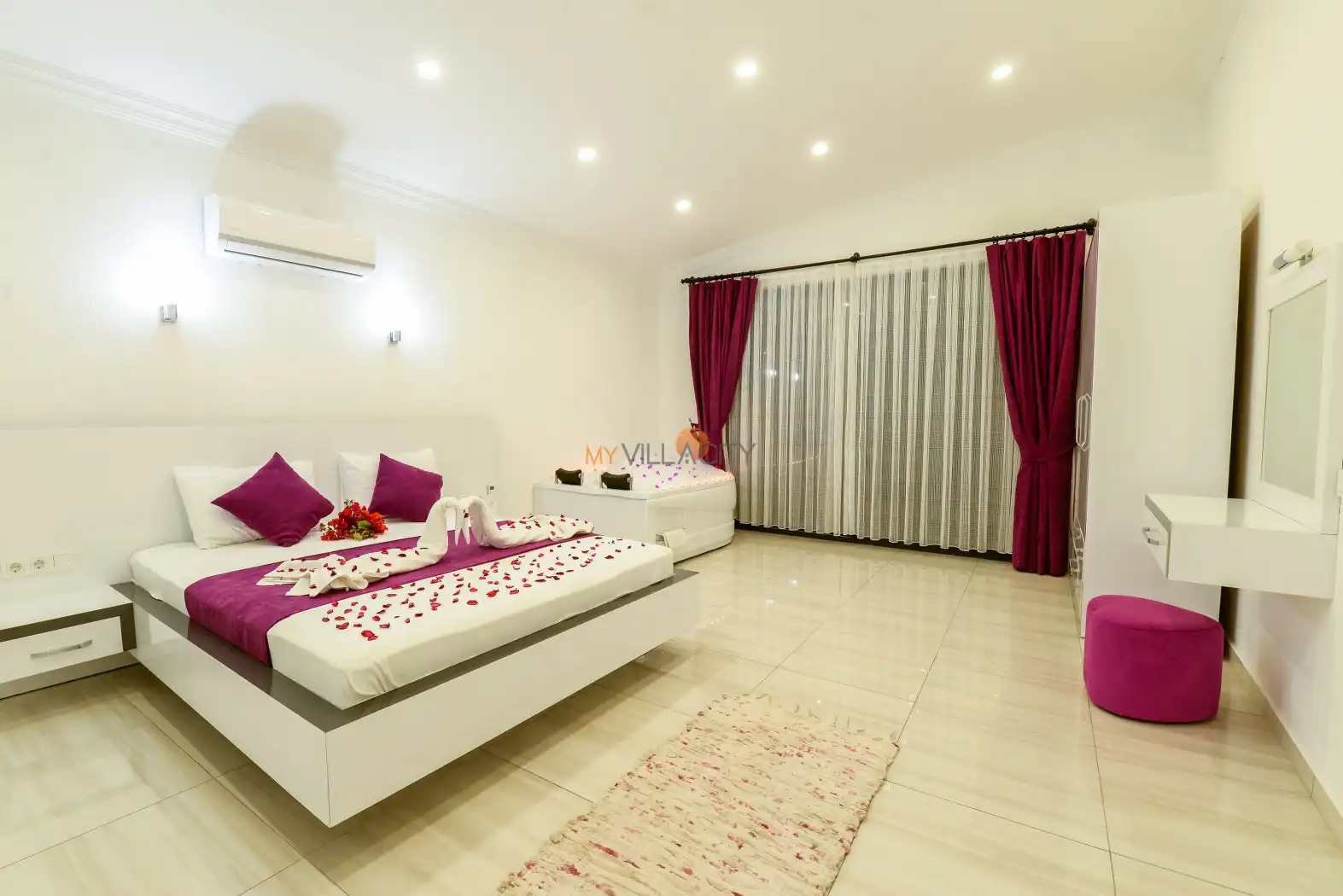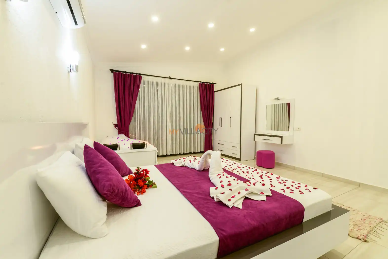 - 1 Çift Kişilik Yatak, 1 Jakuzi, 1 Banyo/WC, 2 Komodin, Elbise dolabı, Makyaj Masası, Klima,