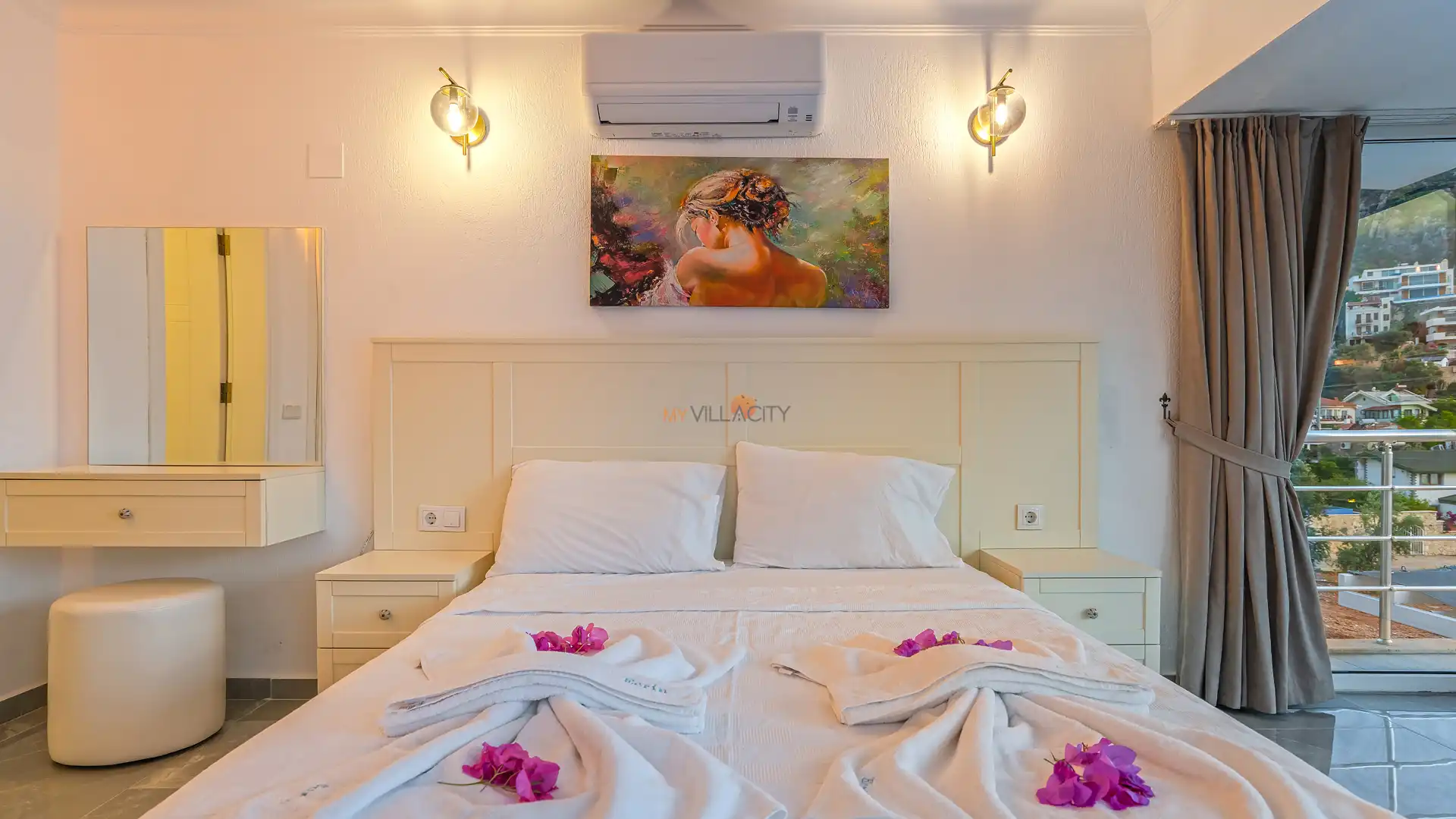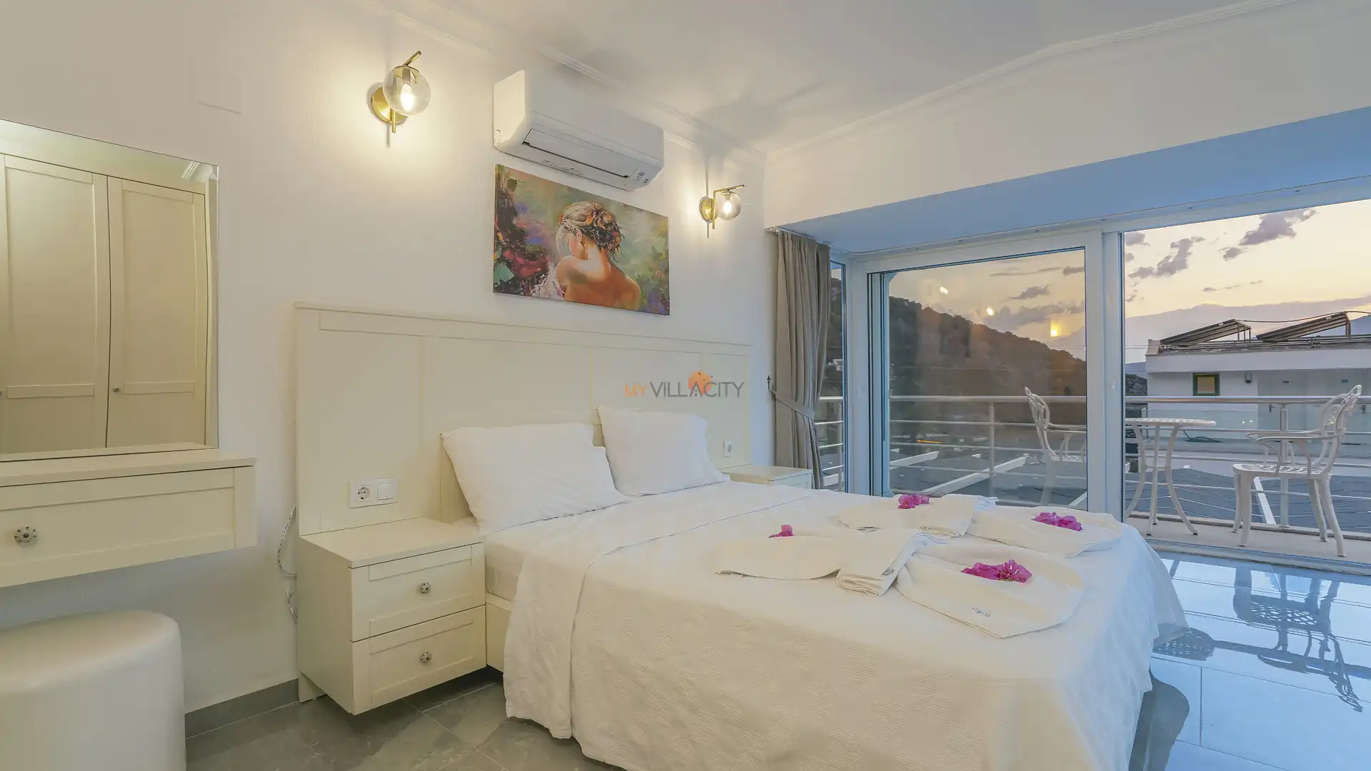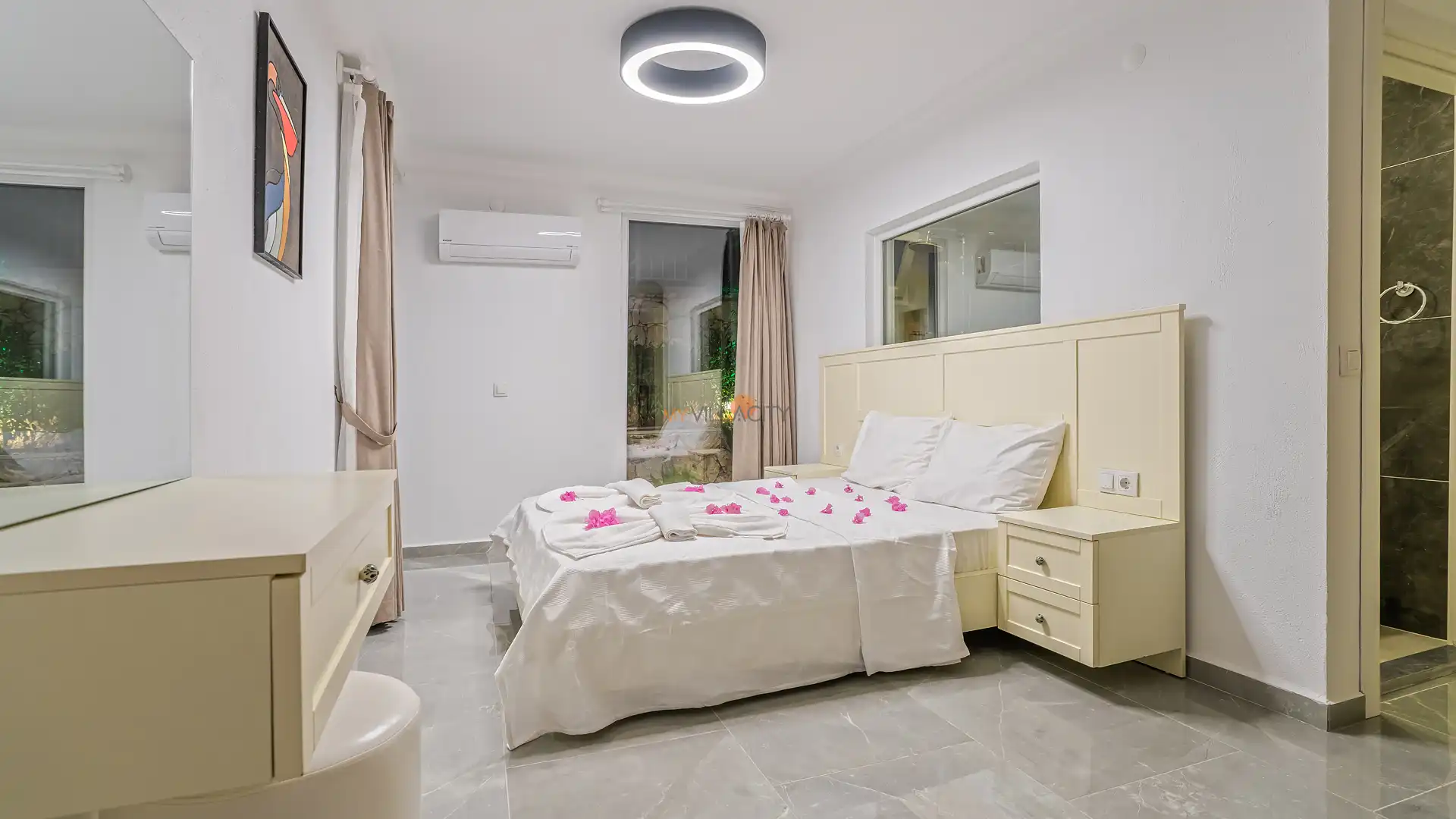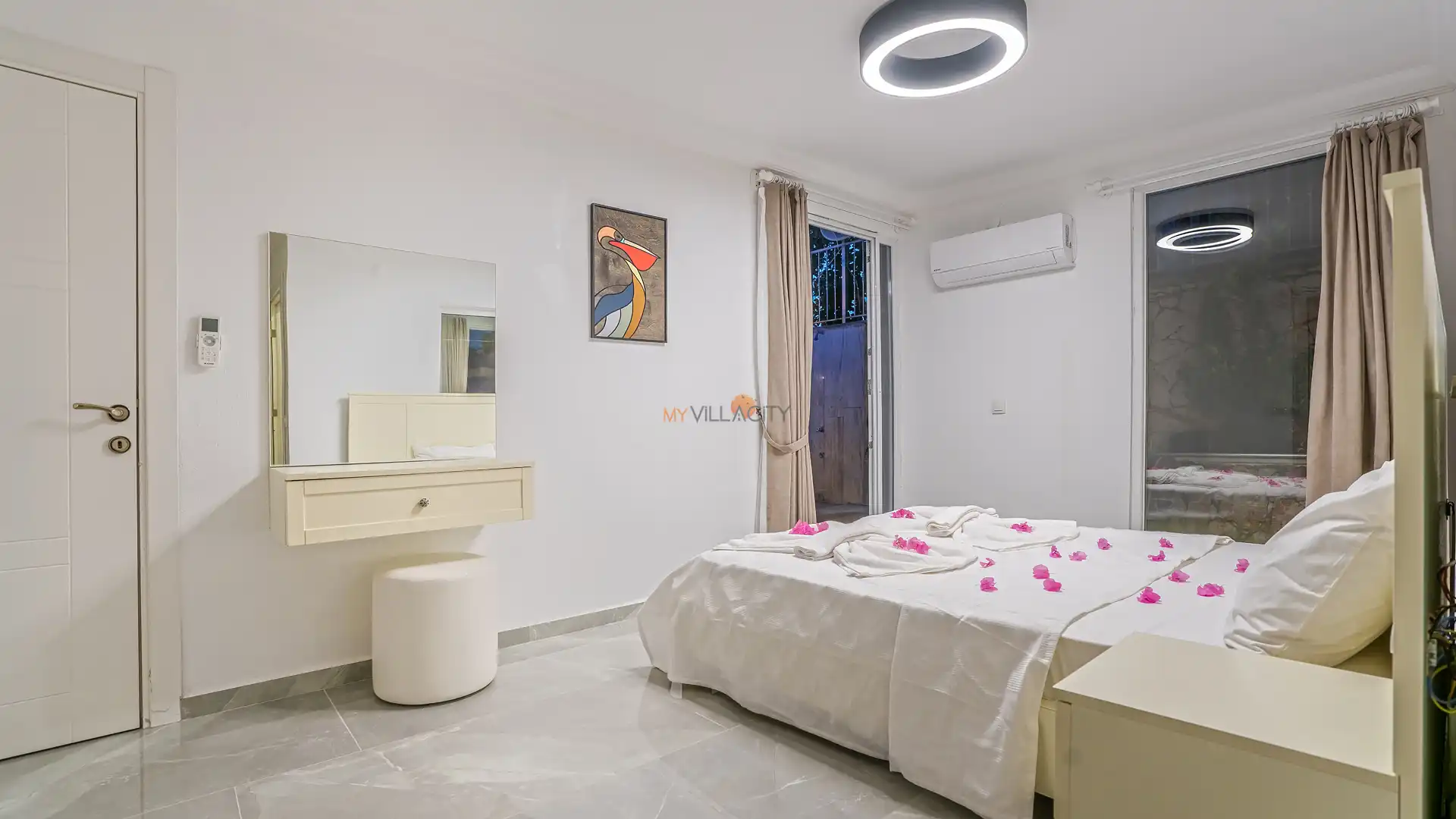 - 1 Çift Kişilik Yatak, 1 Banyo/WC, 2 Komodin, Elbise dolabı, Makyaj Masası, Klima,