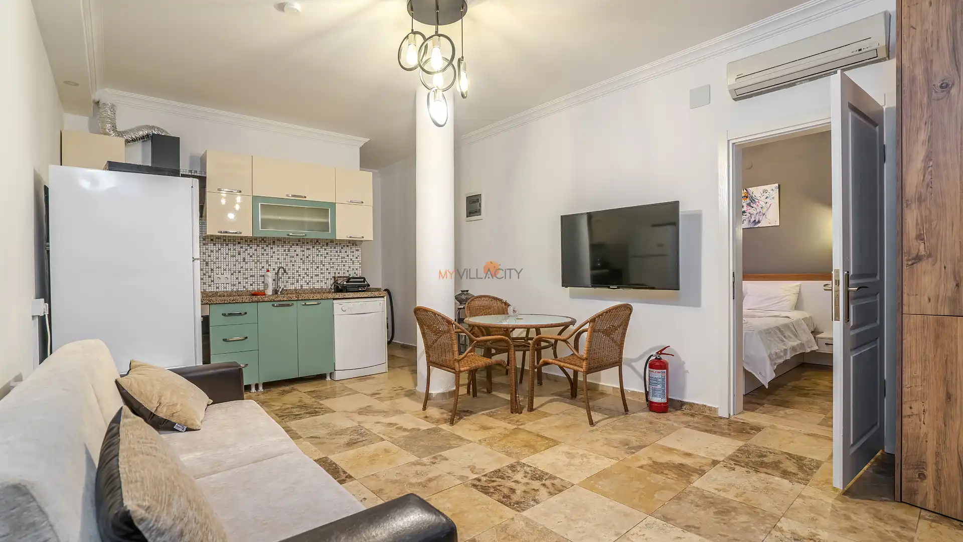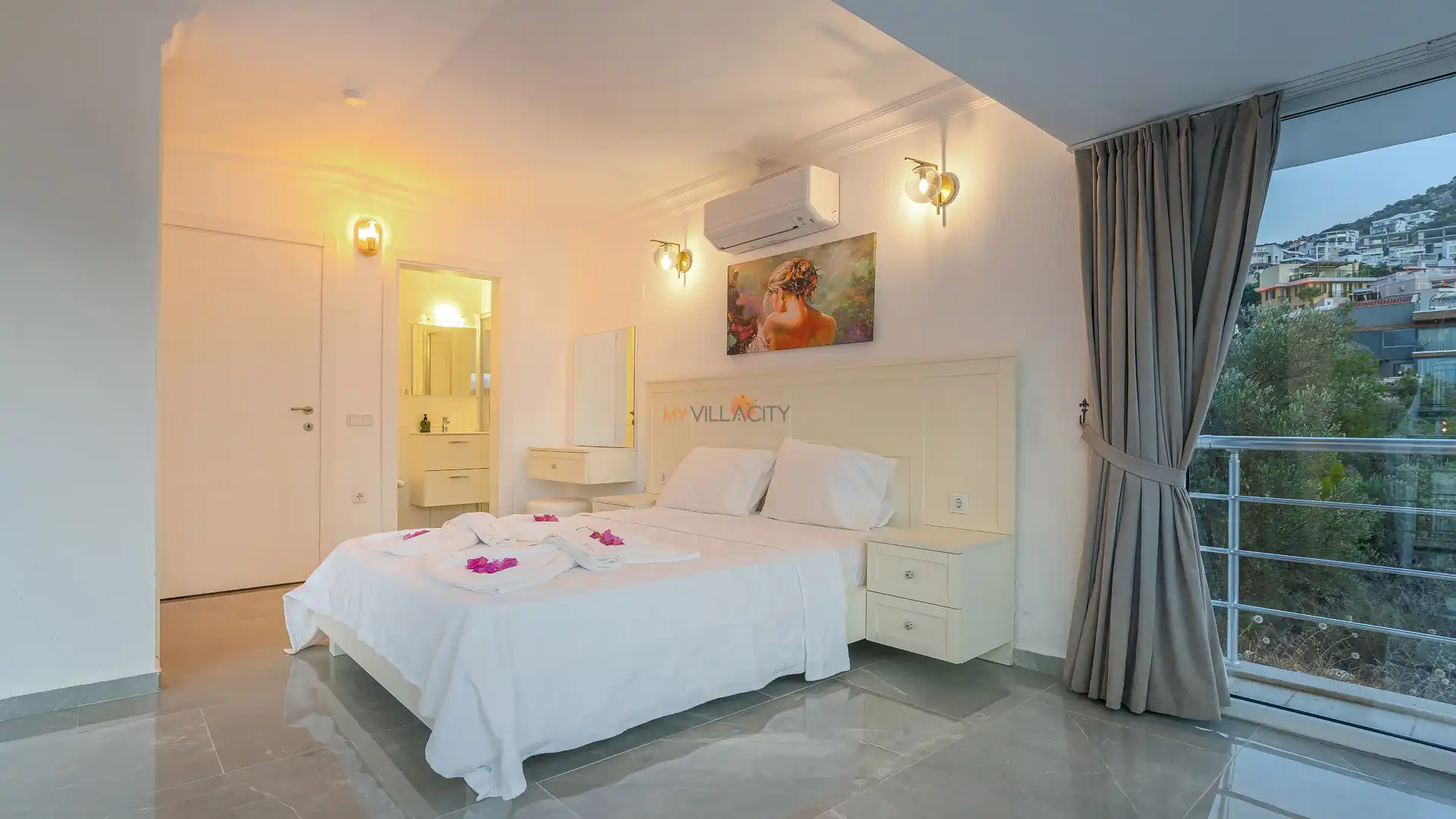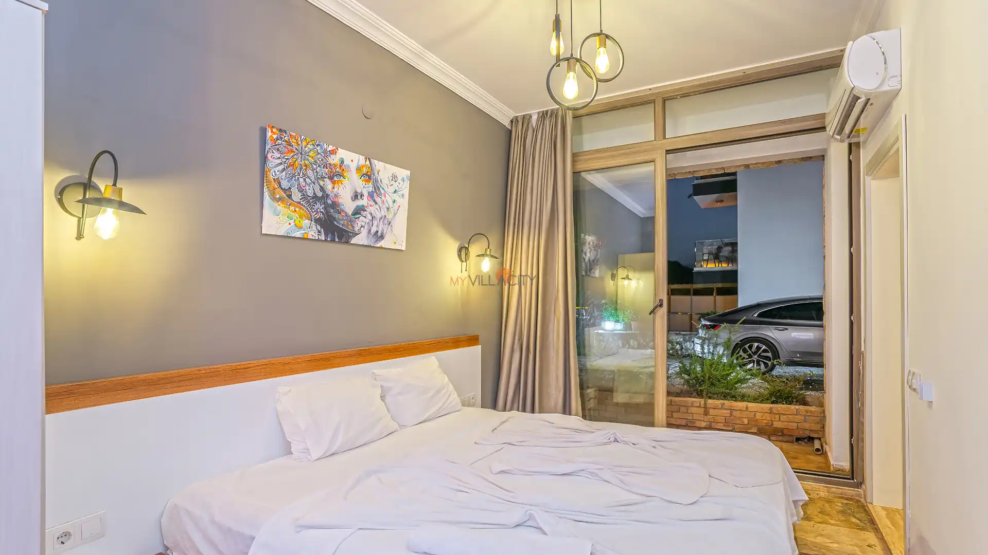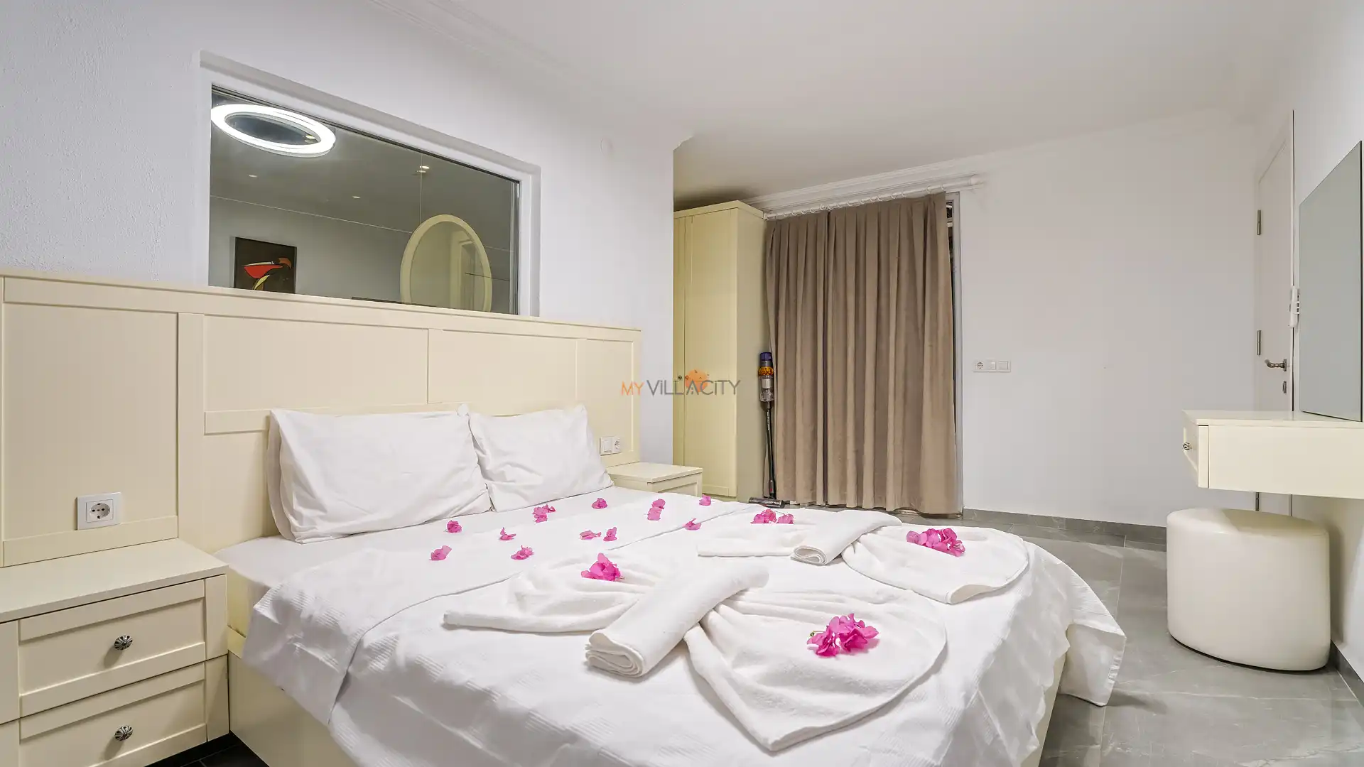 - 1 Çift Kişilik Yatak, 1 Banyo/WC, 2 Komodin, Elbise dolabı, Makyaj Masası, Klima,
