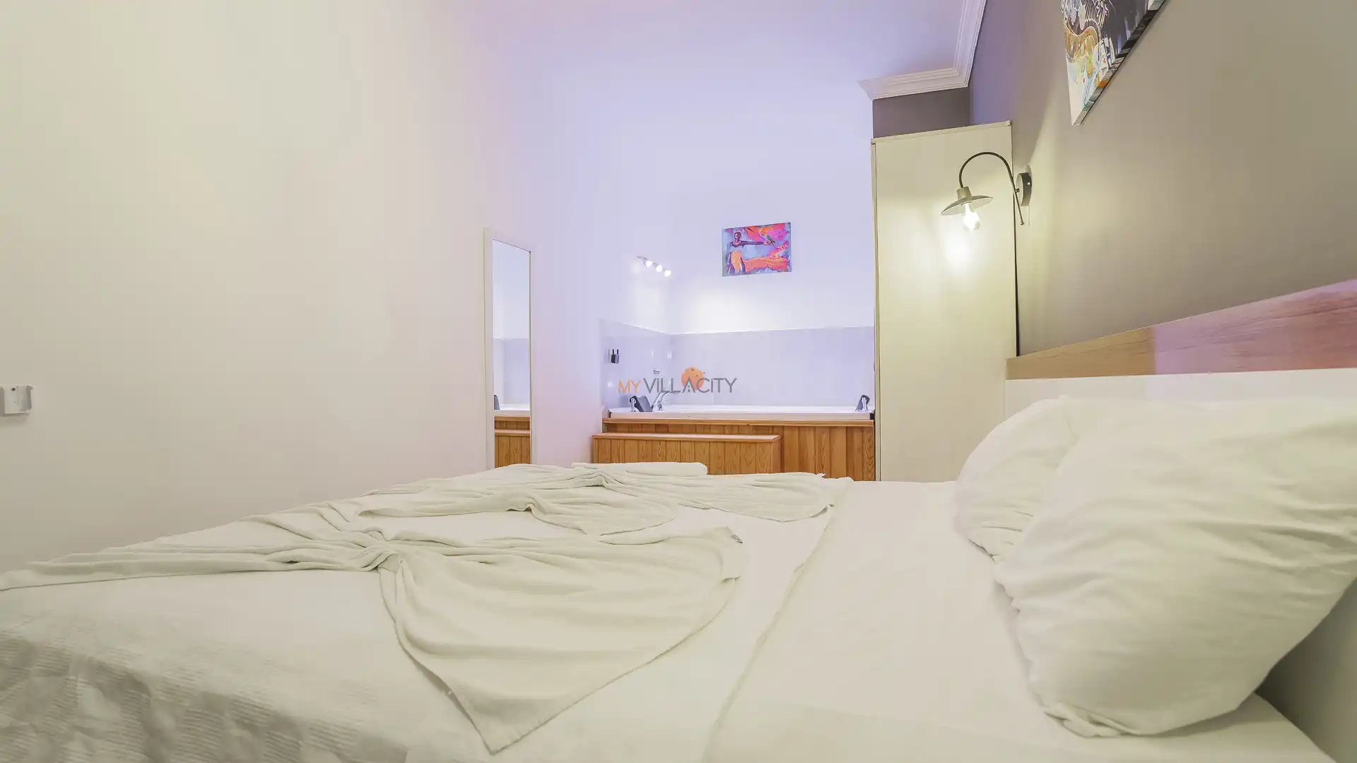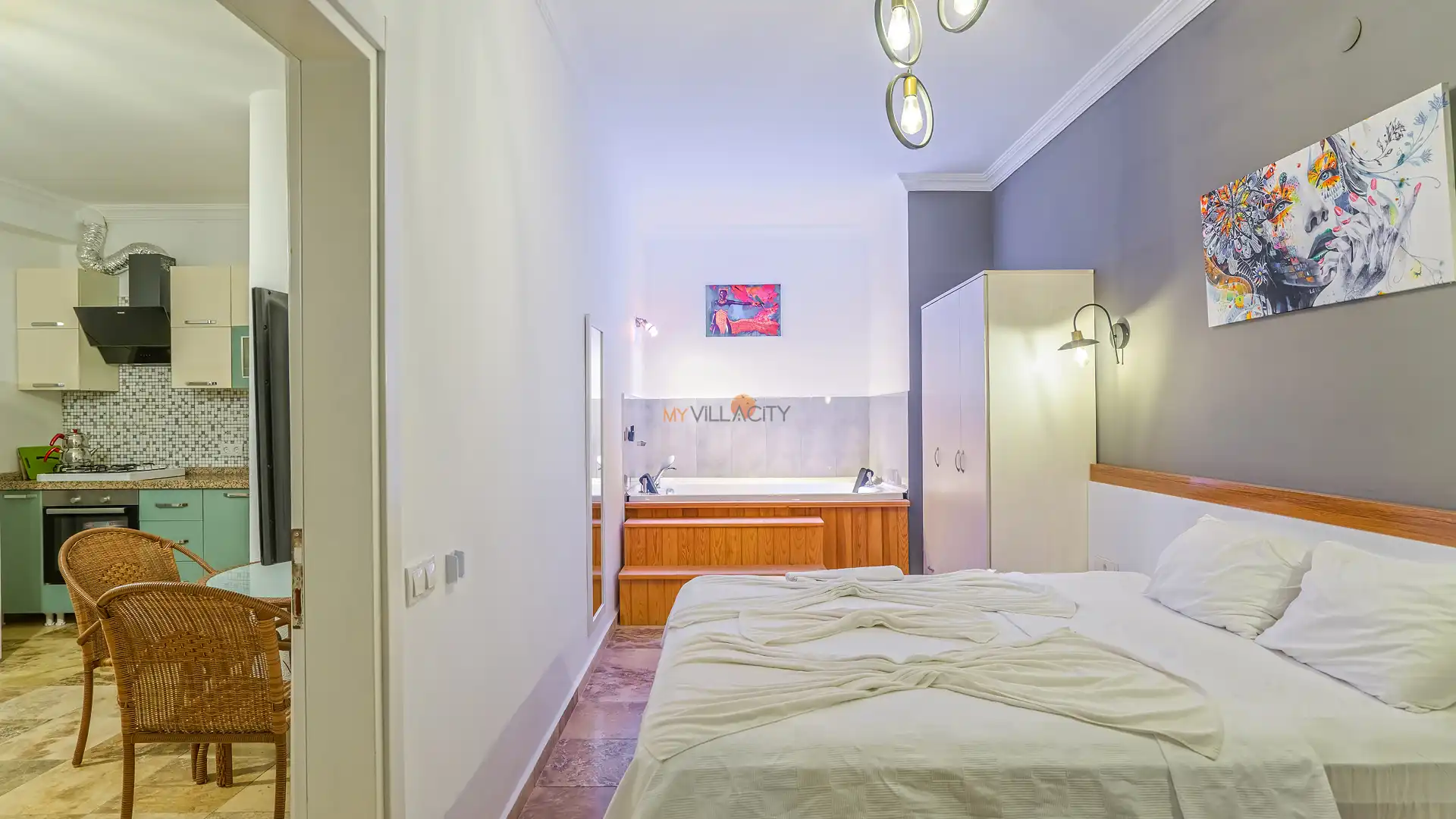 - 1 Çift Kişilik Yatak, 1 Jakuzi, 1 Banyo/WC, 2 Komodin, Elbise dolabı, Makyaj Masası, Klima,