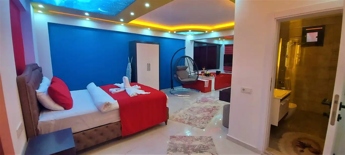 - 1 Çift Kişilik Yatak, 1 Jakuzi, Sauna, 1 Banyo/WC, Elbise dolabı, Makyaj Masası, Klima,