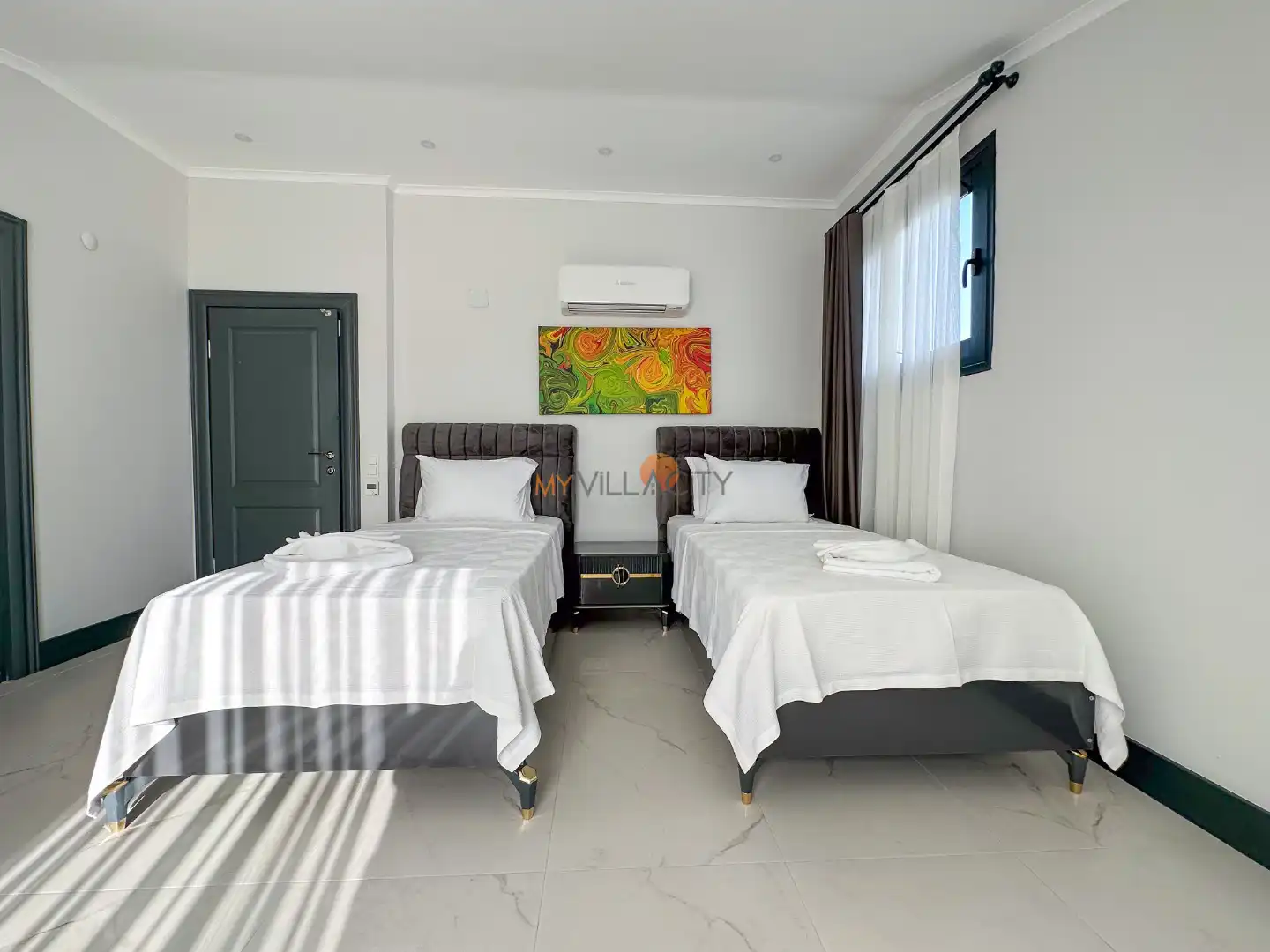- 2 Tek Kişilik Yatak, 1 Banyo/WC, 2 Komodin, Elbise dolabı, Makyaj Masası, Klima,