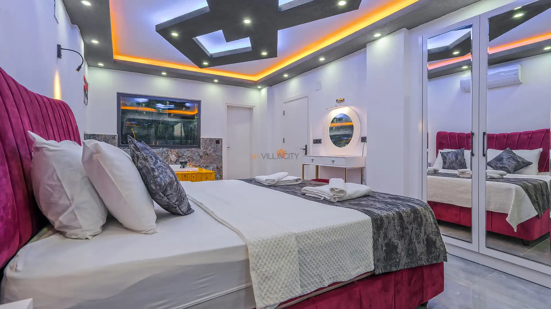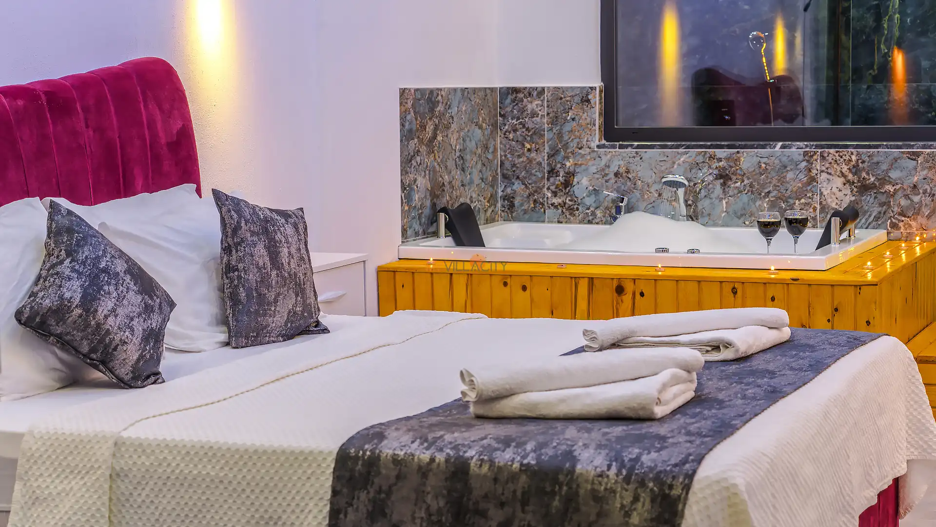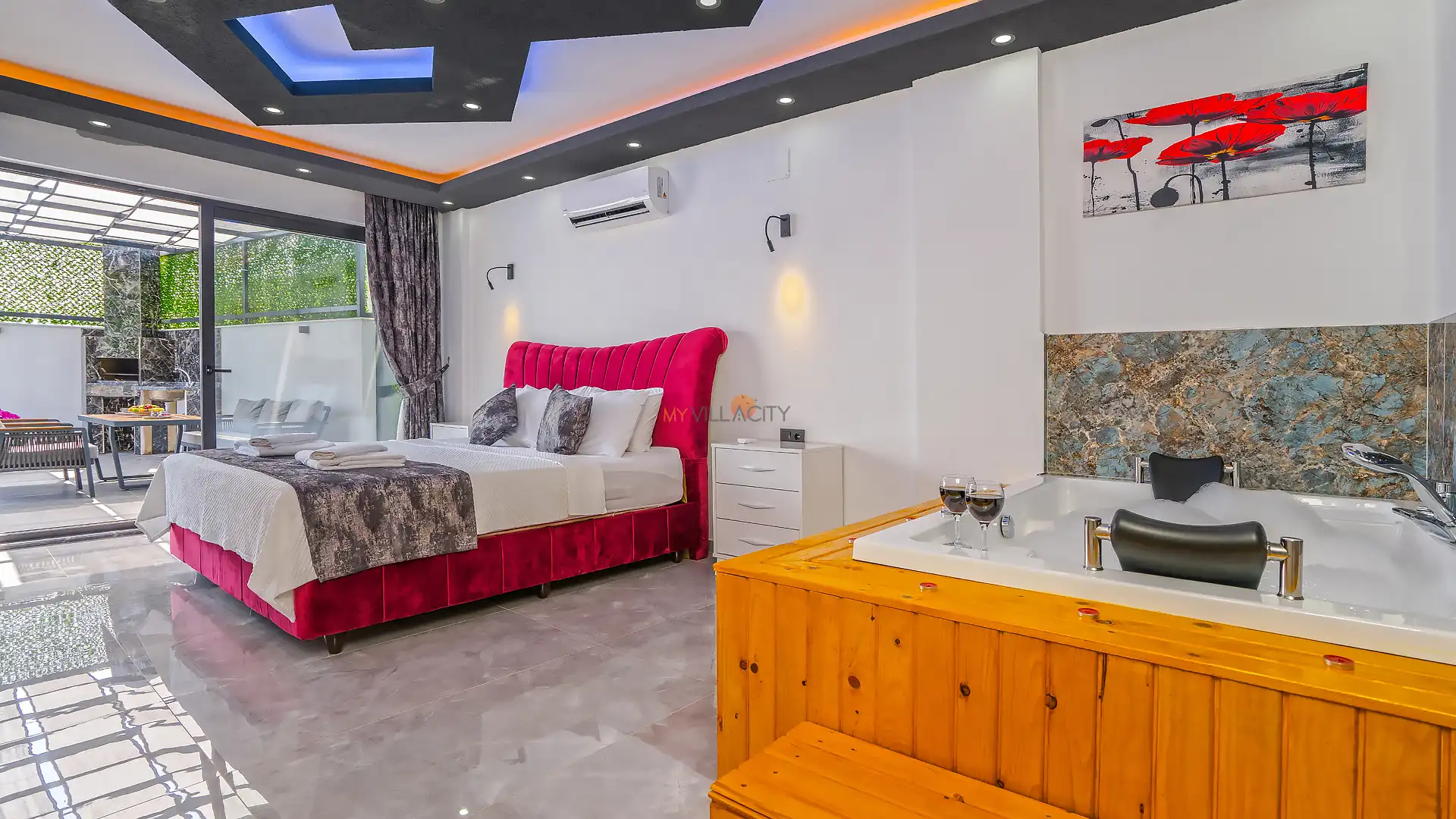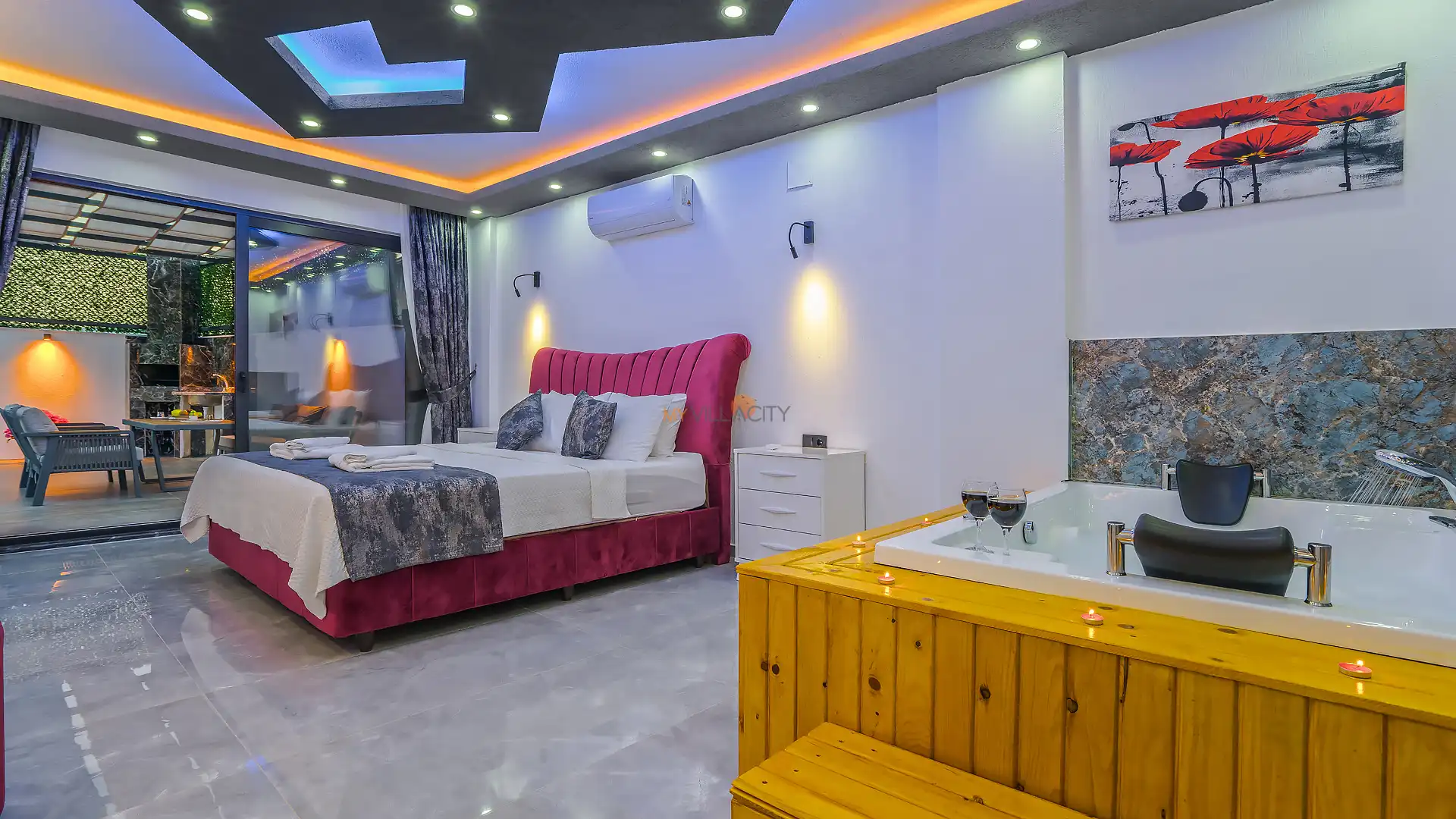 - 1 Çift Kişilik Yatak, 1 Jakuzi, 1 Banyo/WC, 2 Komodin, Elbise dolabı, Makyaj Masası, Klima,