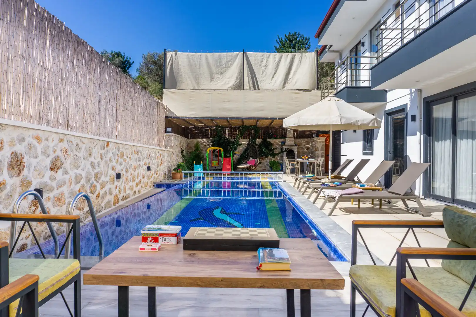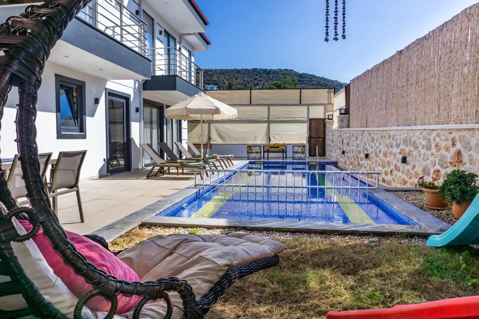 Villa Hanedan Uno, Kaş Kalkan Bölgesinde yer alan muhteşem bir tatil villasıdır. Bu villa, 2 yatak odası ve 4 kişilik kapasiteye sahiptir. Özellikle muhafazakar aileler ve geniş aileler için ideal bir seçenektir. Havuz alanı tamamen korunaklıdır ve misafirlerin mahremiyetine önem verilmektedir. Yatak odasında özel banyo ve tuvalet bulunmaktadır.Ayrıca yatak odalarında jakuzi bulunmaktadır. Villamızın lüks ve konforlu tasarımı göz kamaştırmaktadır. Havuz terasımız oldukça geniştir ve bu alanda keyifli vakit geçirebilirsiniz.Modern mobilyaları,şık dekarasyonu,modern ile ön plana çıkmaktadır. İhtiyaç duyabileceğiniz tüm temel araç ve gereçler villada mevcuttur. Doğayla iç içe, sakin ve huzurlu bir tatil isteyen misafirlerimiz için mükemmel bir seçimdir.Unutulmaz bir tatil içim Villa Hanedan Uno,tam da bunun için var.