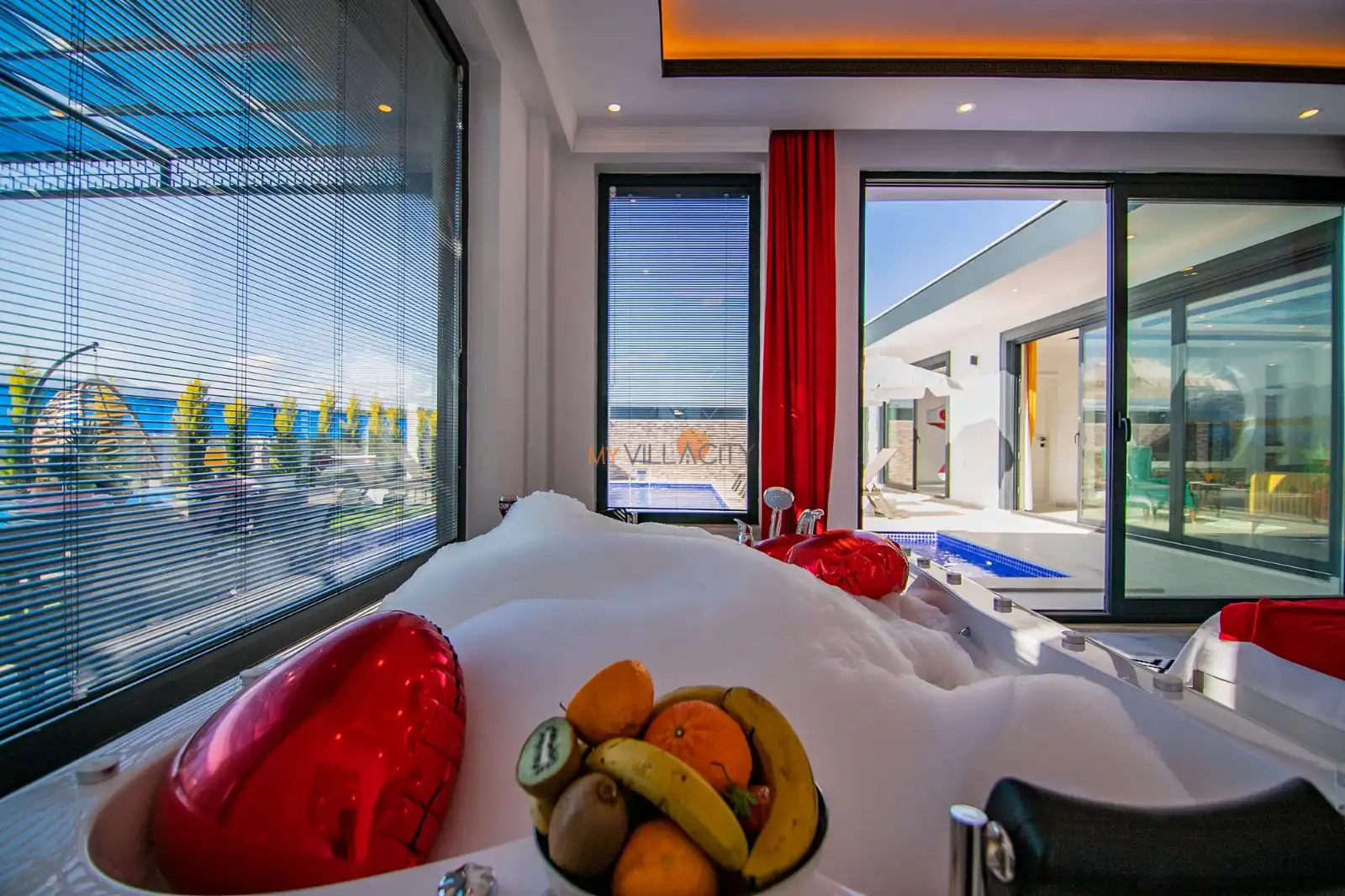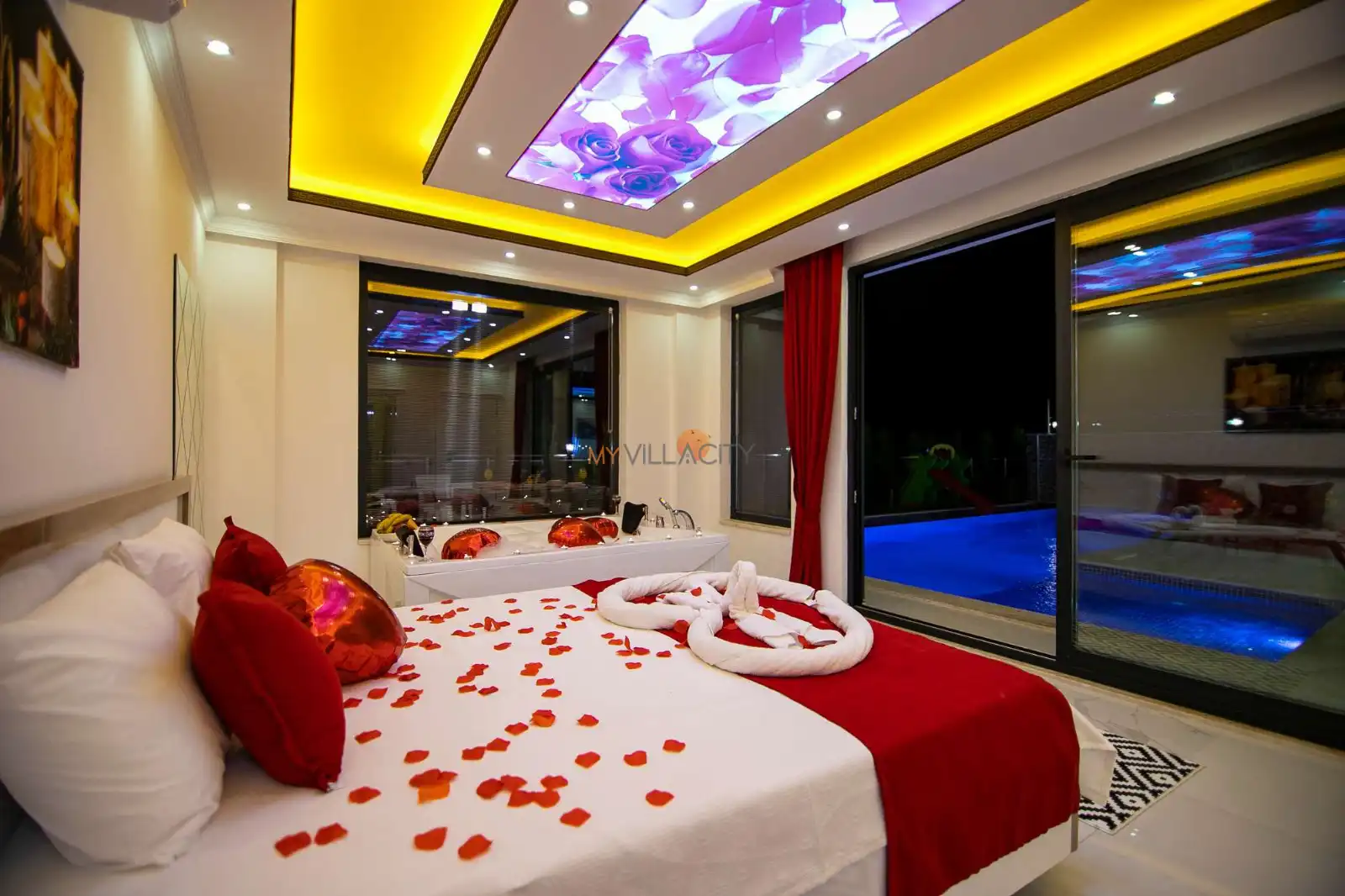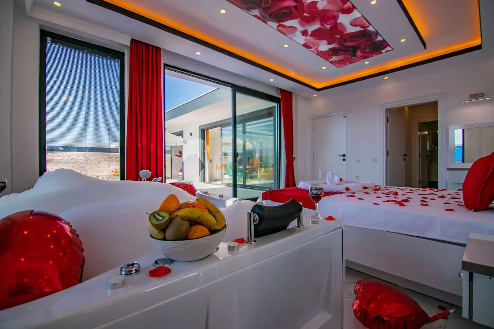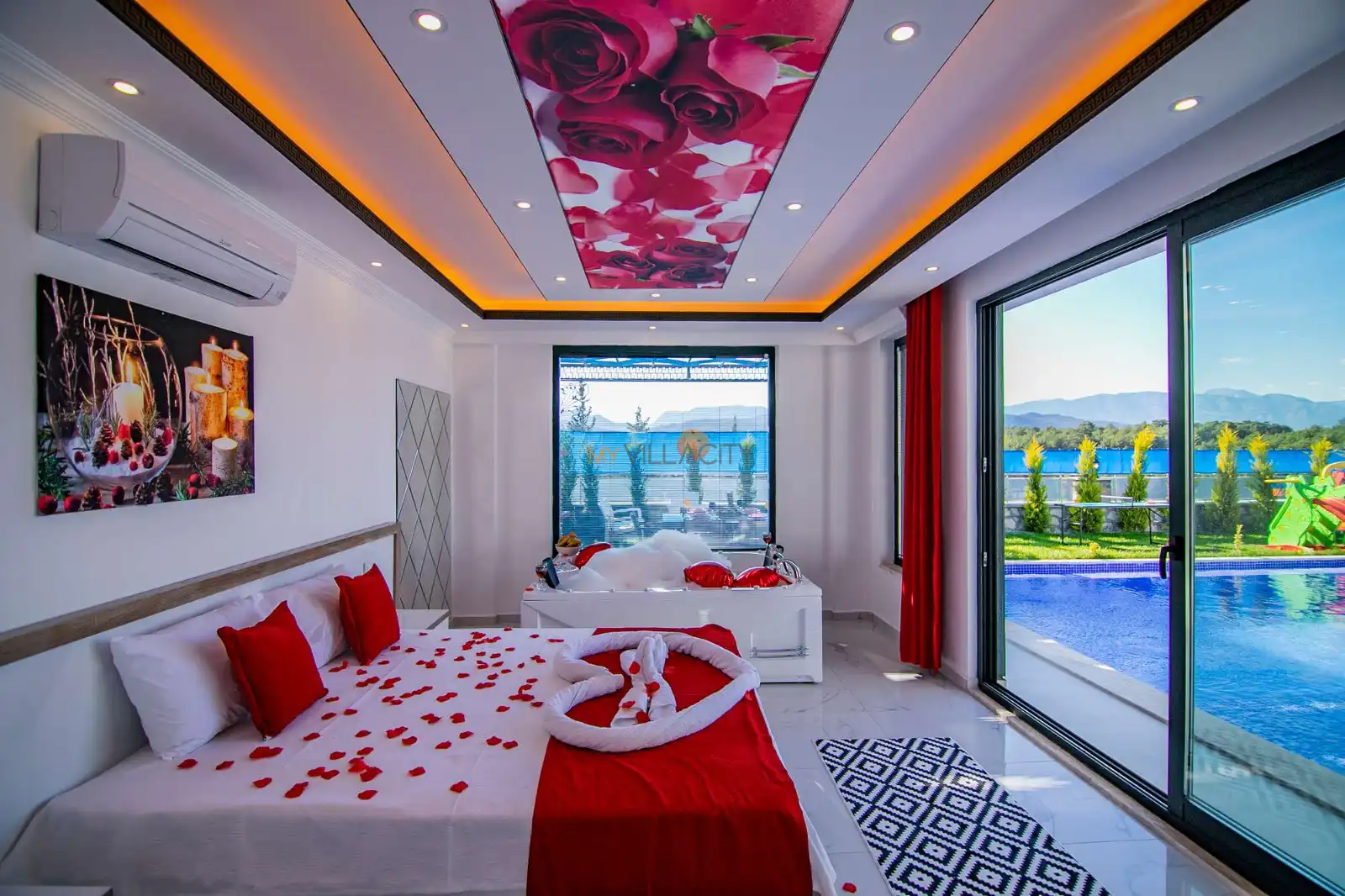 - 1 Çift Kişilik Yatak, 1 Jakuzi, 1 Banyo/WC, 2 Komodin, Elbise dolabı, Makyaj Masası, Klima,