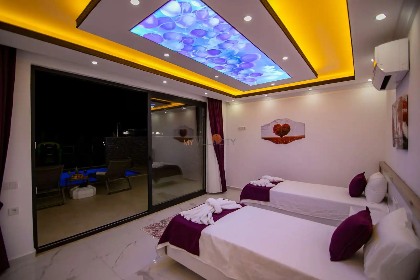 - 2 Tek Kişilik Yatak, 1 Banyo/WC, 2 Komodin, Elbise dolabı, Makyaj Masası, Klima,