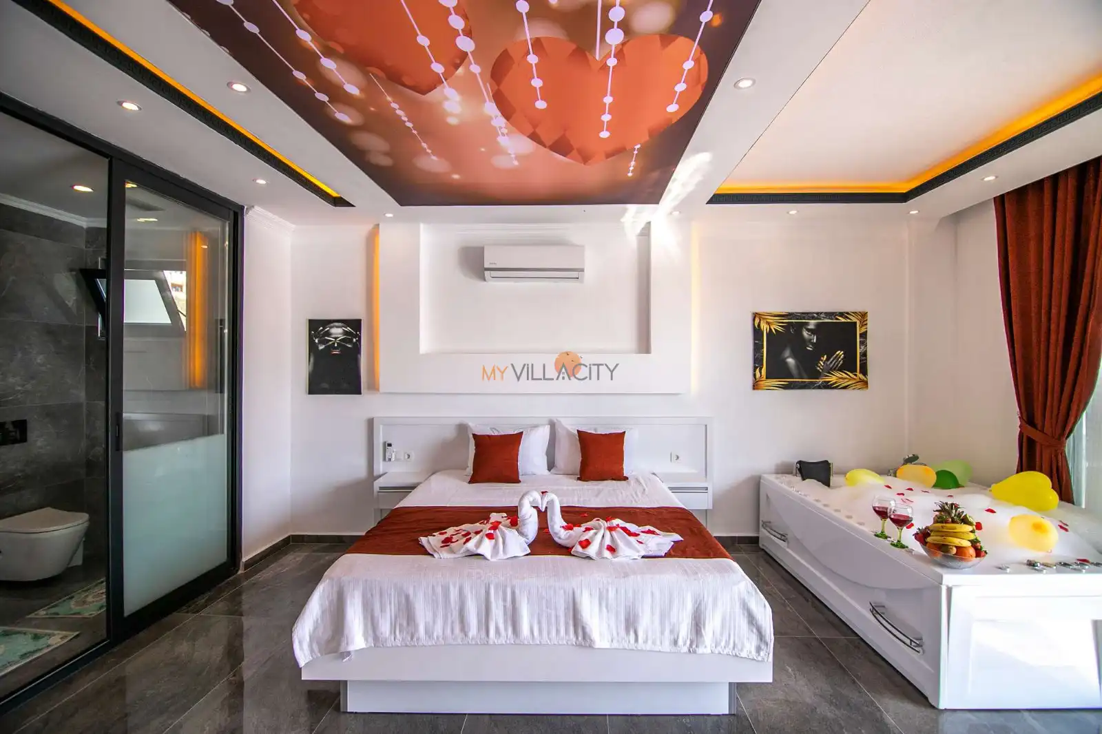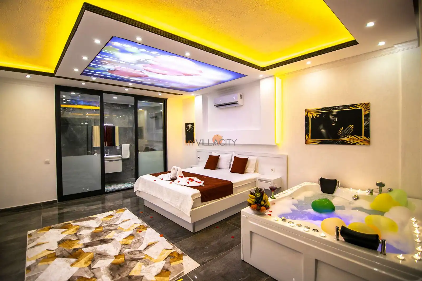 - 1 Çift Kişilik Yatak, 1 Jakuzi, 1 Banyo/WC, 2 Komodin, Elbise dolabı, Makyaj Masası, Klima,