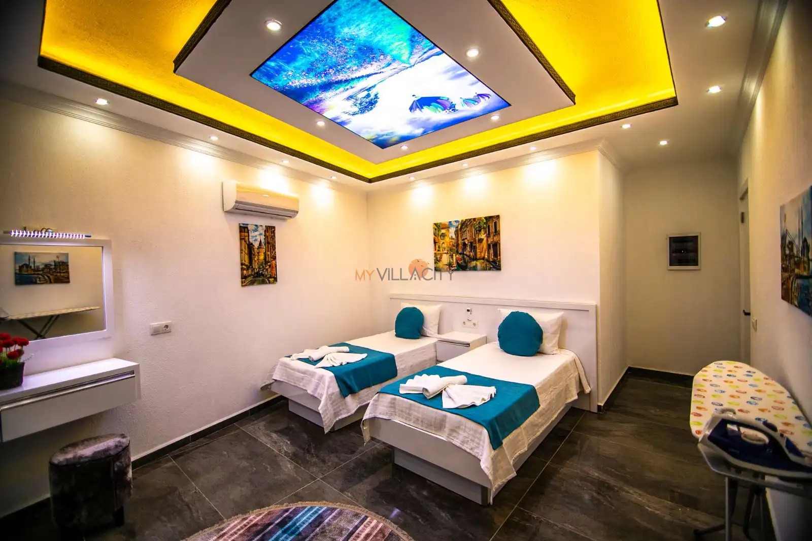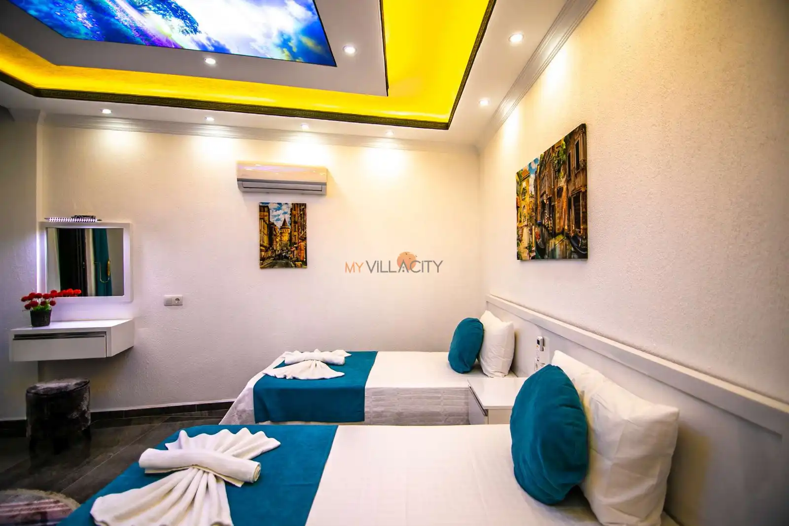 - 2 Tek Kişilik Yatak, 1 Banyo/WC, 2 Komodin, Elbise dolabı, Makyaj Masası, Klima,