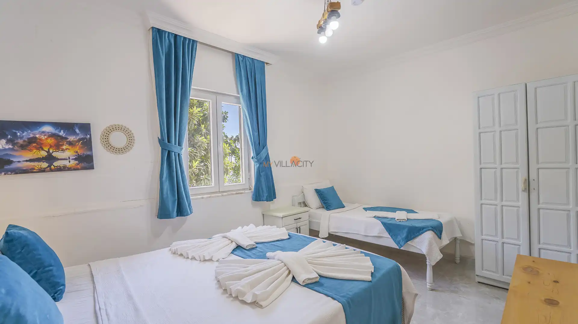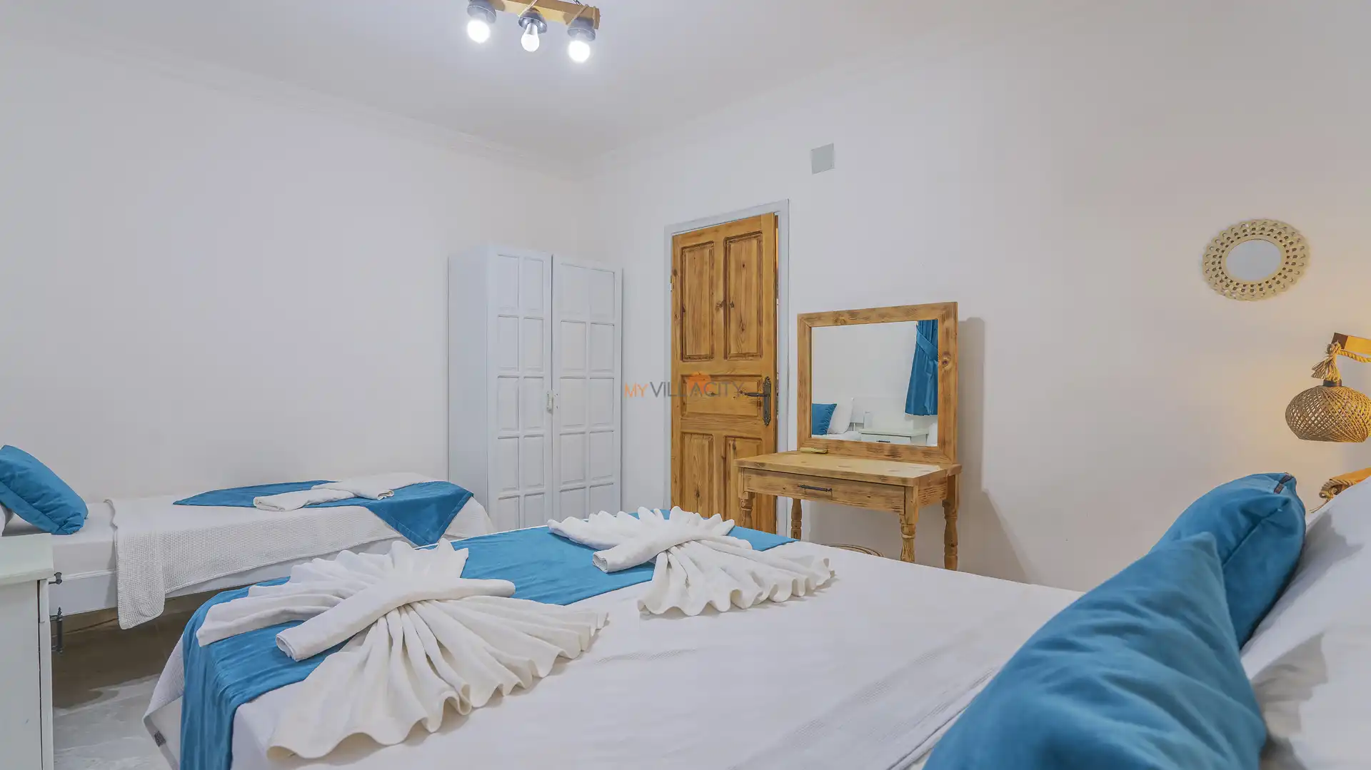 - 2 Tek Kişilik Yatak, 1 Çift Kişilik Yatak, 1 Banyo/WC, 2 Komodin, Elbise dolabı, Makyaj Masası, Klima,