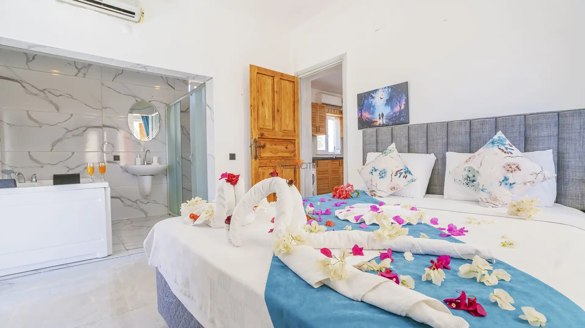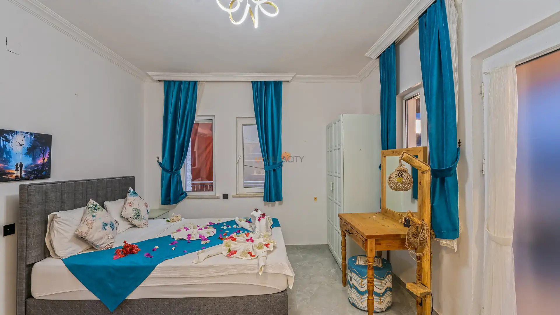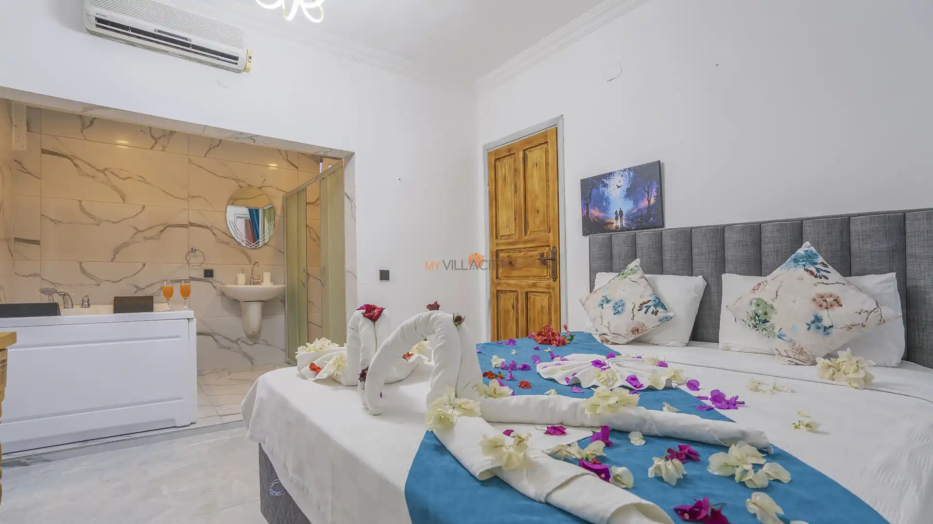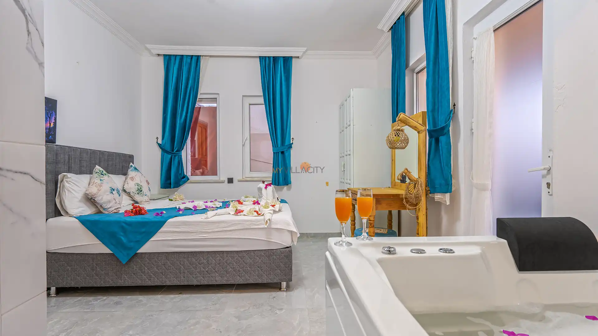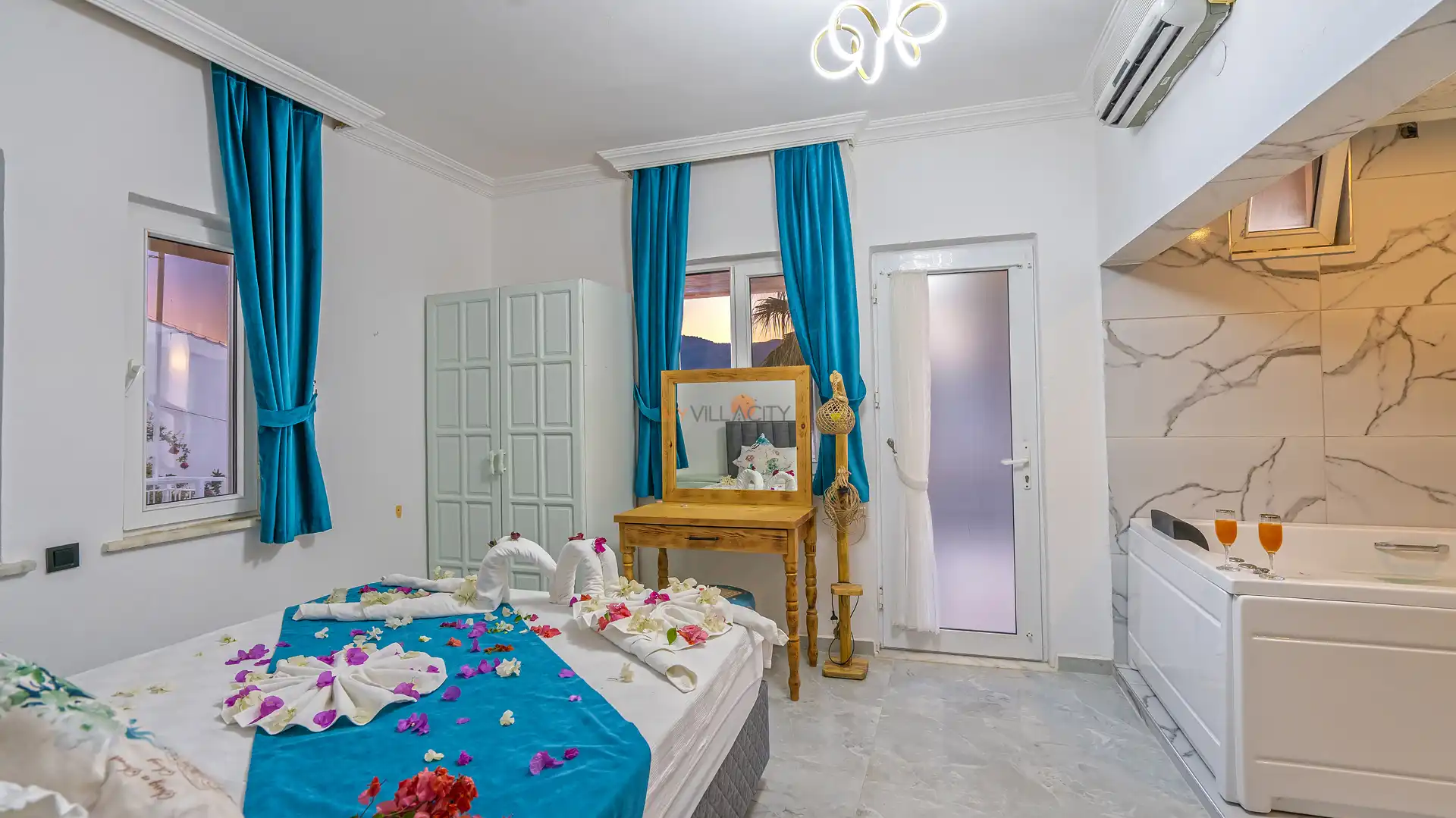 - 1 Çift Kişilik Yatak, 1 Jakuzi, 1 Banyo/WC, 2 Komodin, Elbise dolabı, Makyaj Masası, Klima,