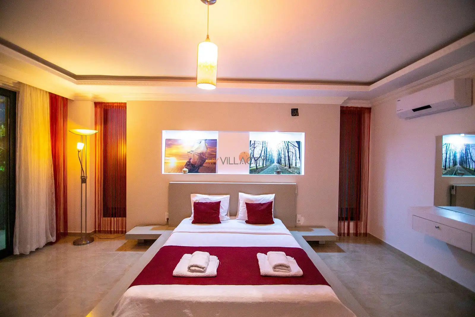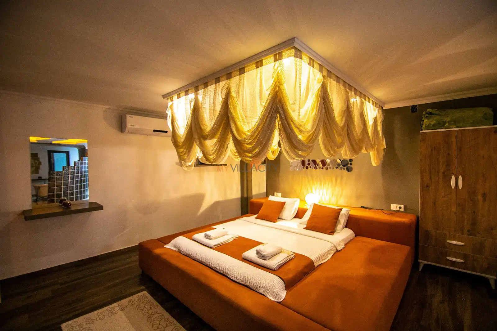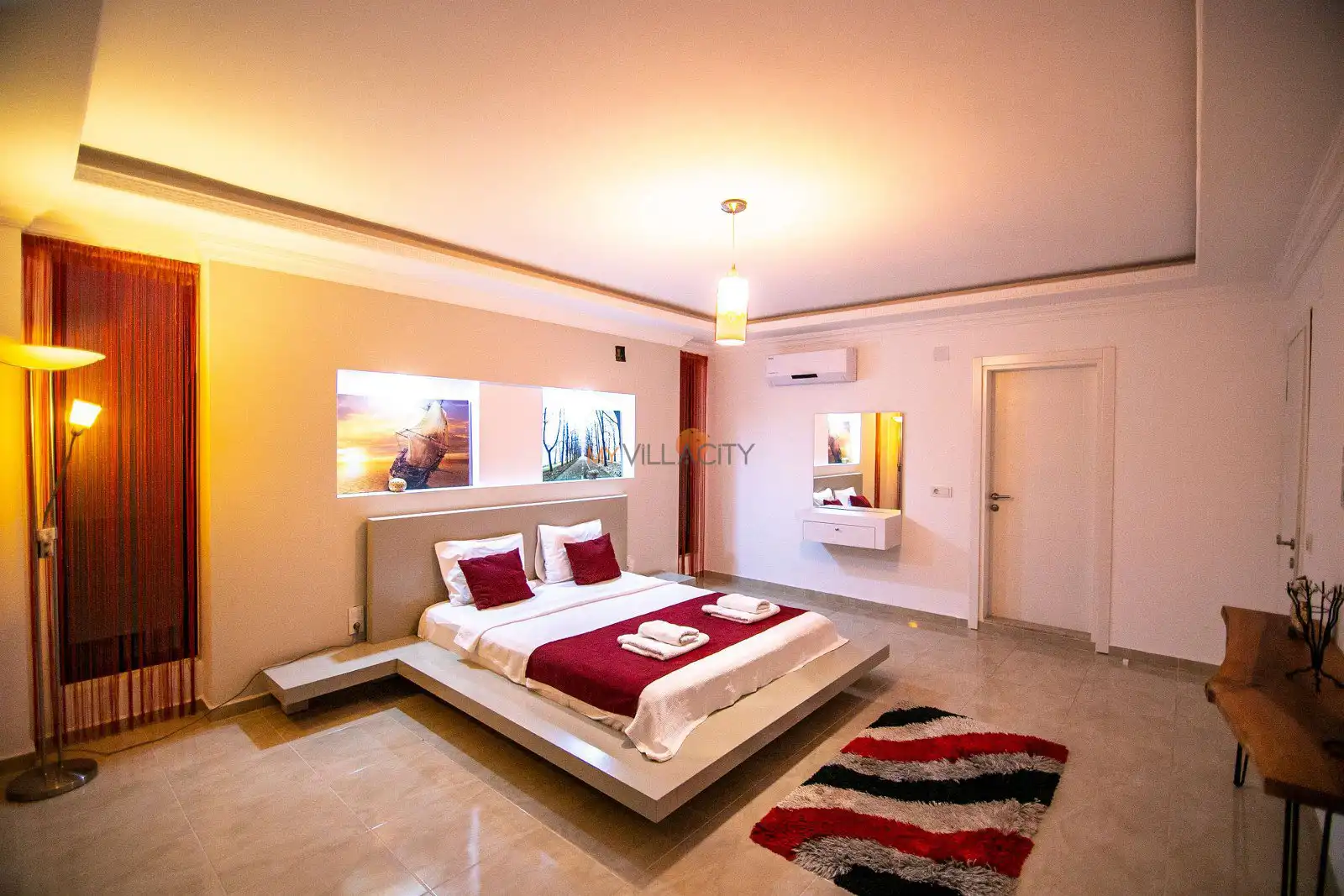 - 1 Çift Kişilik Yatak, 1 Banyo/WC, 2 Komodin, Elbise dolabı, Makyaj Masası, Klima,