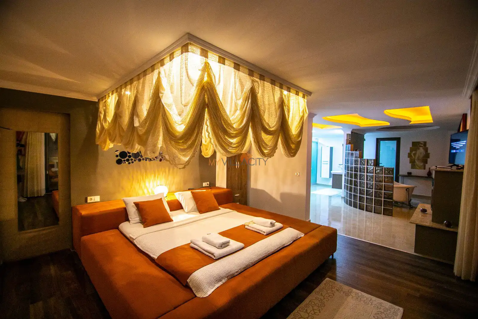 - 1 Çift Kişilik Yatak, 1 Banyo/WC, TV, 2 Komodin, Elbise dolabı, Makyaj Masası, Klima,