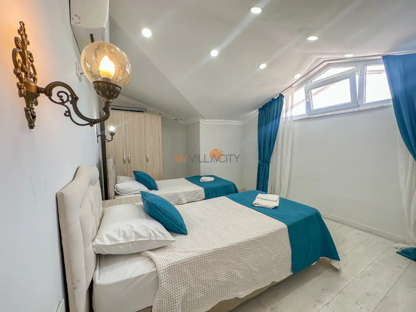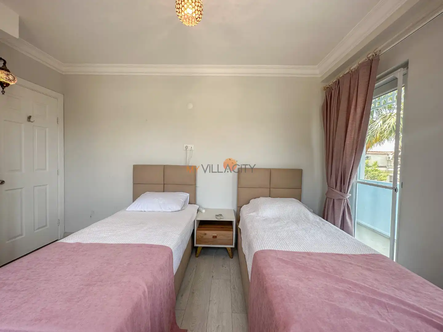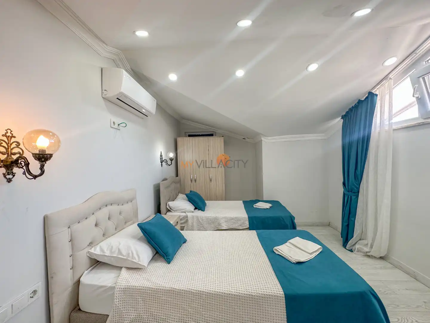 - 2 Tek Kişilik Yatak, 1 Banyo/WC, 2 Komodin, Elbise dolabı, Makyaj Masası, Klima,
